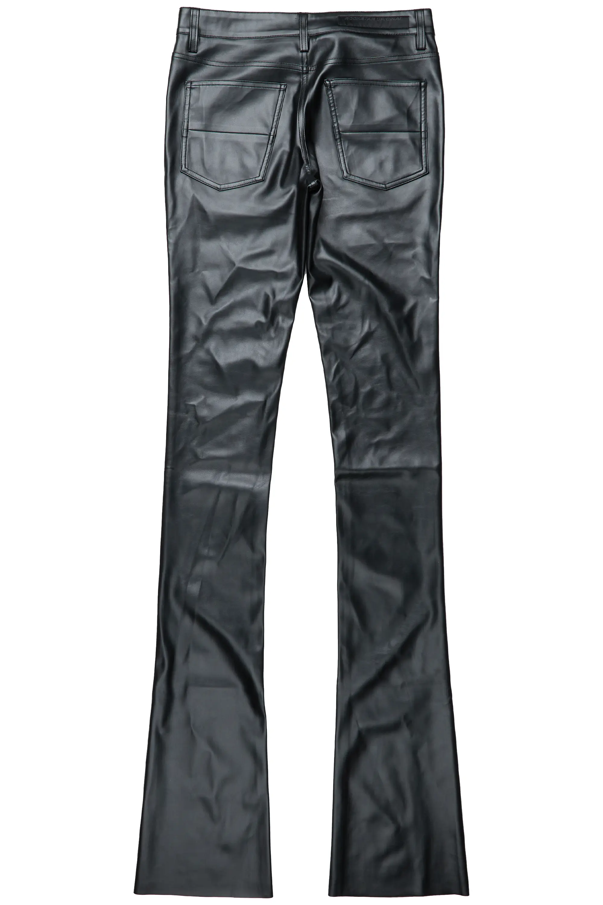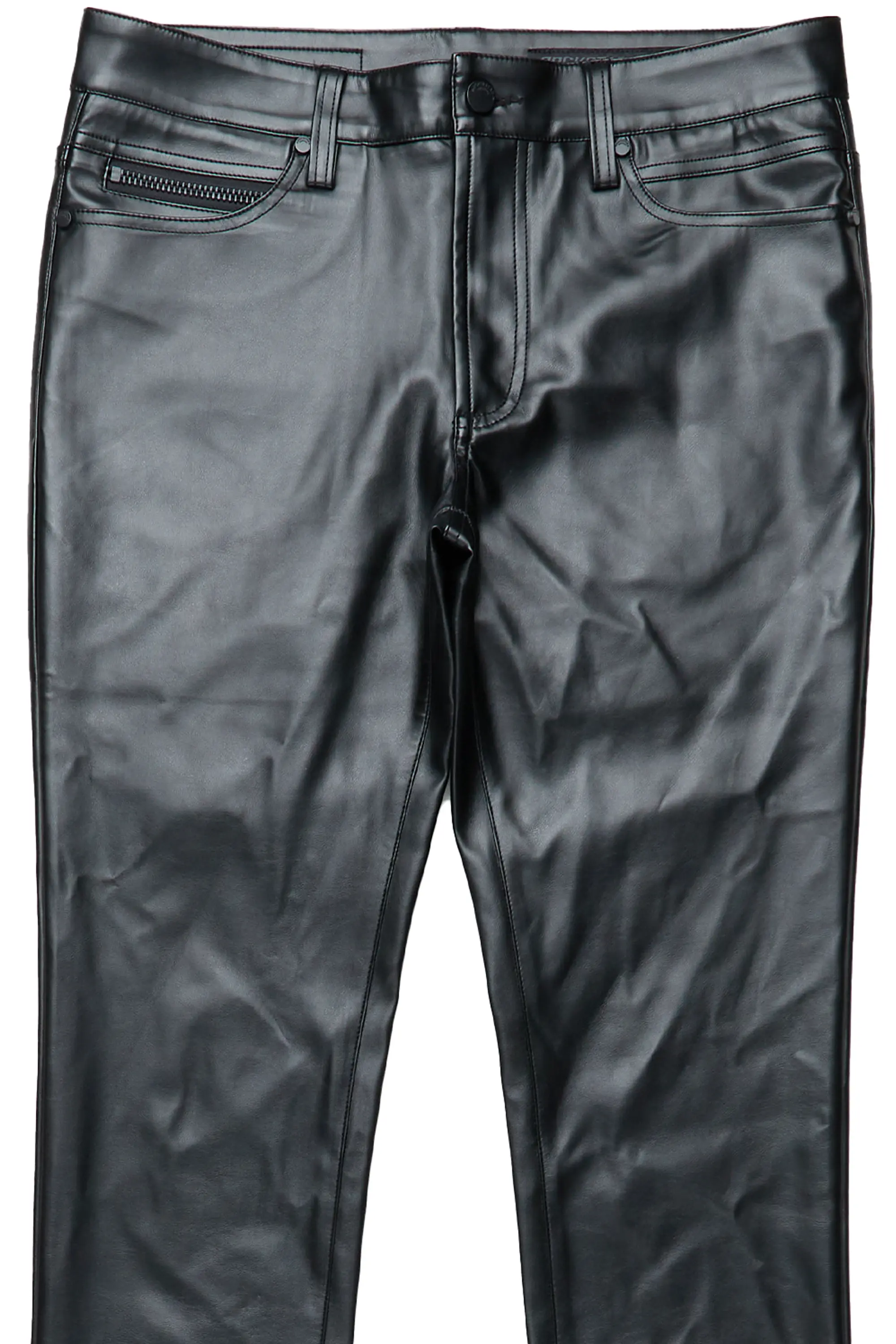 An urban super stack jean for men black. Designed with faux leather fabric and extra long legs for a must-cop streetwear style.
