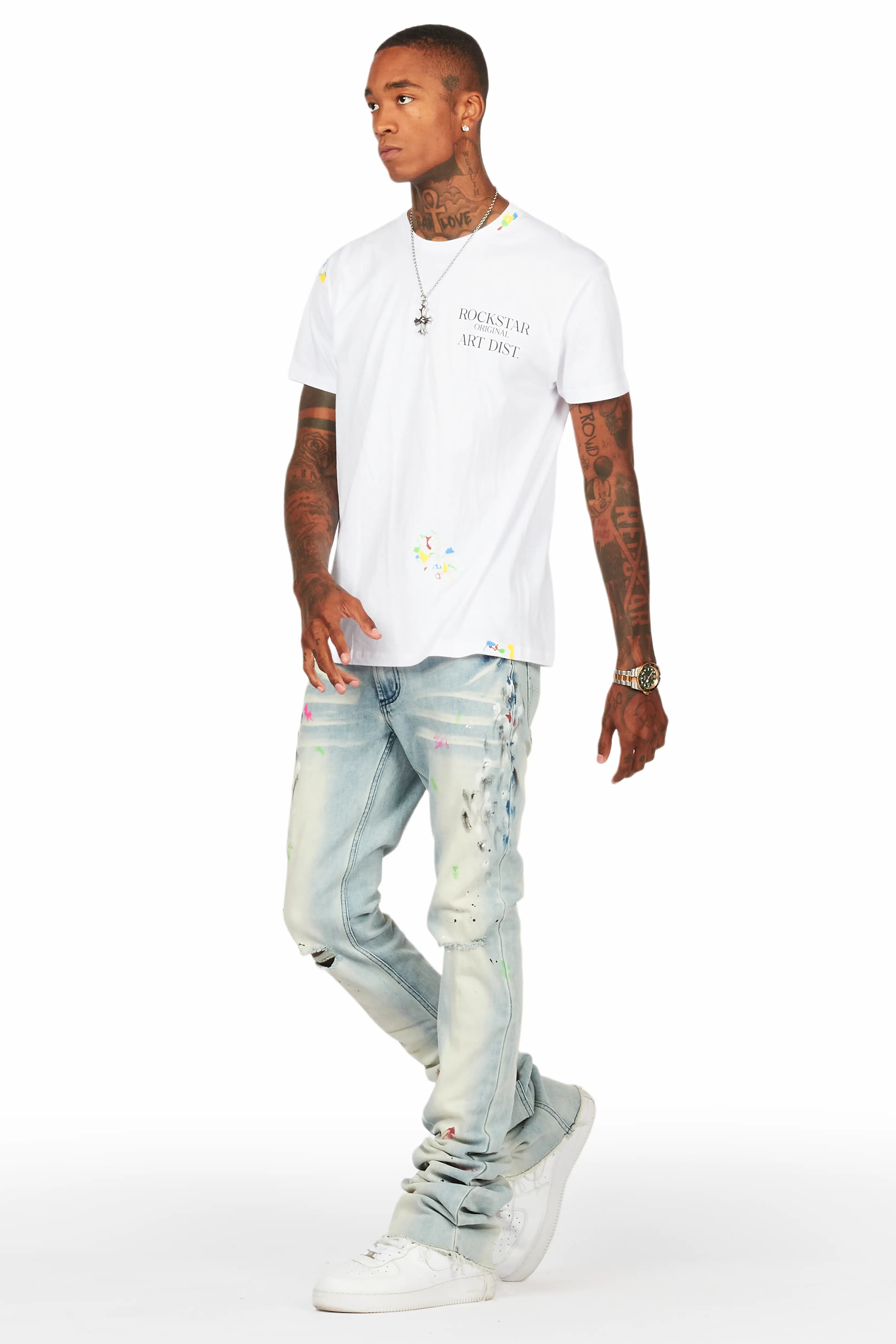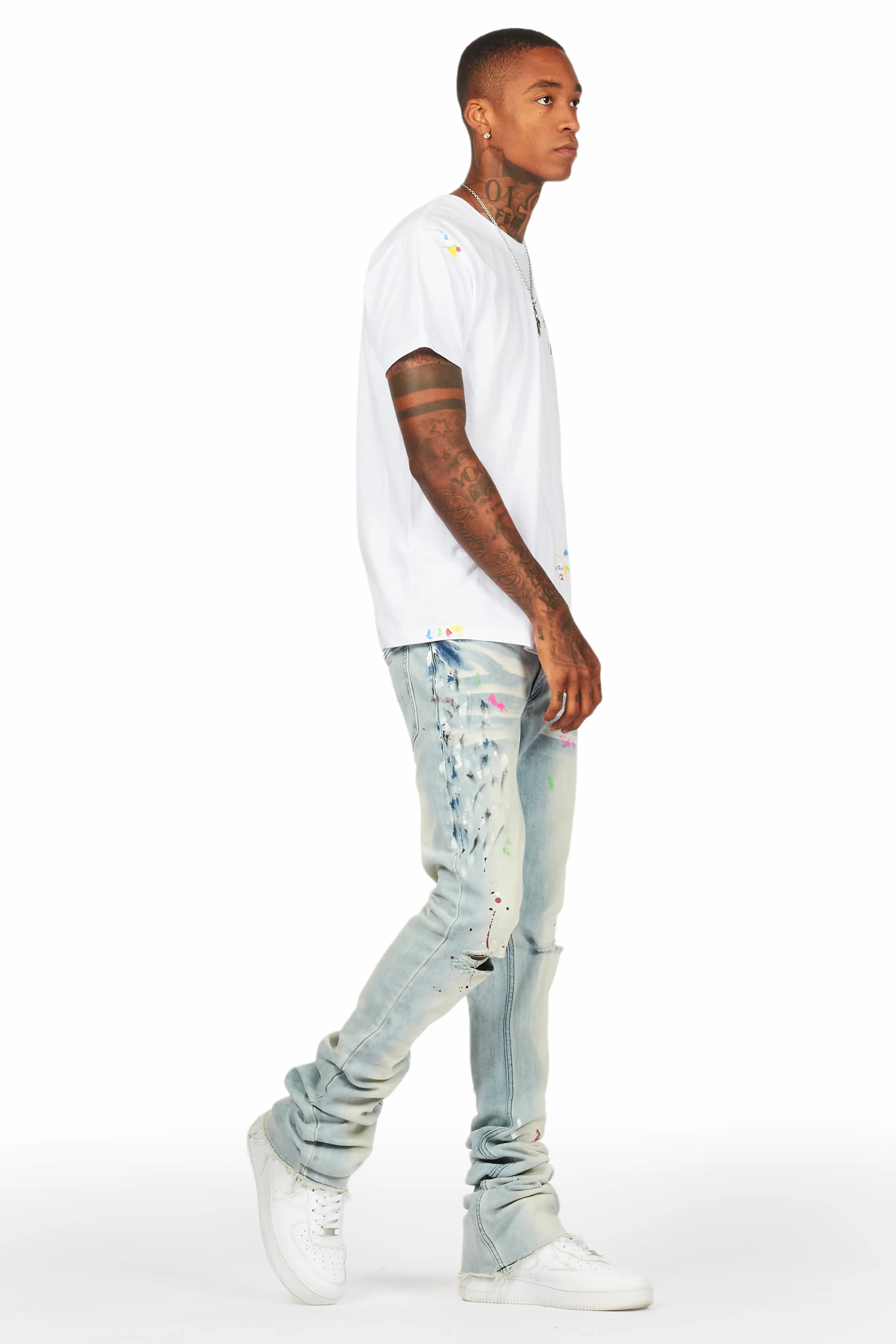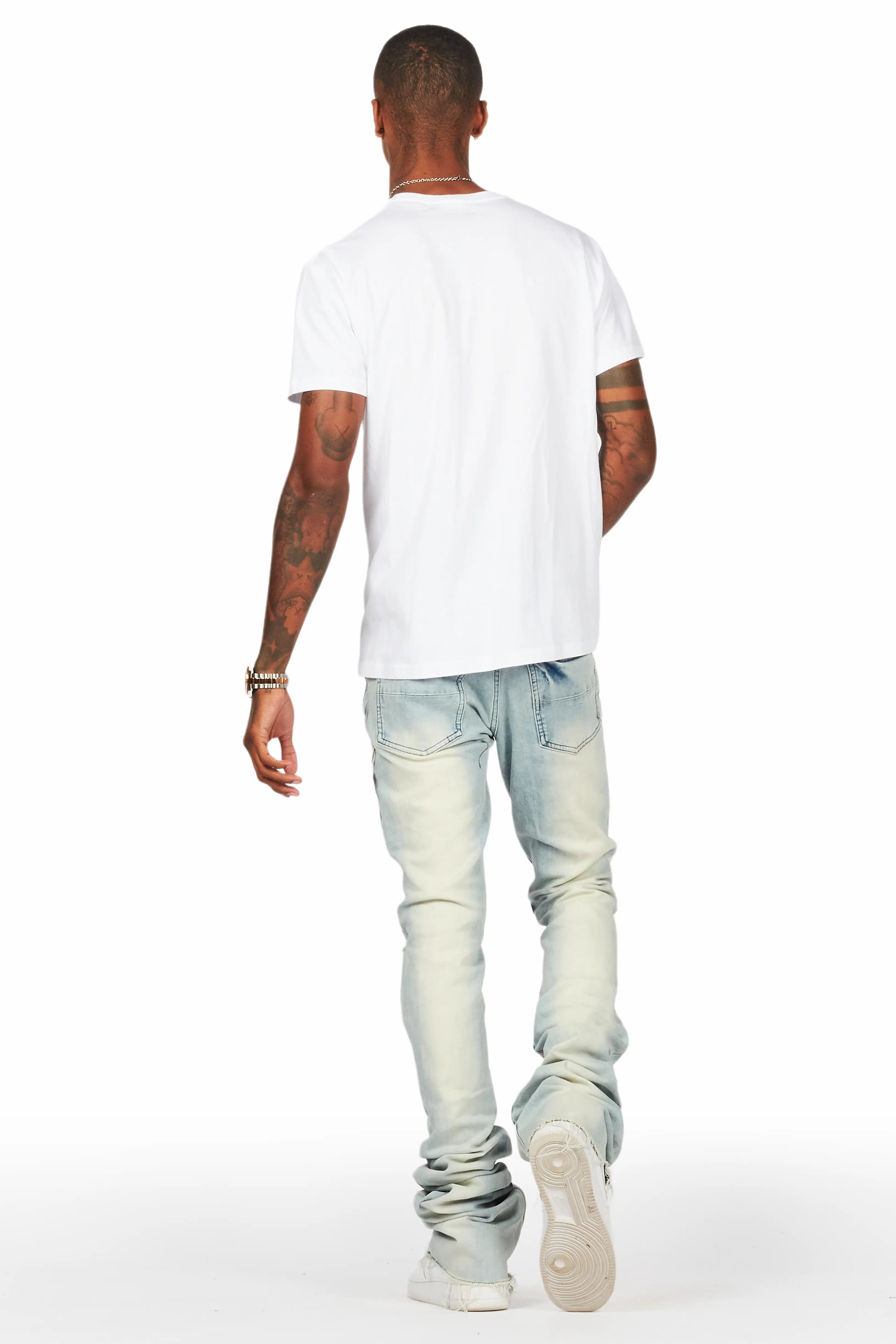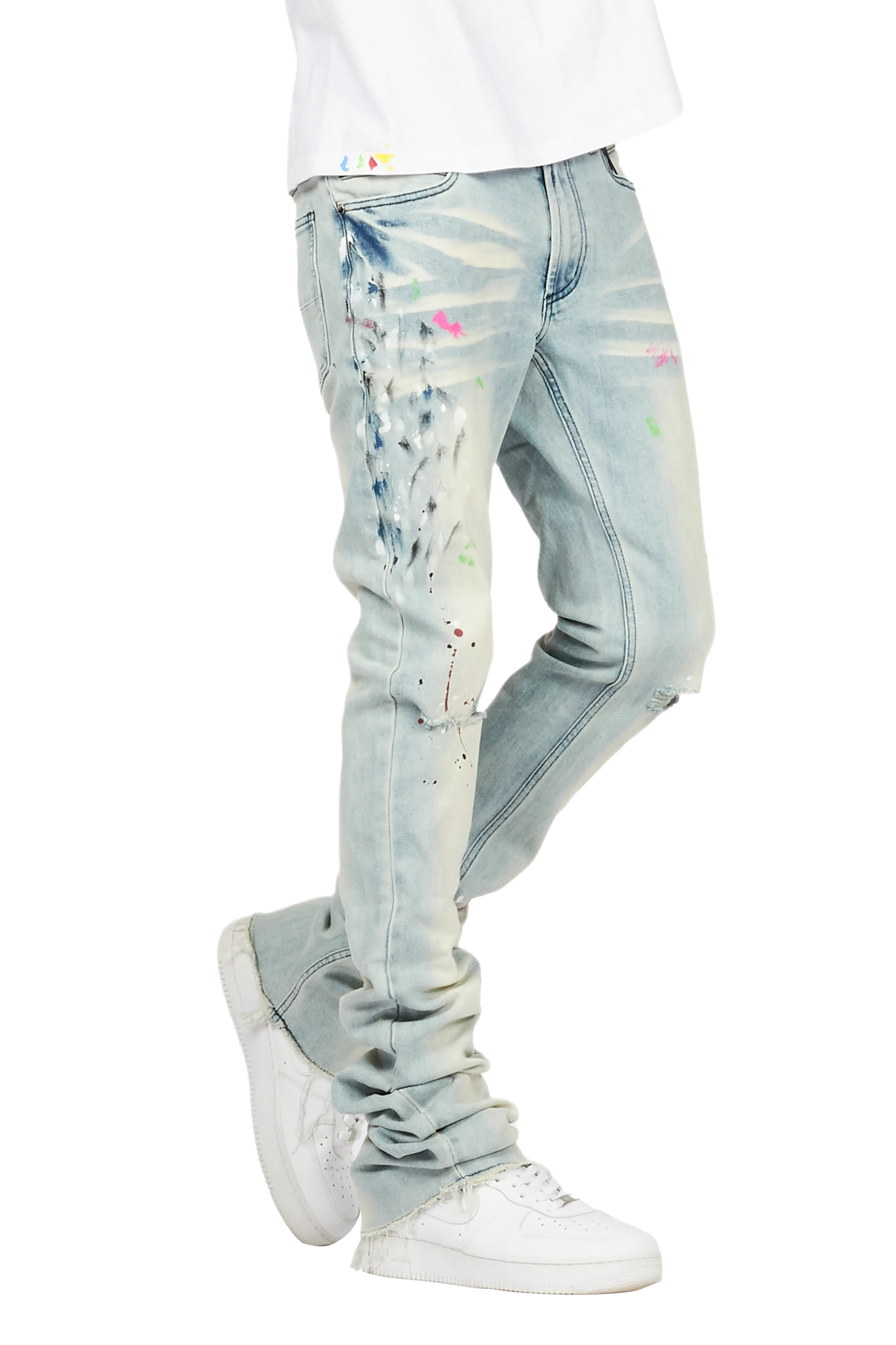 An urban stacked flare denim jean for men in blue. Designed with organic cotton and extra long legs for an essential streetwear style.