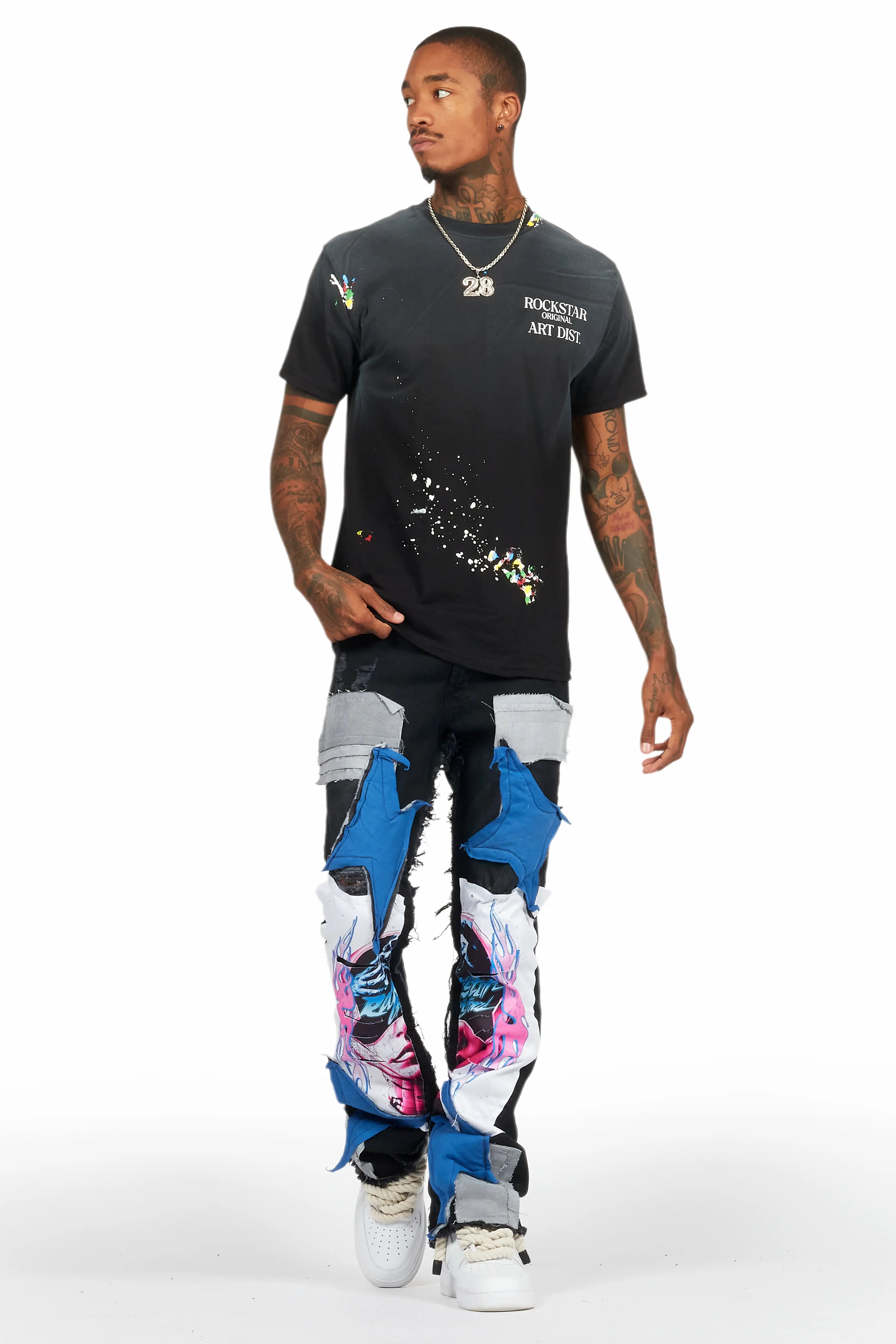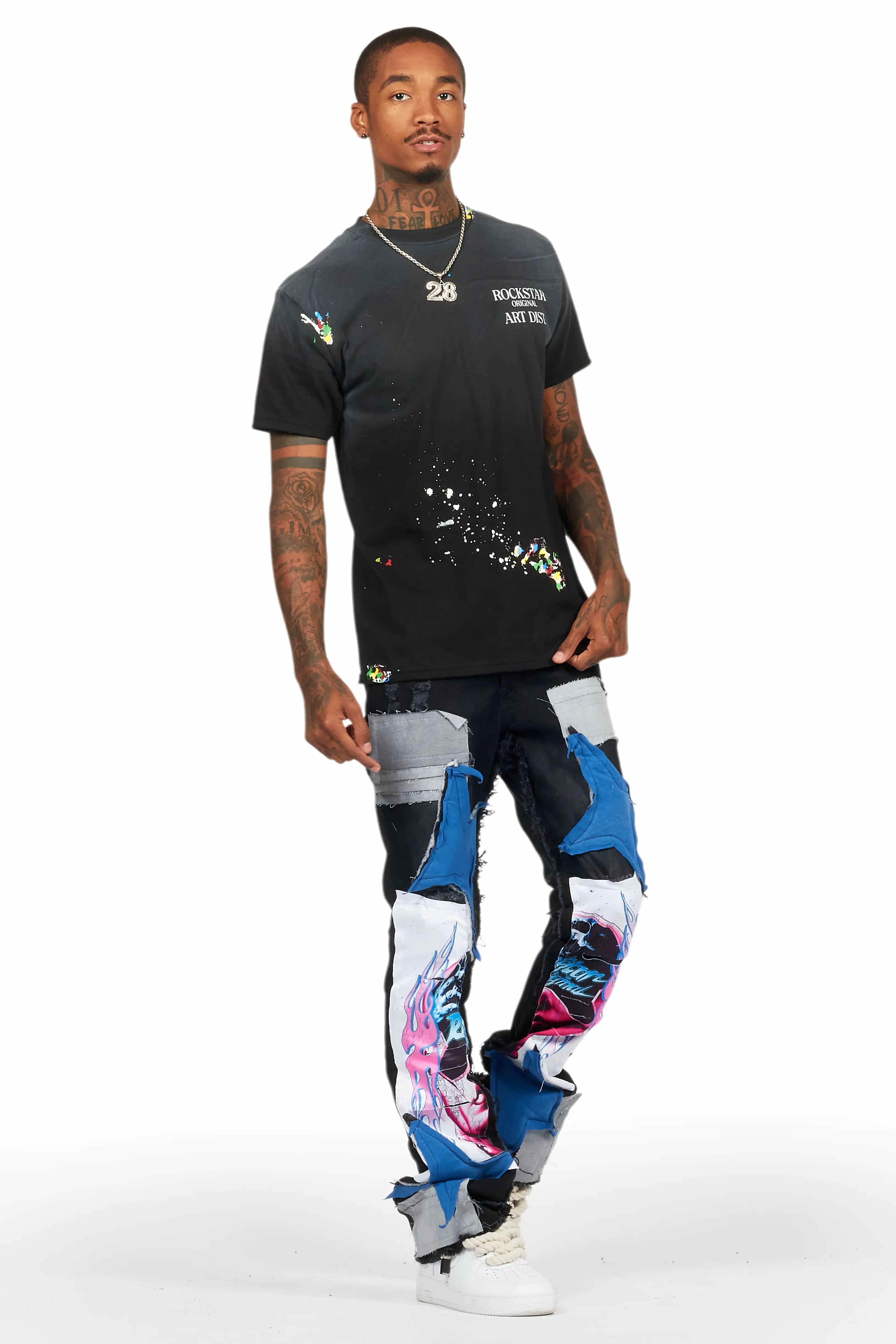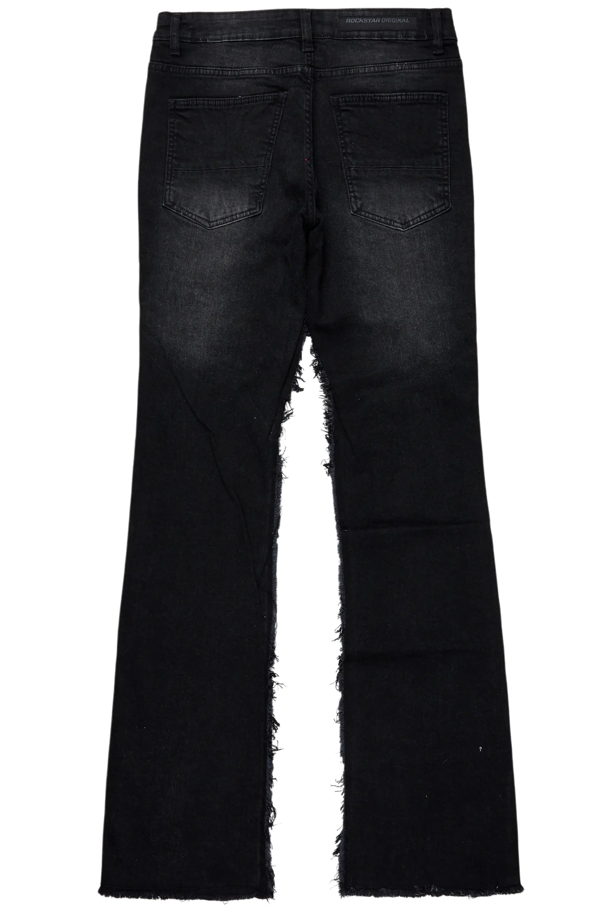 An urban stacked flare denim jean for men in dark grey. Designed with organic cotton and custom detailing for the perfect streetwear style.