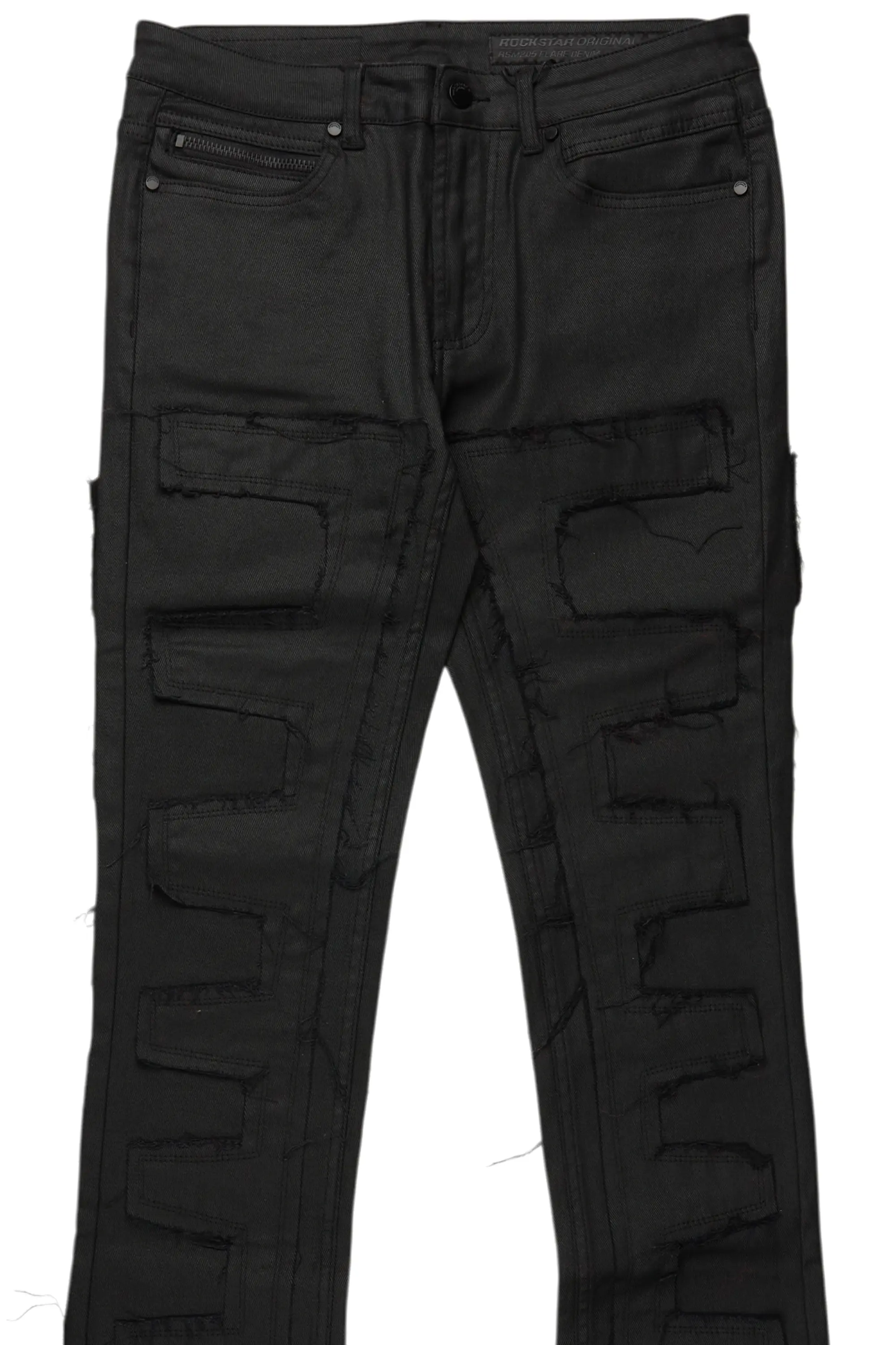 An urban stacked flare denim jean for men in black. Designed with a smooth coated finish and a modern bootcut flare fit for a must-cop pair of streetwear jeans.