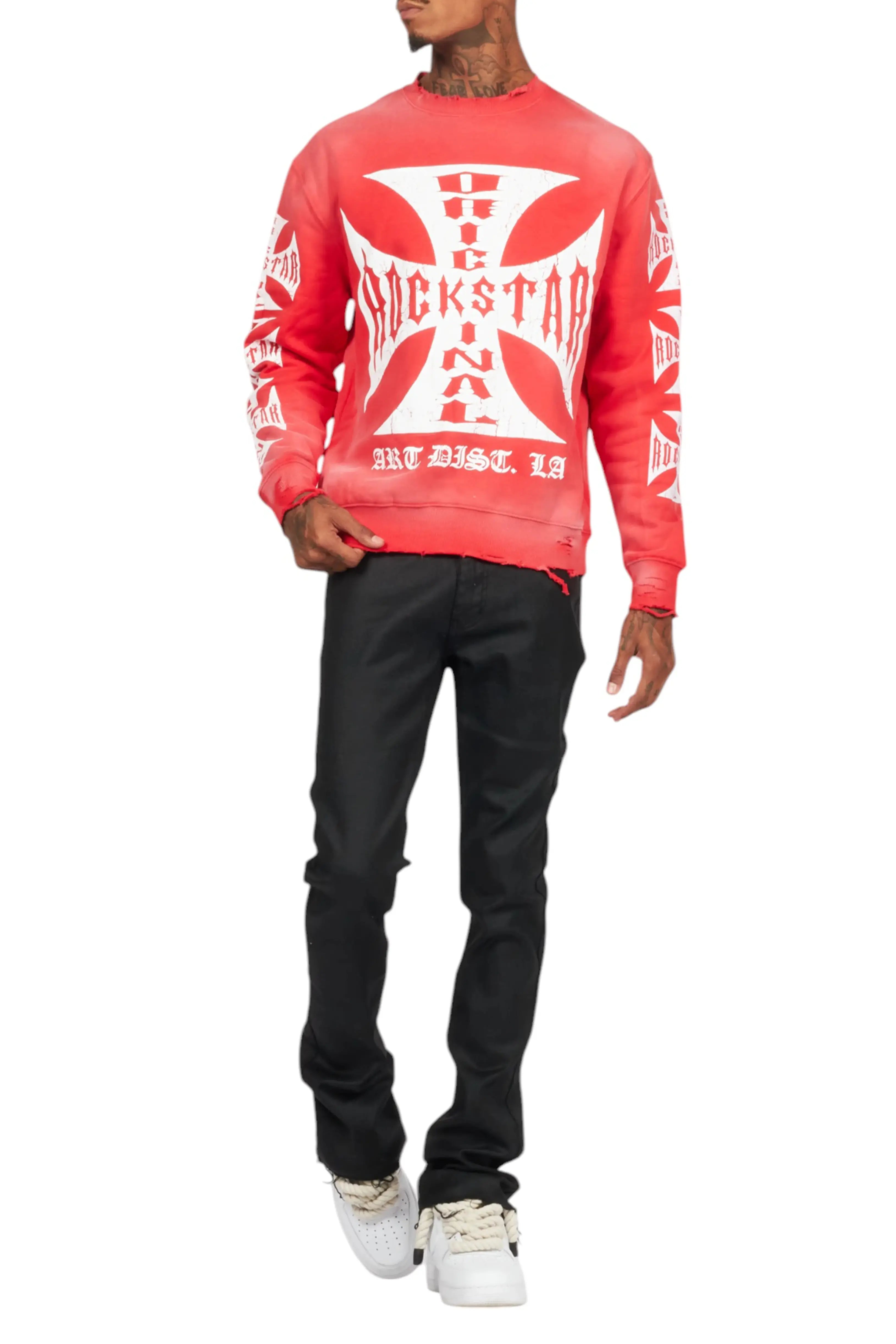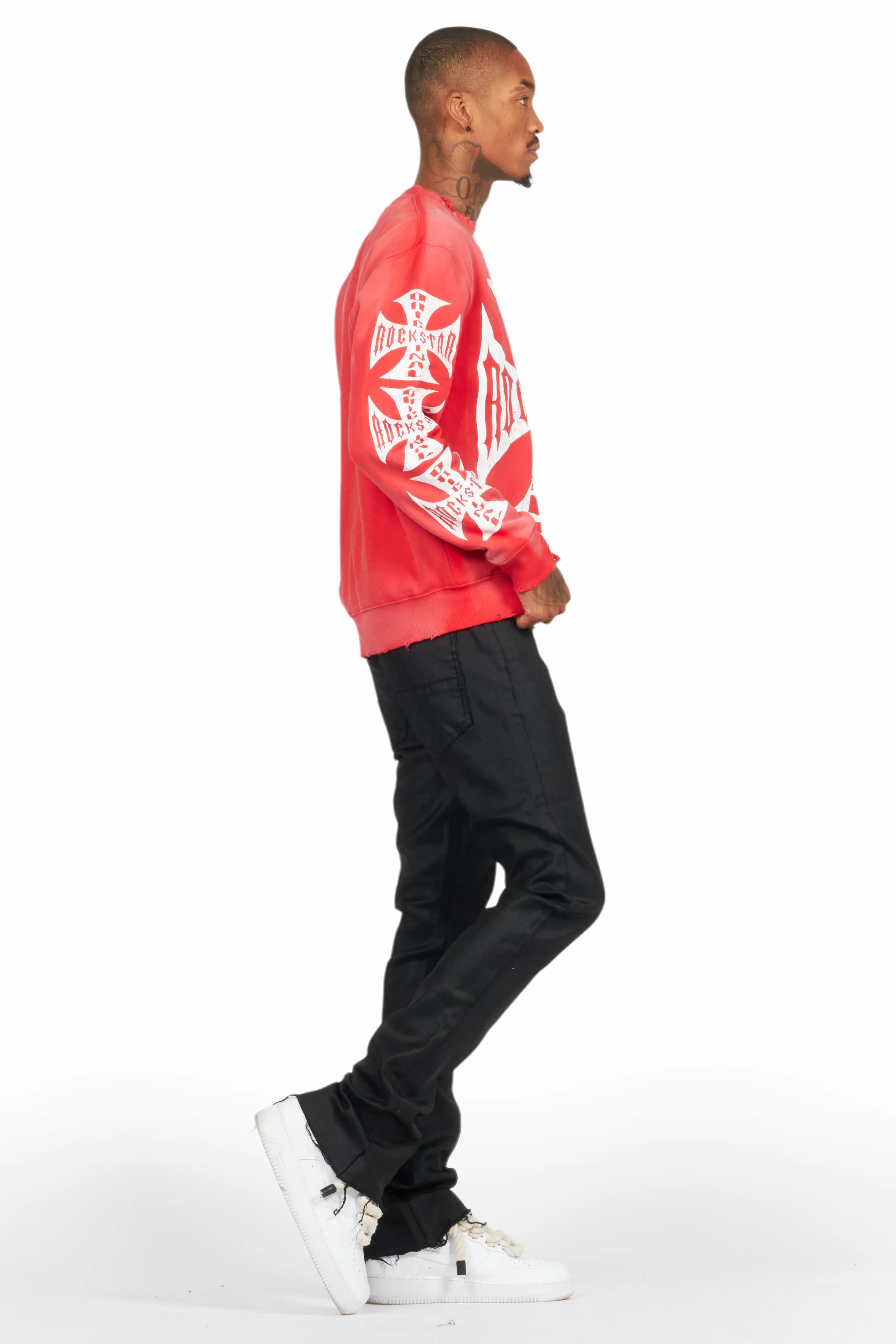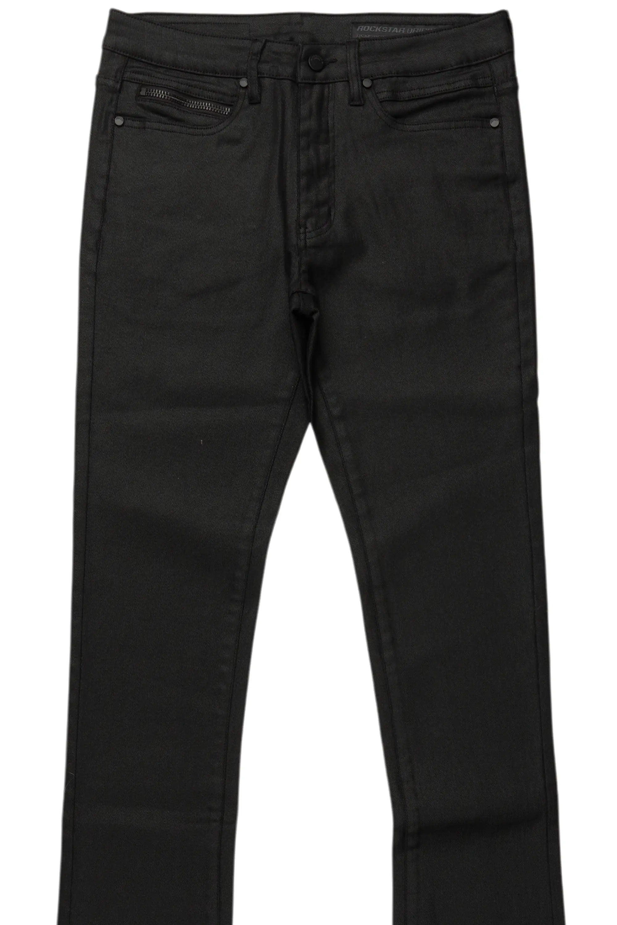 An urban stacked flare denim jean for men in black. Designed with a smooth coated finish for a functional pair of streetwear jean.