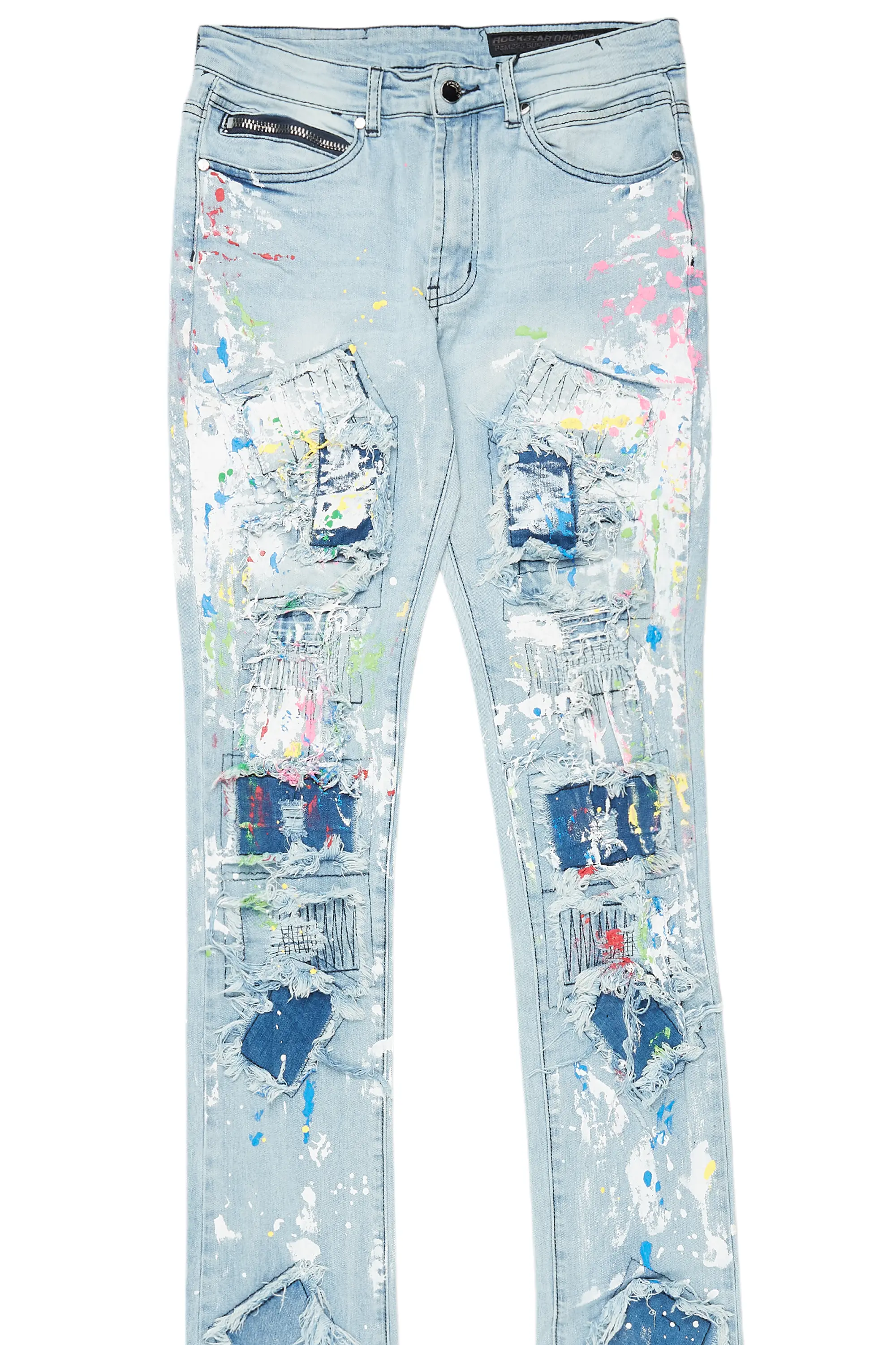An urban super stacked flare denim jean for men in blue. Designed with organic cotton and extra long legs for an essential streetwear style.