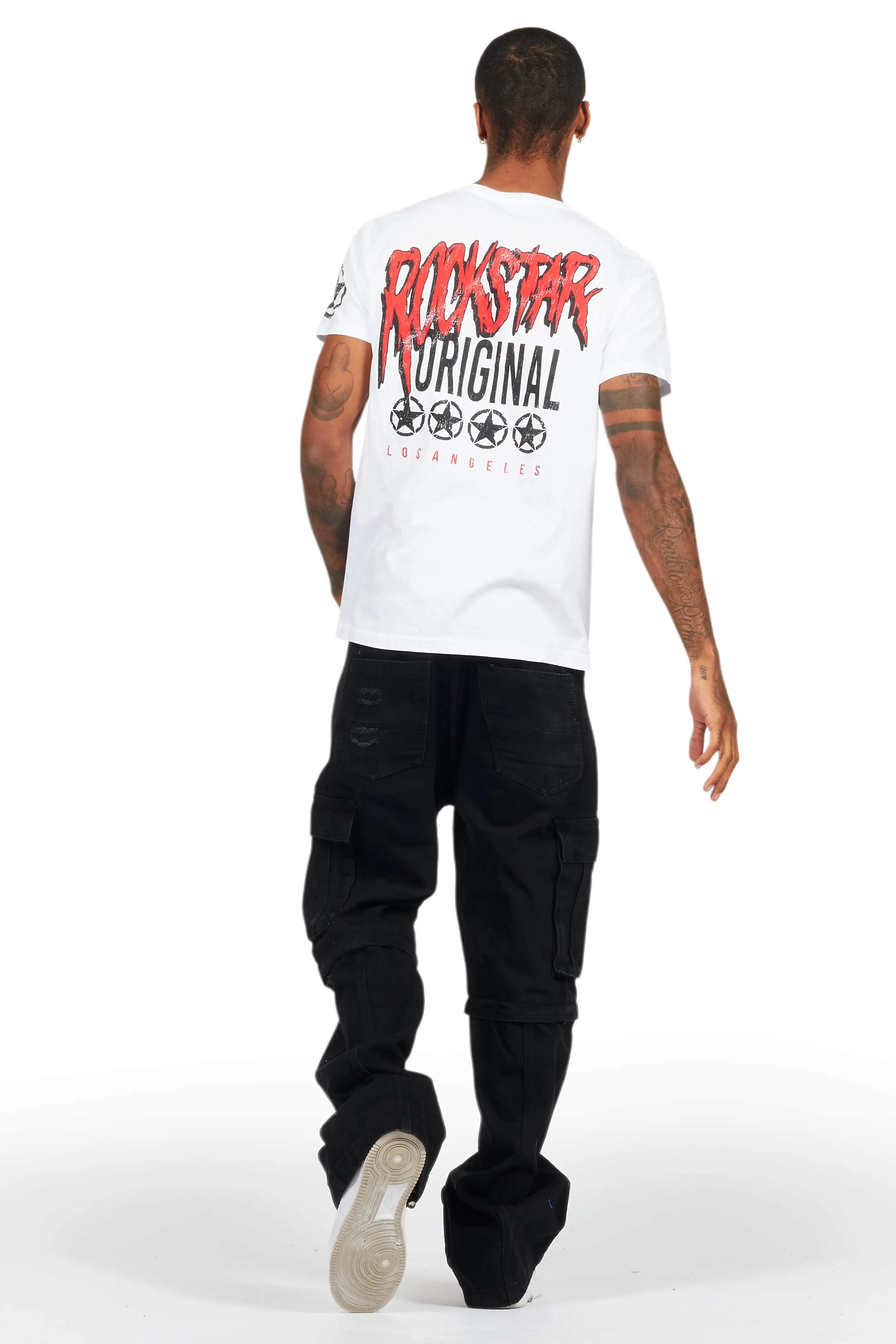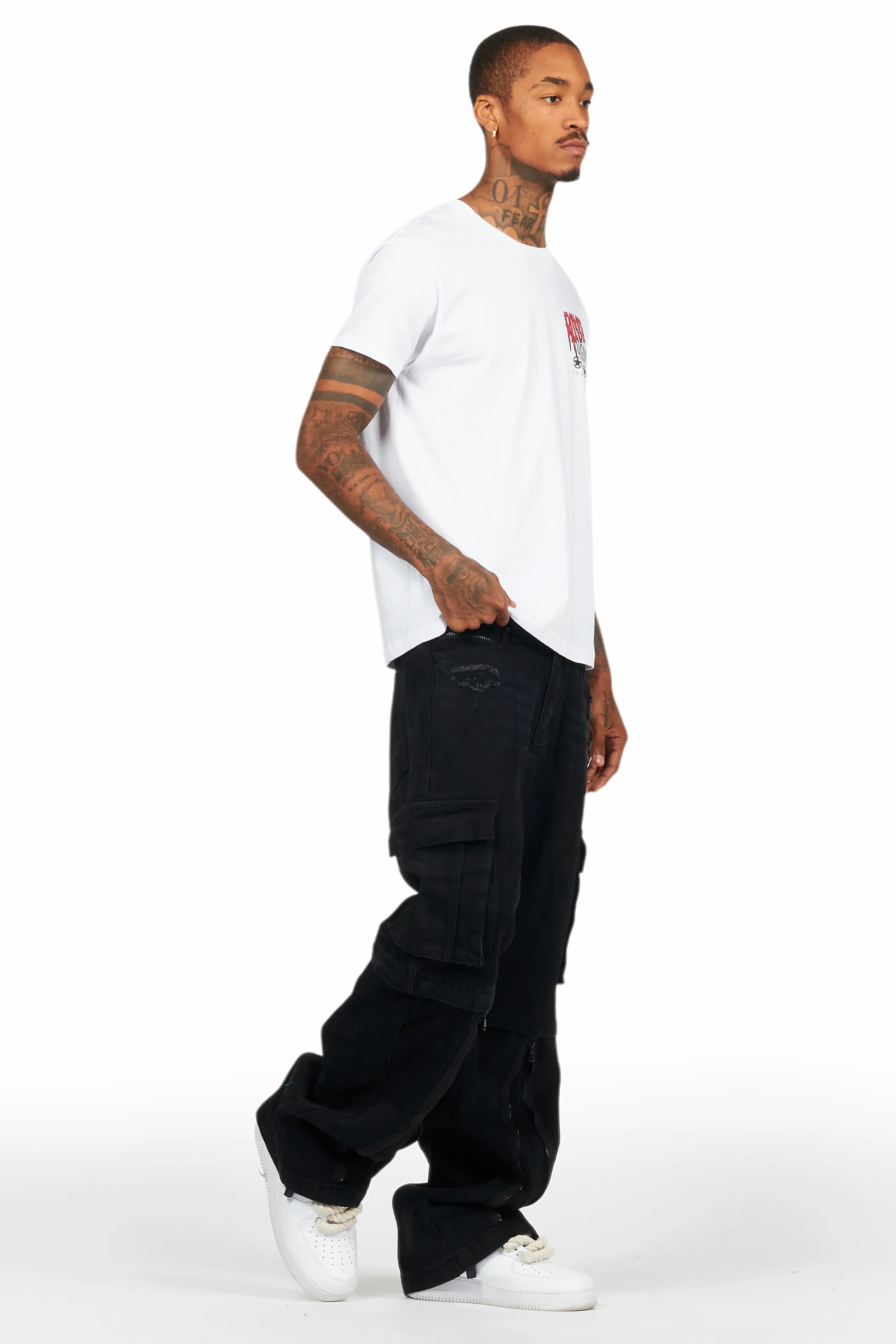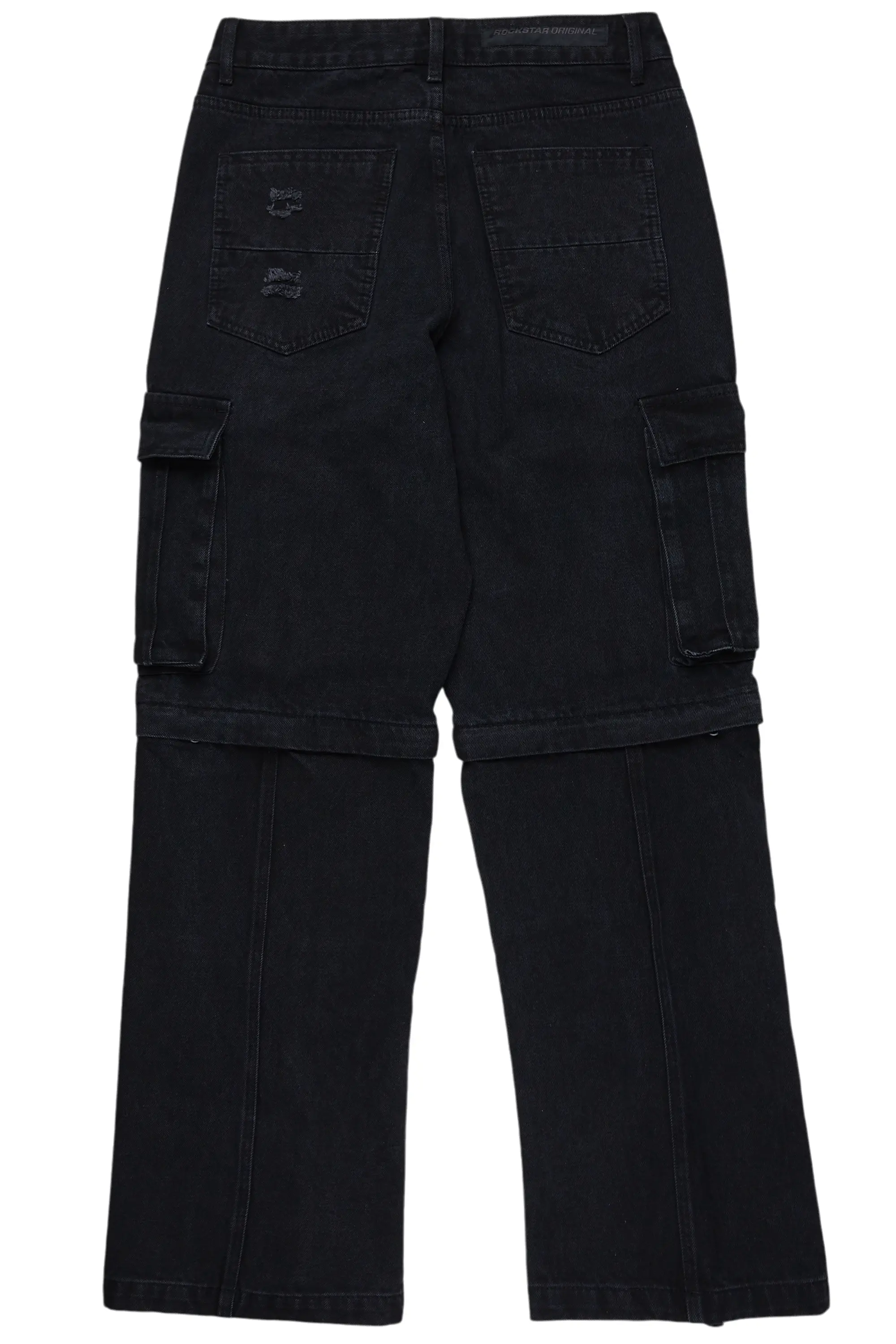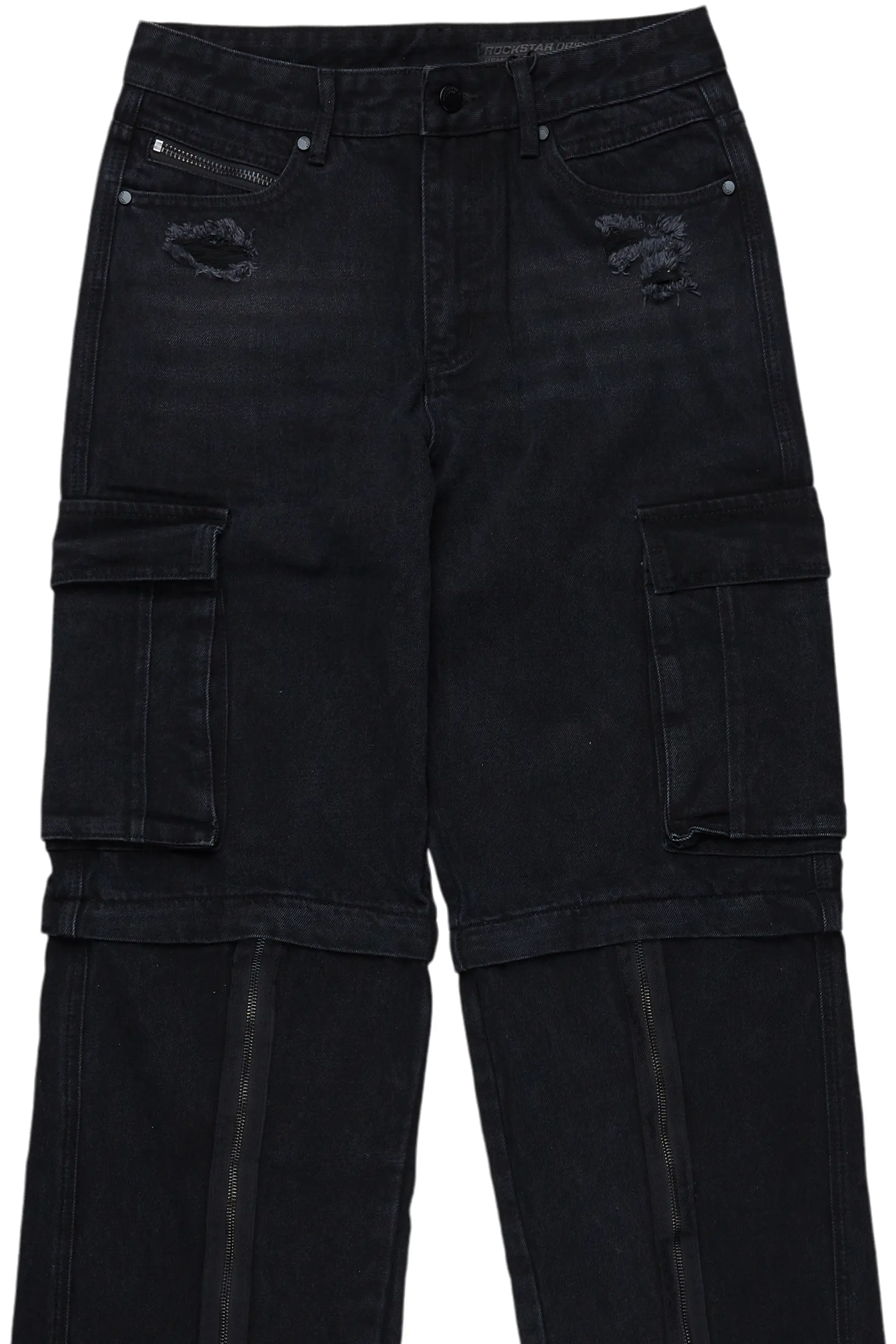 An urban cargo baggy zip-off twofer jean for men in black. Designed with organic cotton and utility pockets for a dope denim streetwear style.