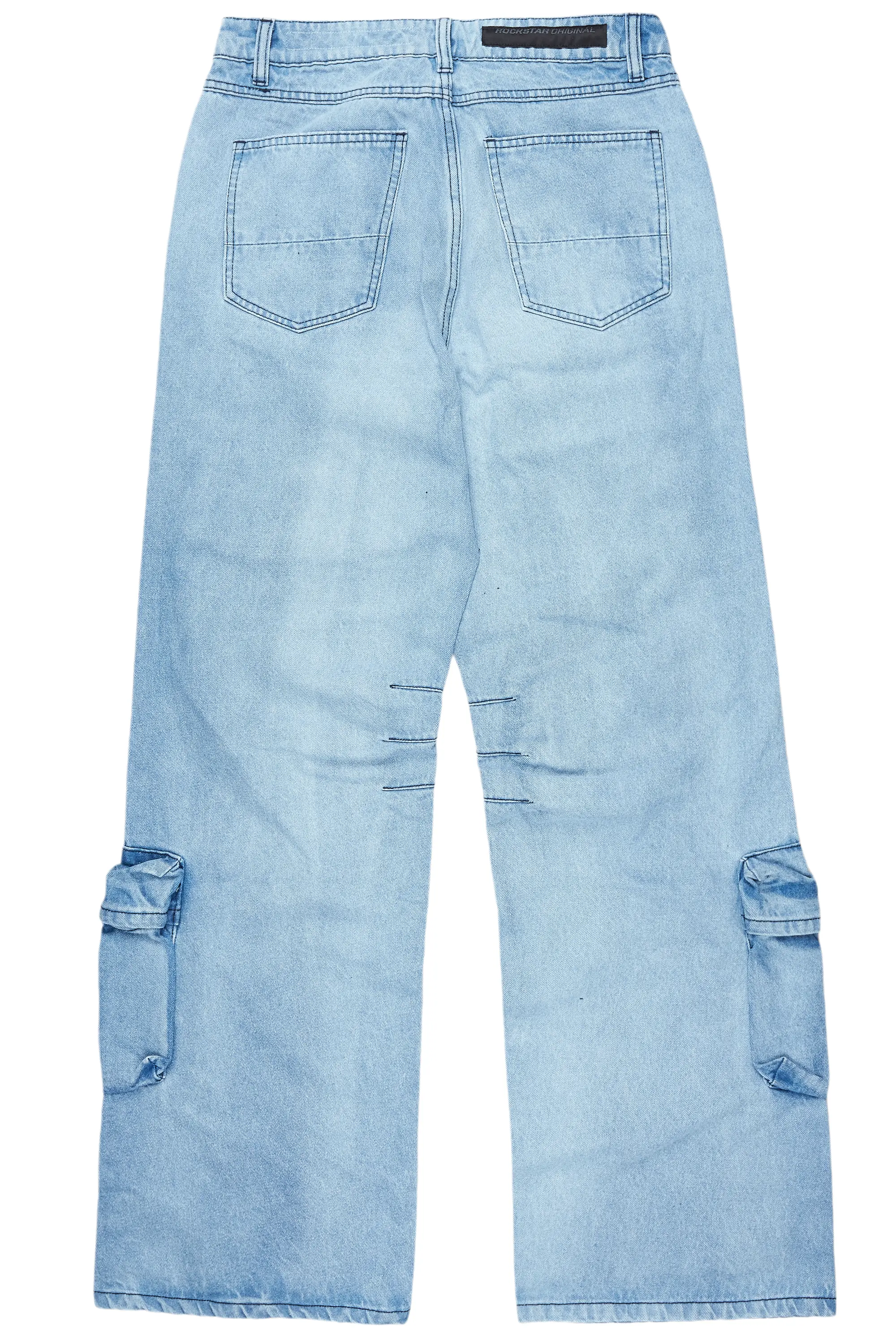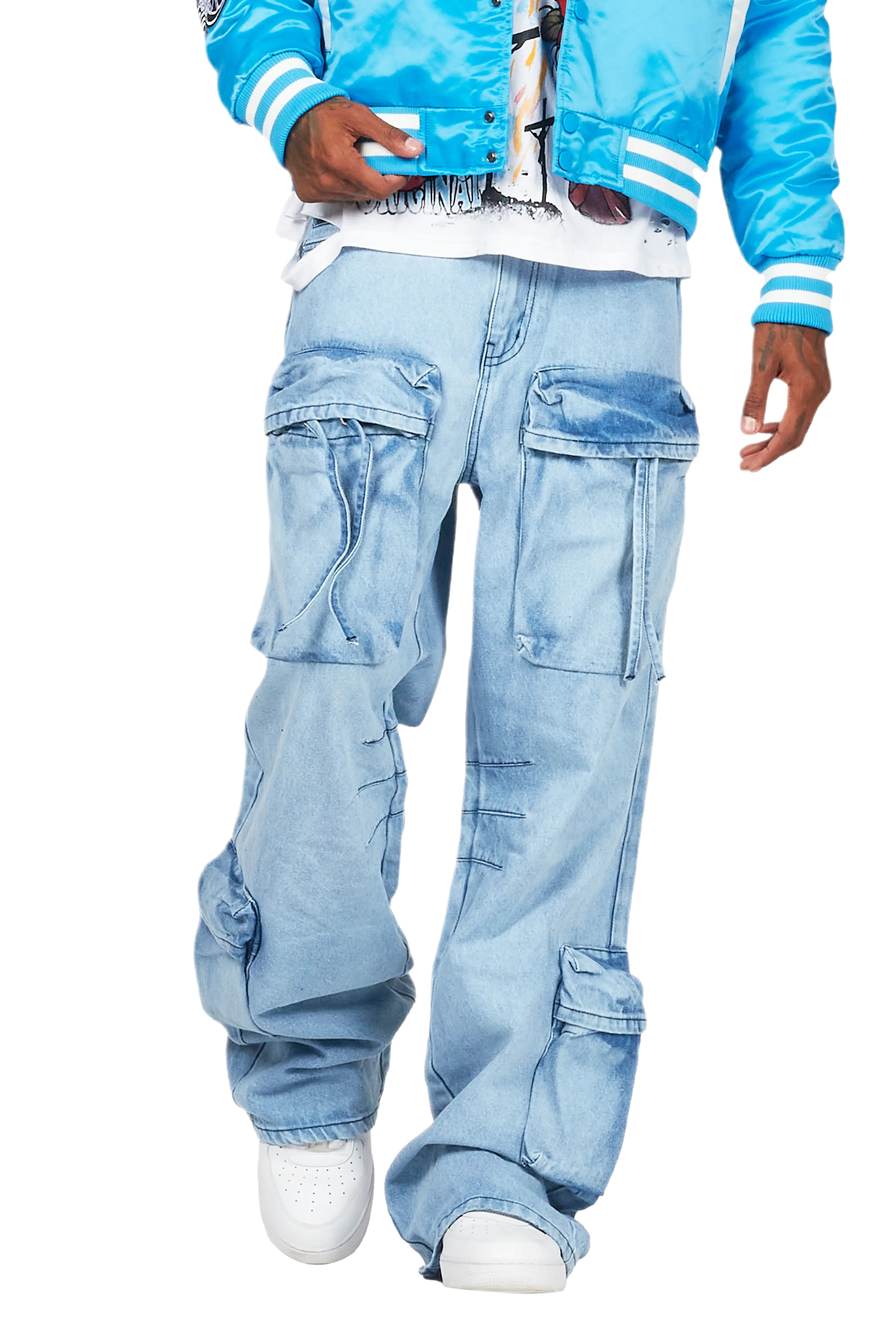 An urban cargo baggy jean for men in blue. Designed with organic cotton and utility pockets for a dope denim streetwear style.