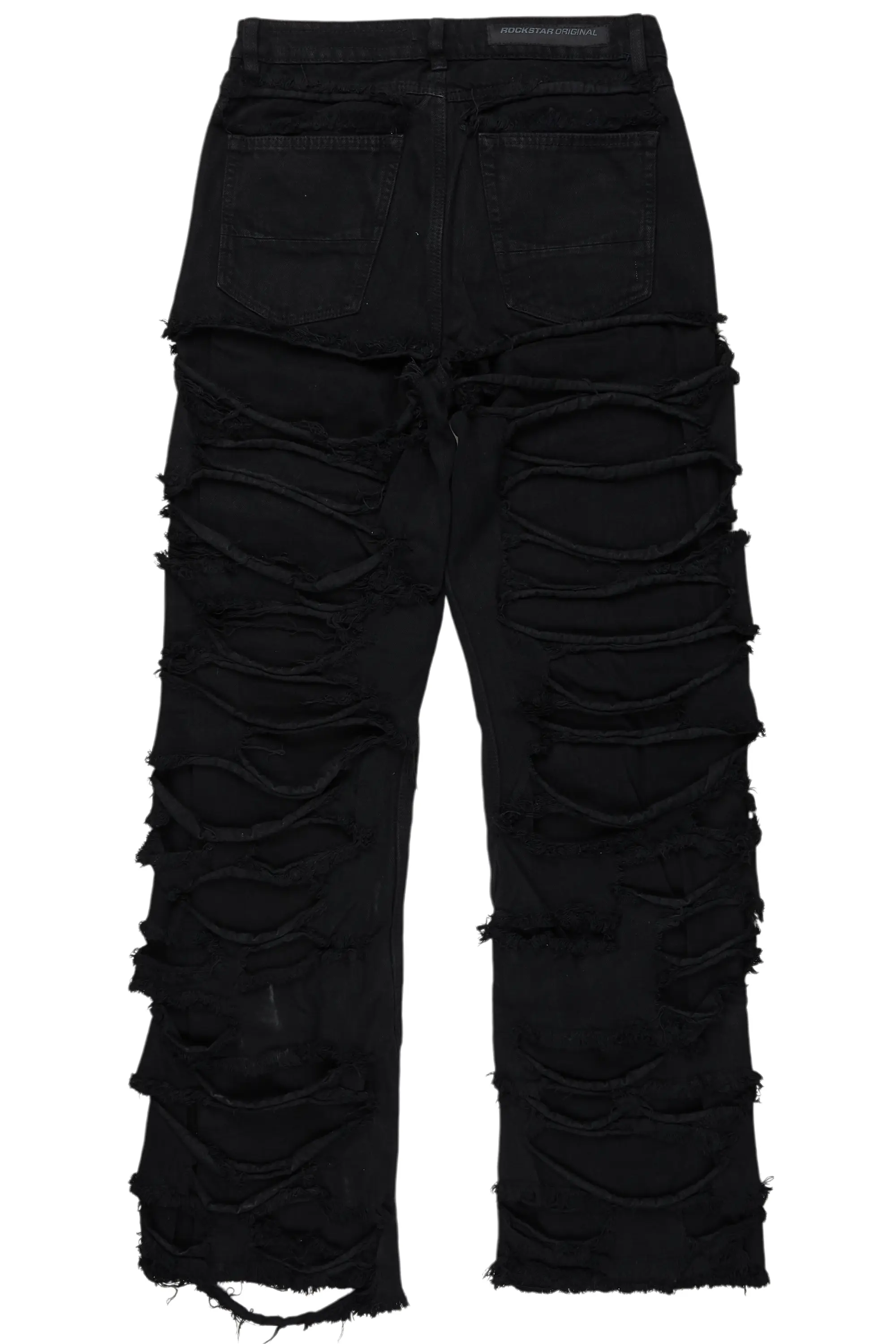An urban baggy jean for men in black. Designed with organic cotton and distressed detailing for a dope denim streetwear style.