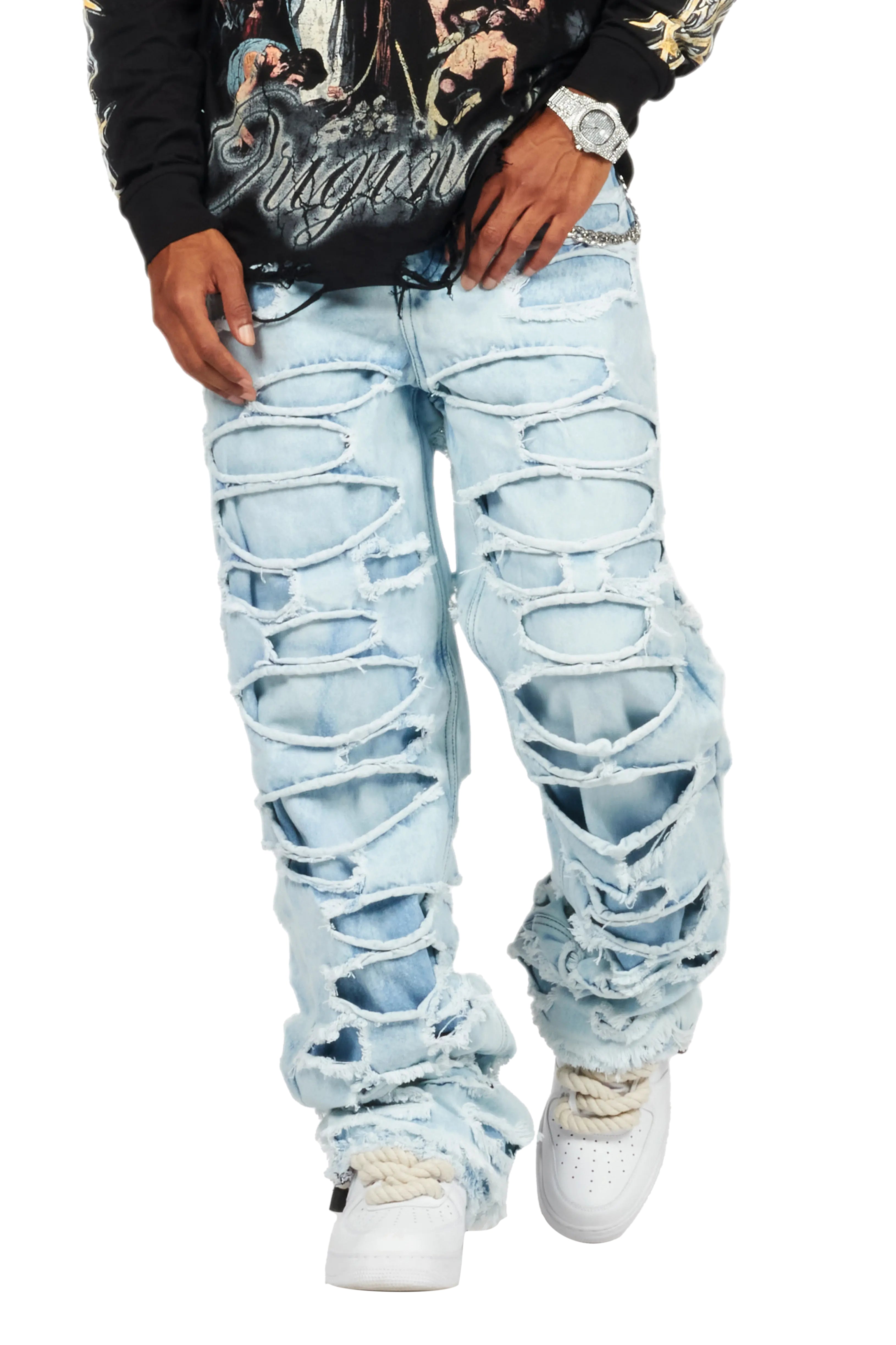 An urban baggy jean for men in blue. Designed with organic cotton and distressed detailing for a dope denim streetwear style.