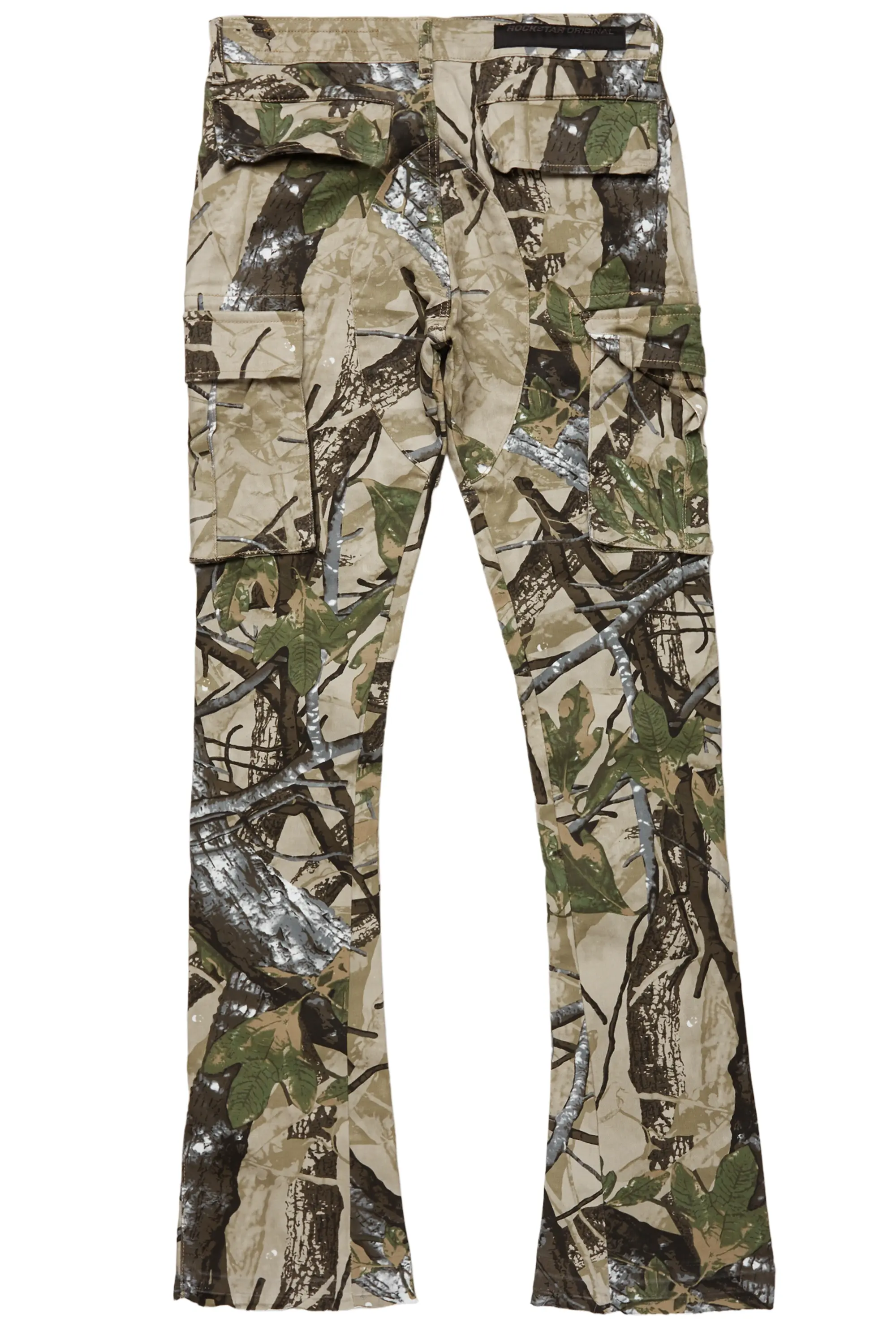 A contemporary pair of stack flare cargo jeans for men in tree camo. Designed with organic cotton and extra long legs for a dope streetwear style.