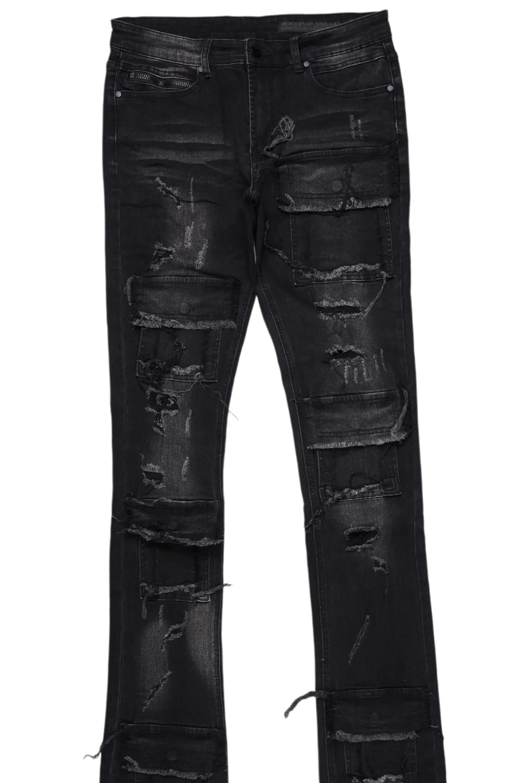 An urban super stack cargo jean for men black. Designed with organic cotton and utility pockets for a dope denim streetwear style.