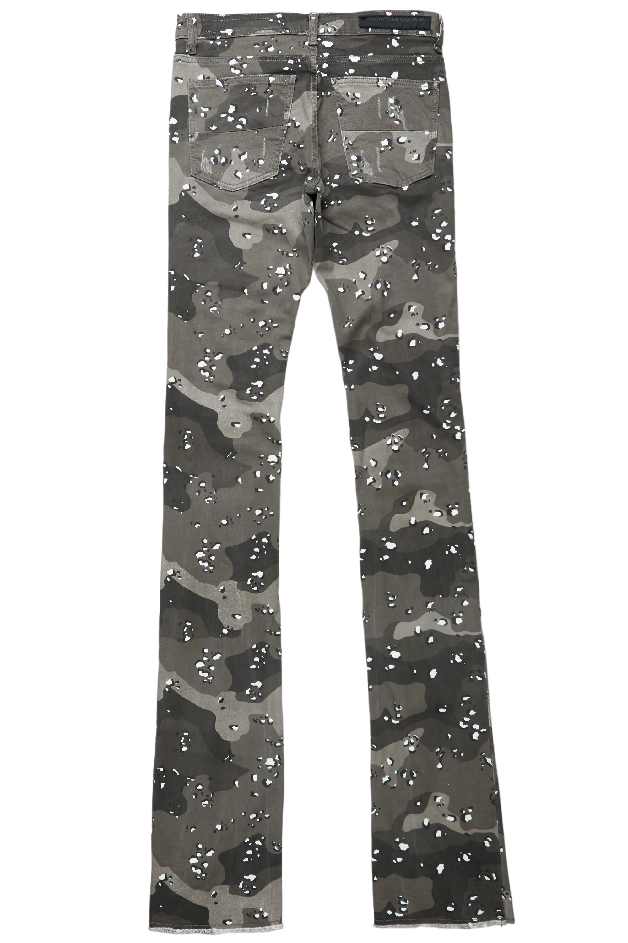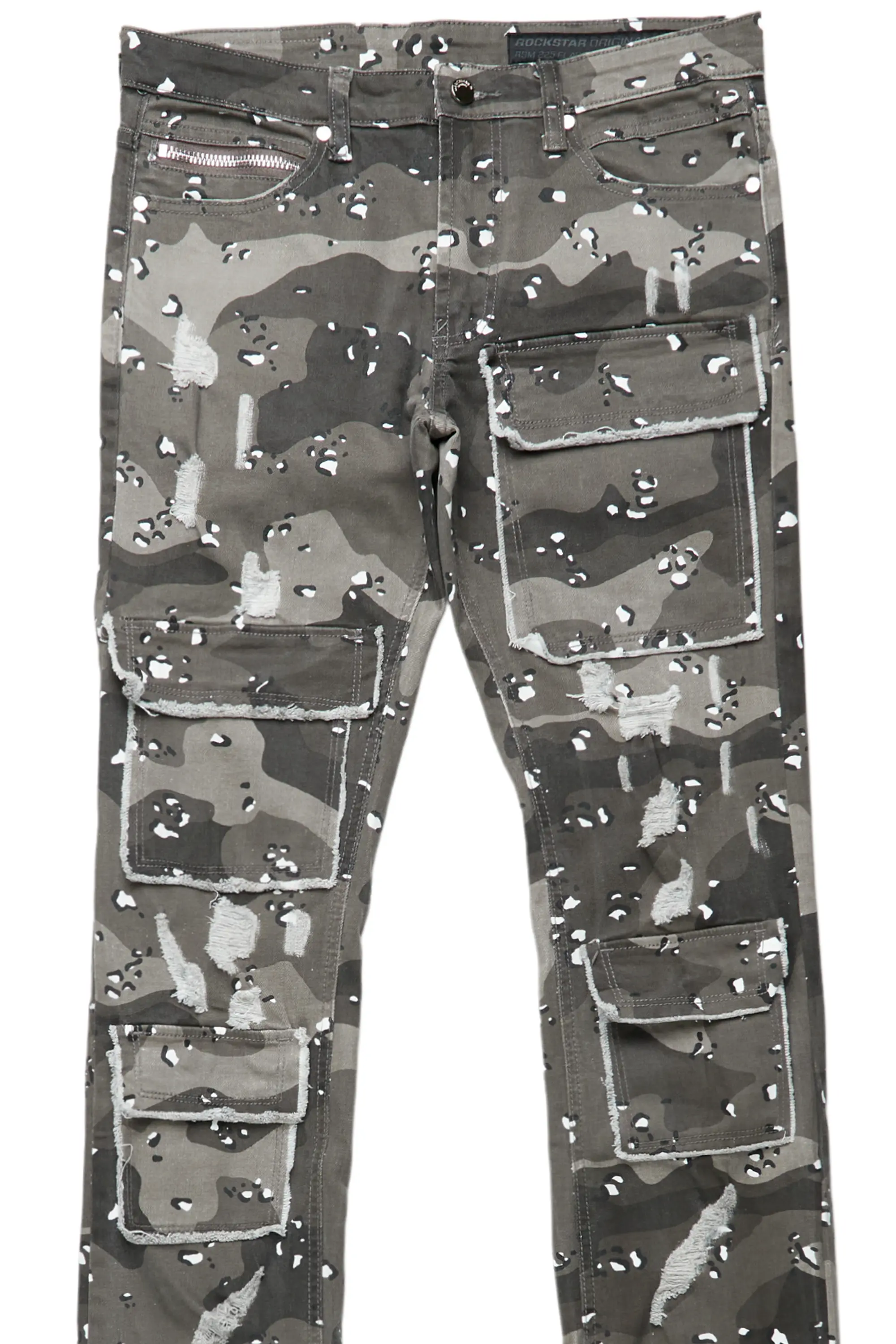 An urban super stack cargo jean for men grey camo. Designed with organic cotton and utility pockets for a dope denim streetwear style.