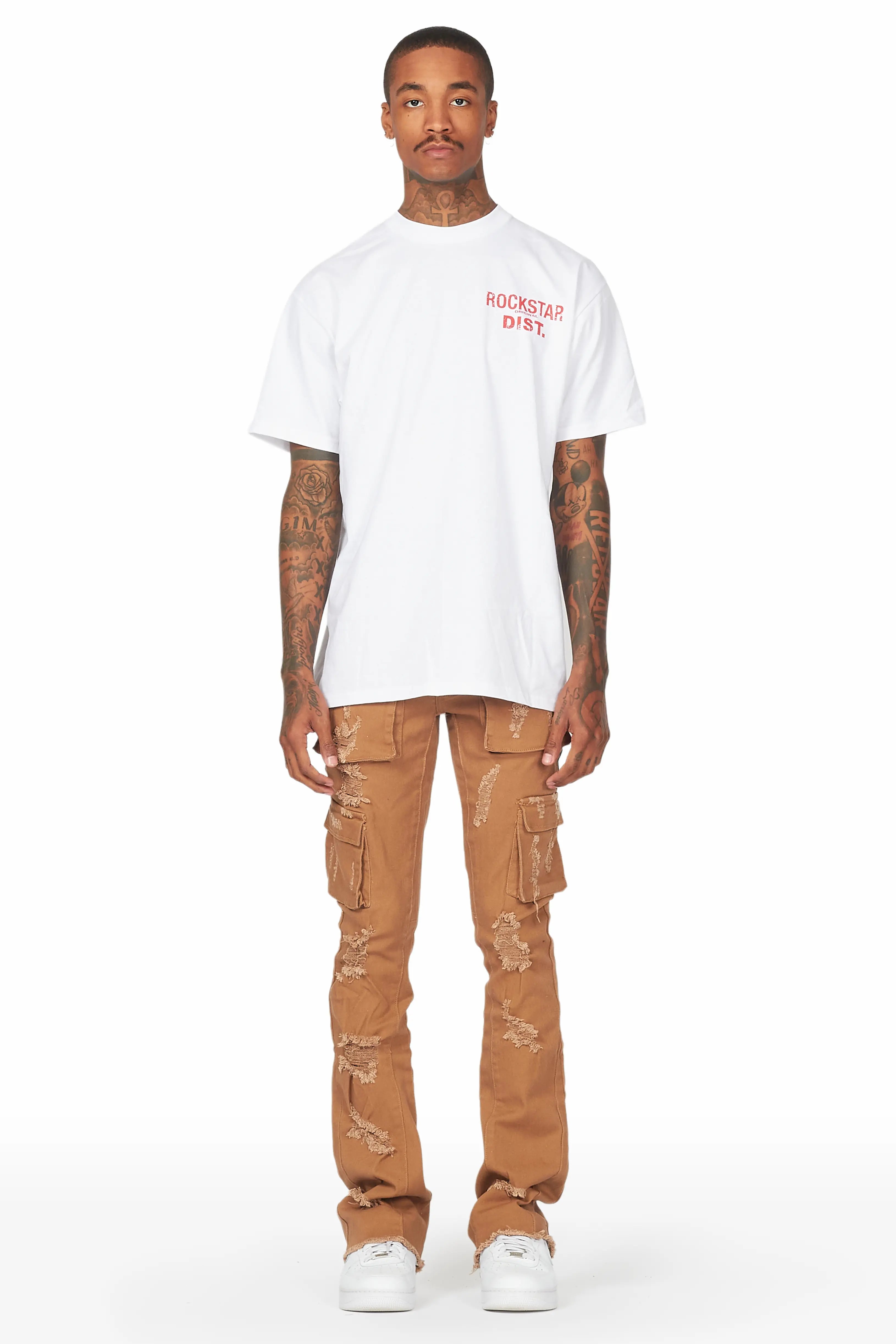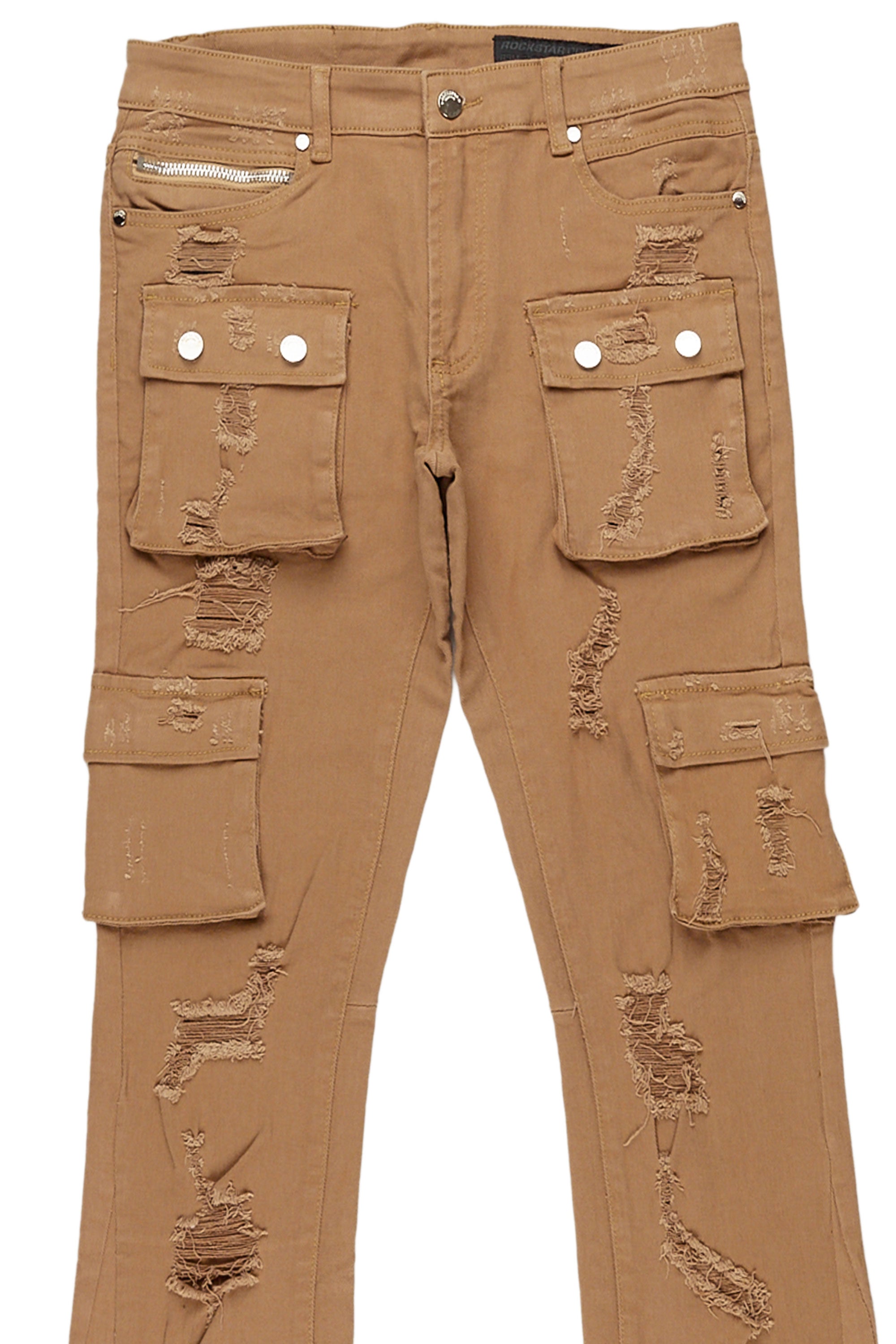An urban super stacked denim jean for men in tan. Designed with organic cotton and extra long legs for the perfect streetwear style.