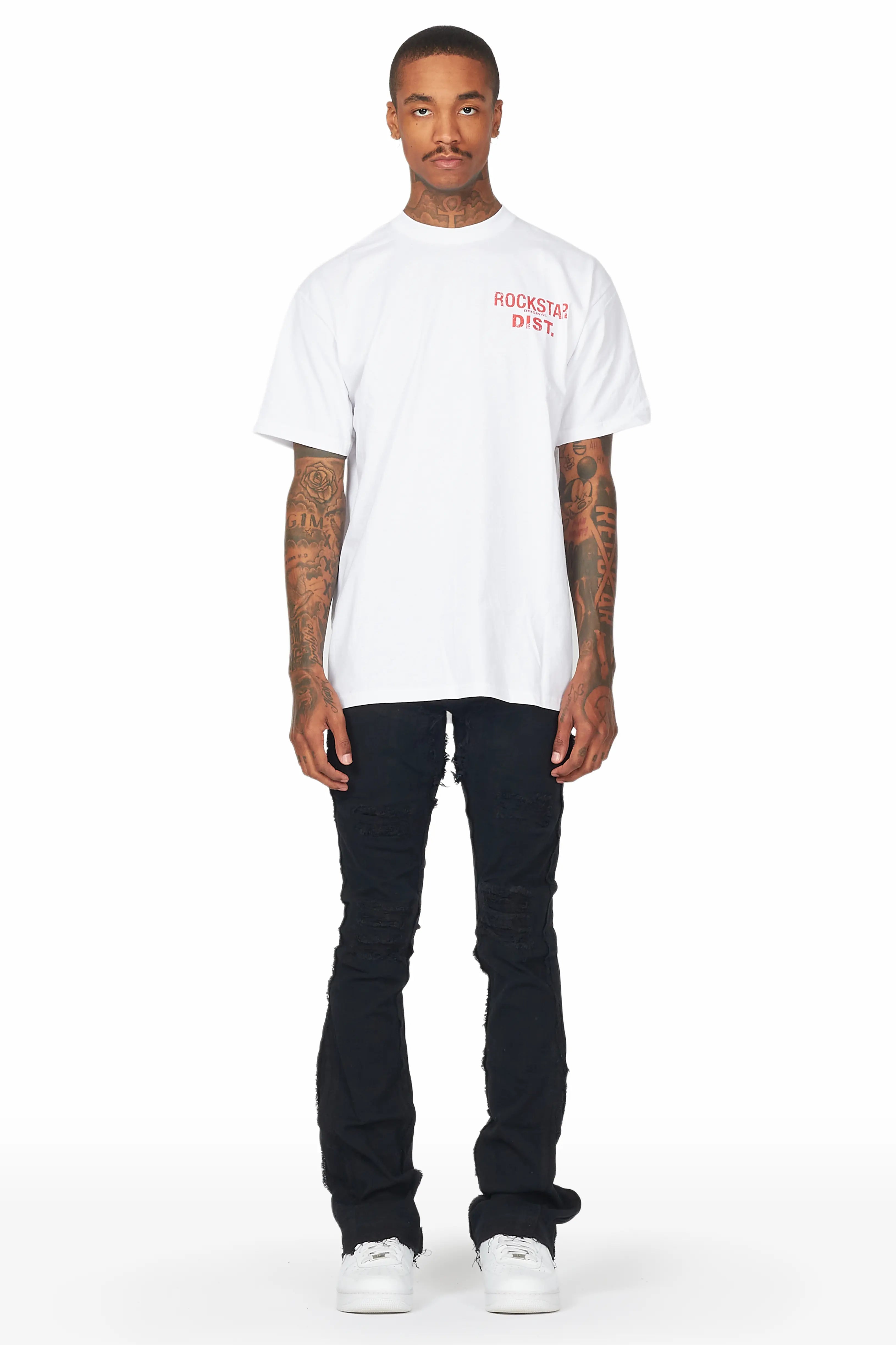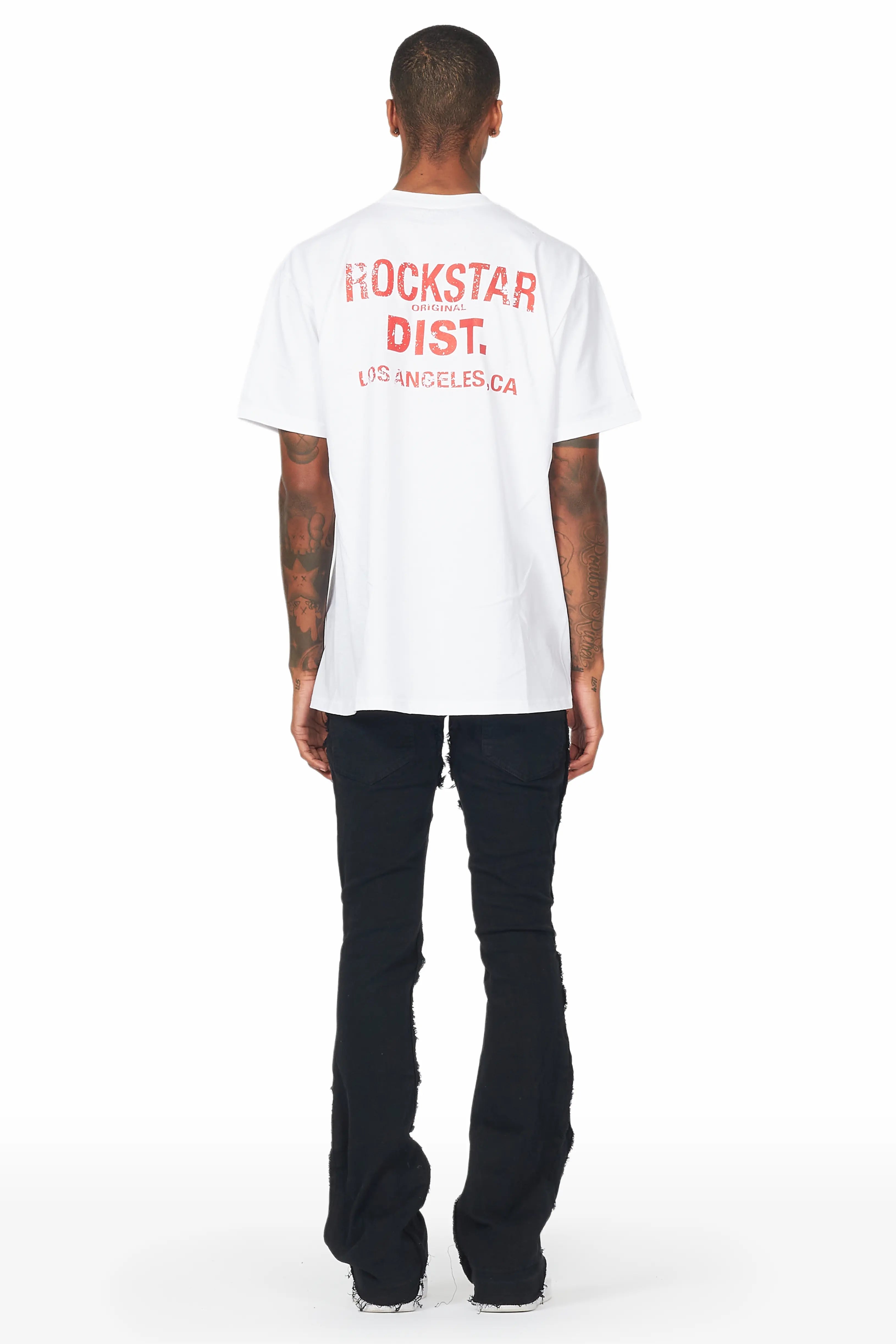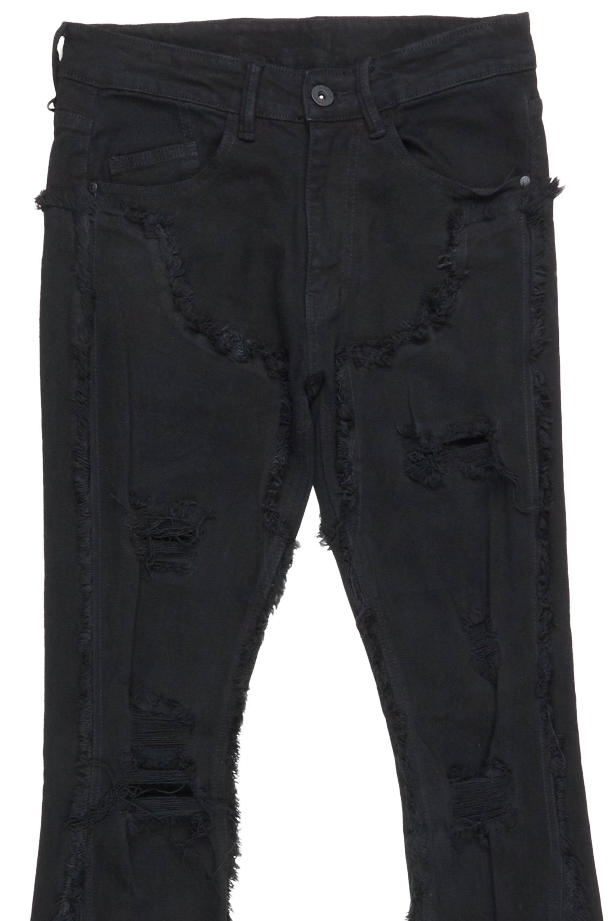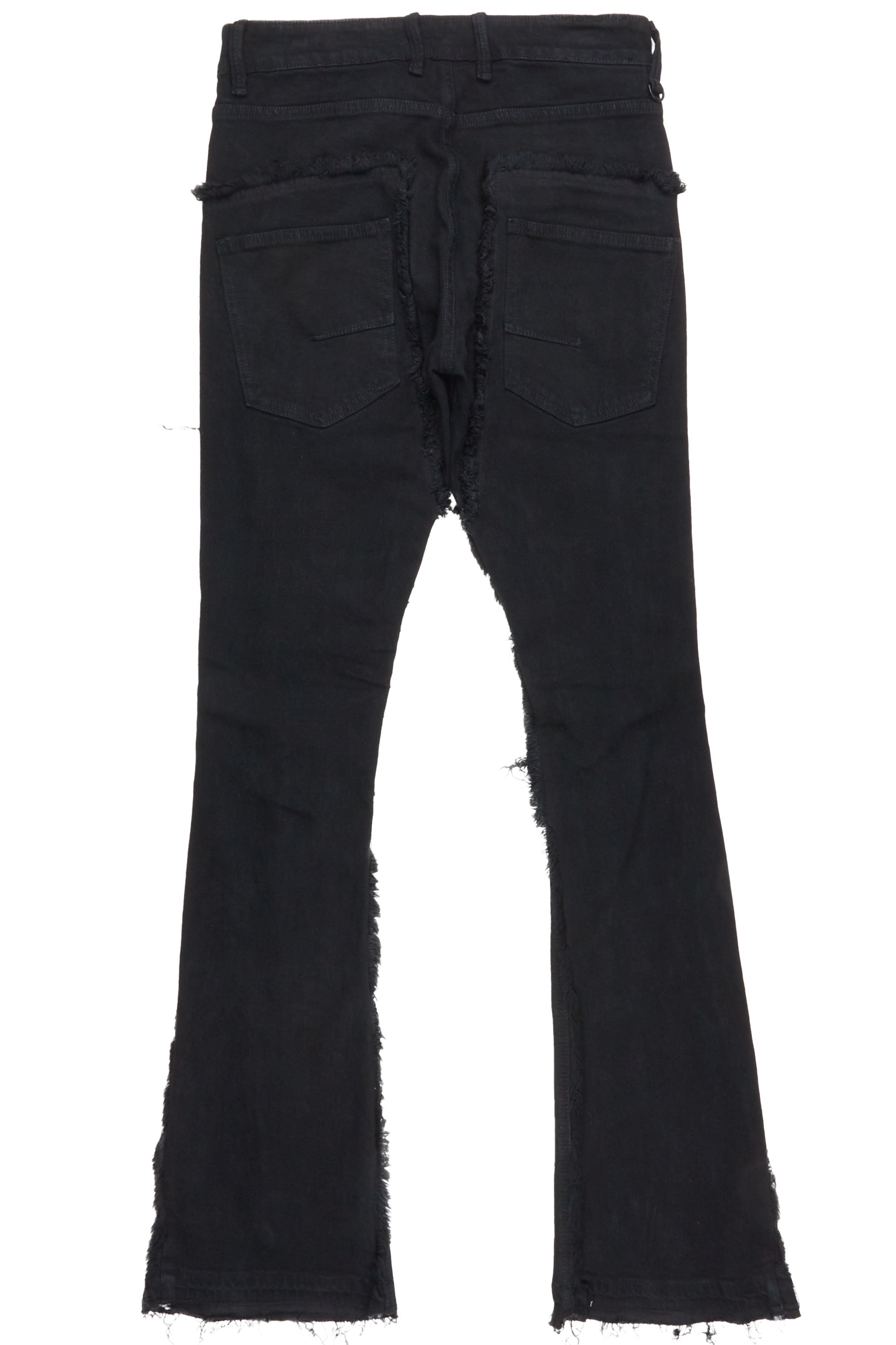 An urban streetwear stacked skinny flare jean for men in jet black. Designed with organic cotton and frayed stitching for a dope denim style.