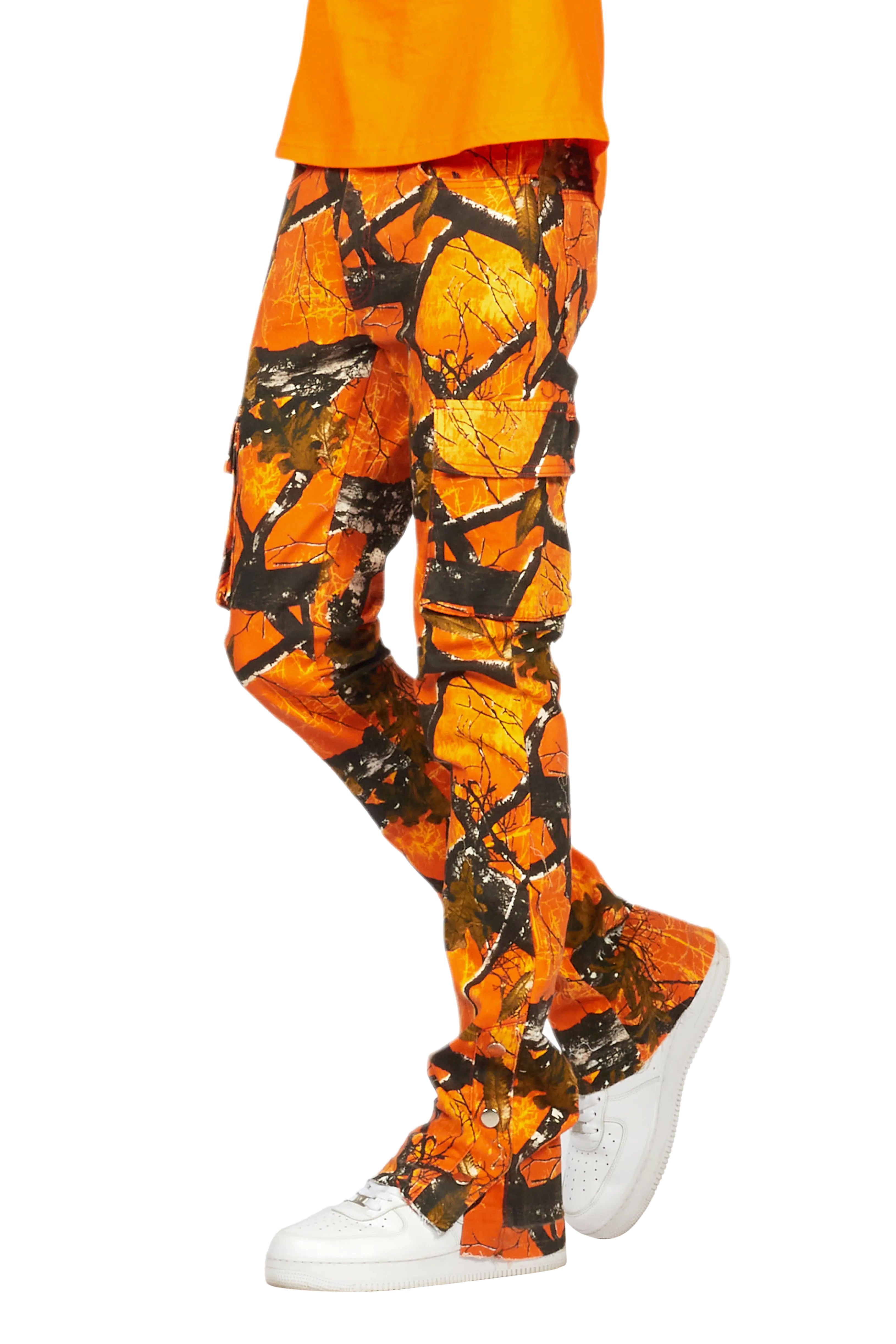 An urban cargo stacked skinny jean for men in orange tree camo. Designed with organic cotton and utility pockets for a dope denim streetwear style.
