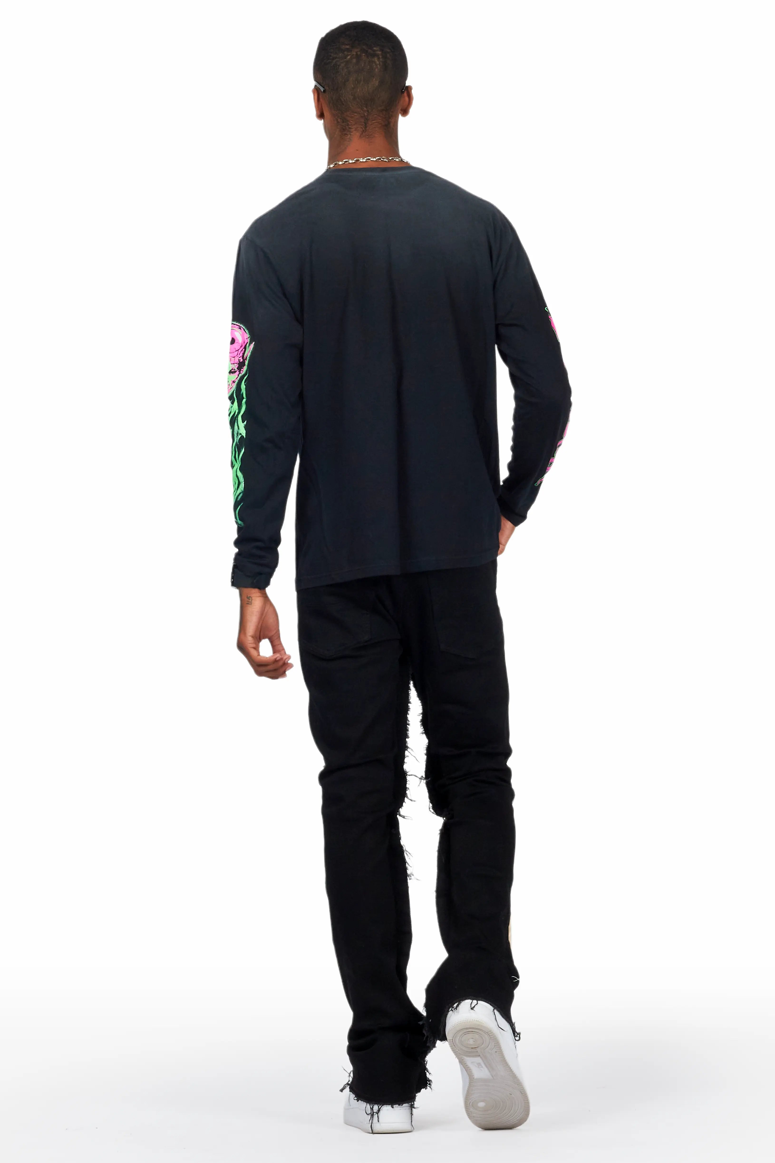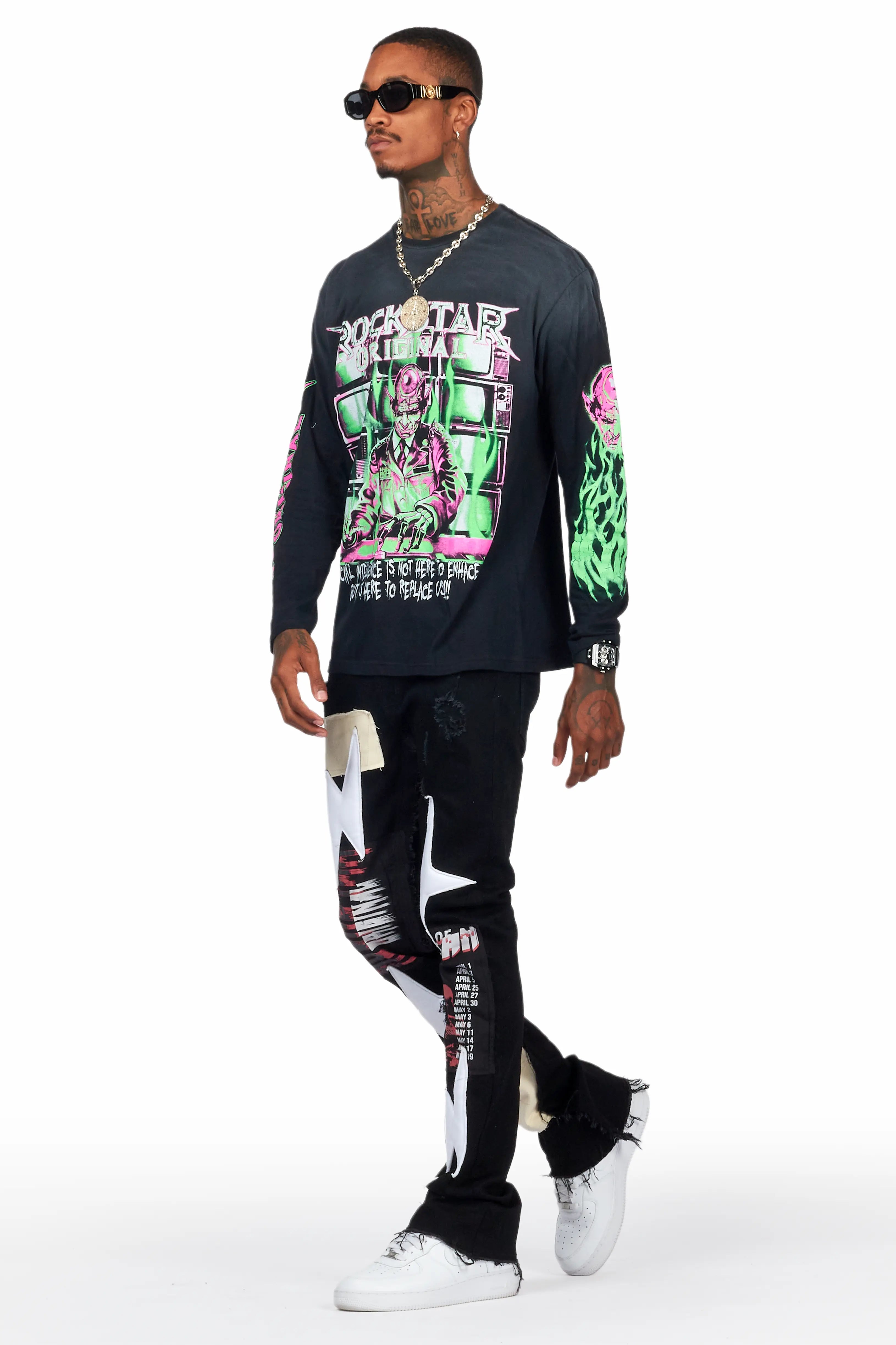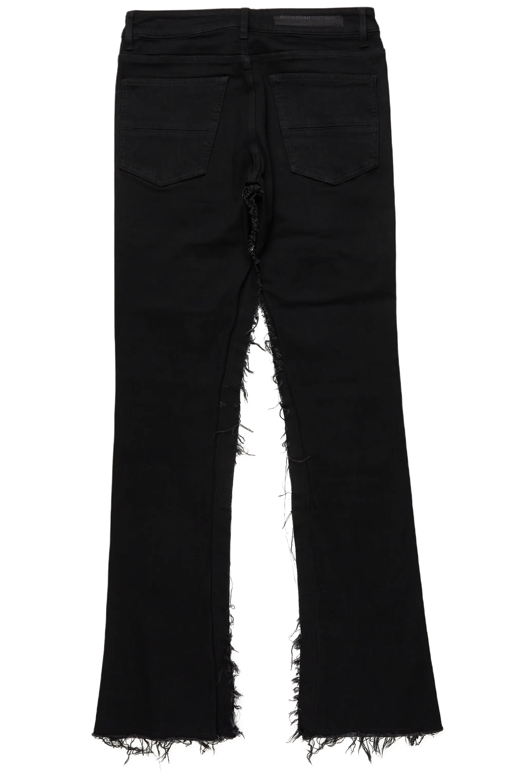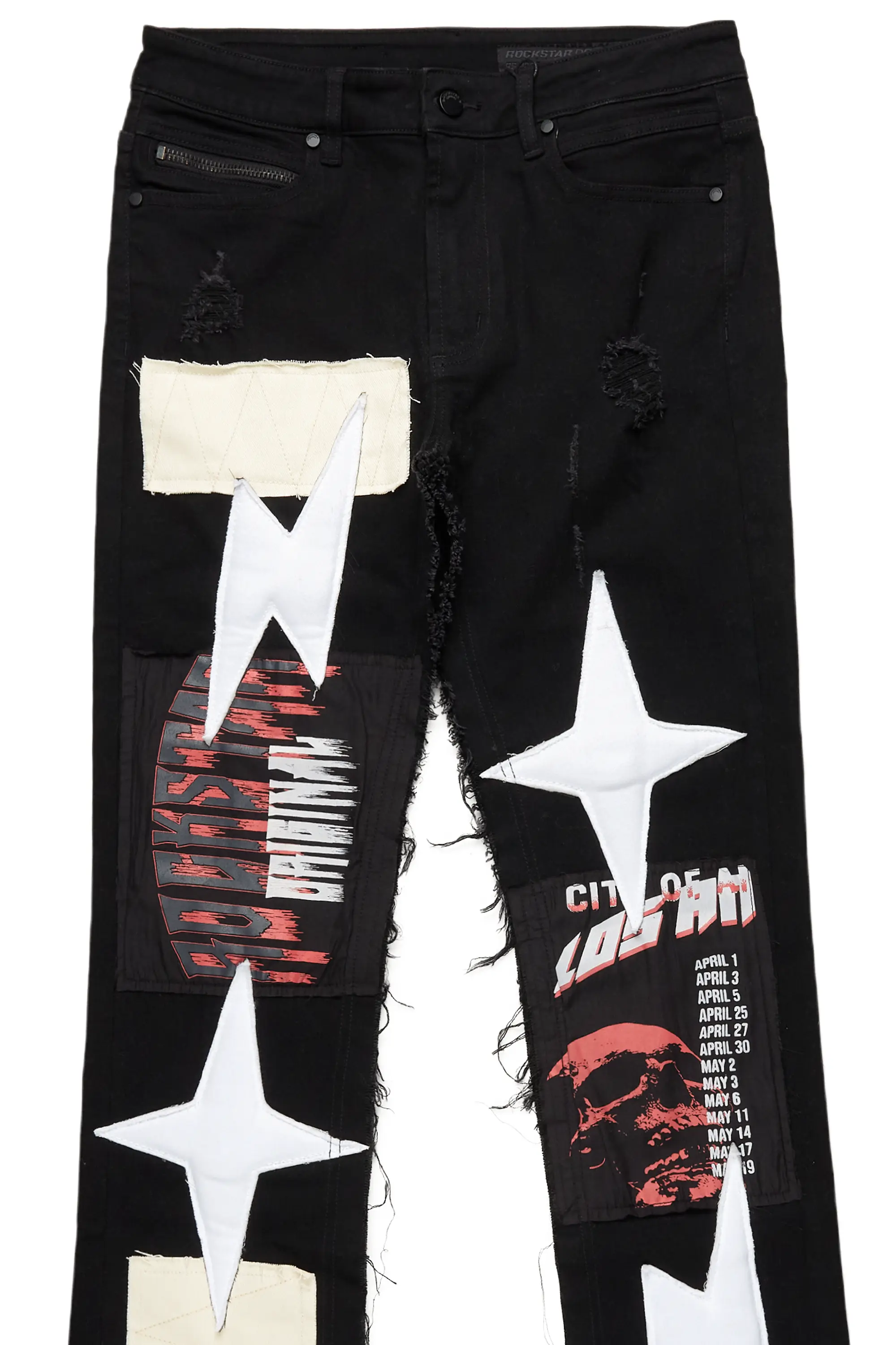 A pair of urban stacked denim jeans for men in black. Designed with organic cotton and custom patchwork for a dope streetwear style.