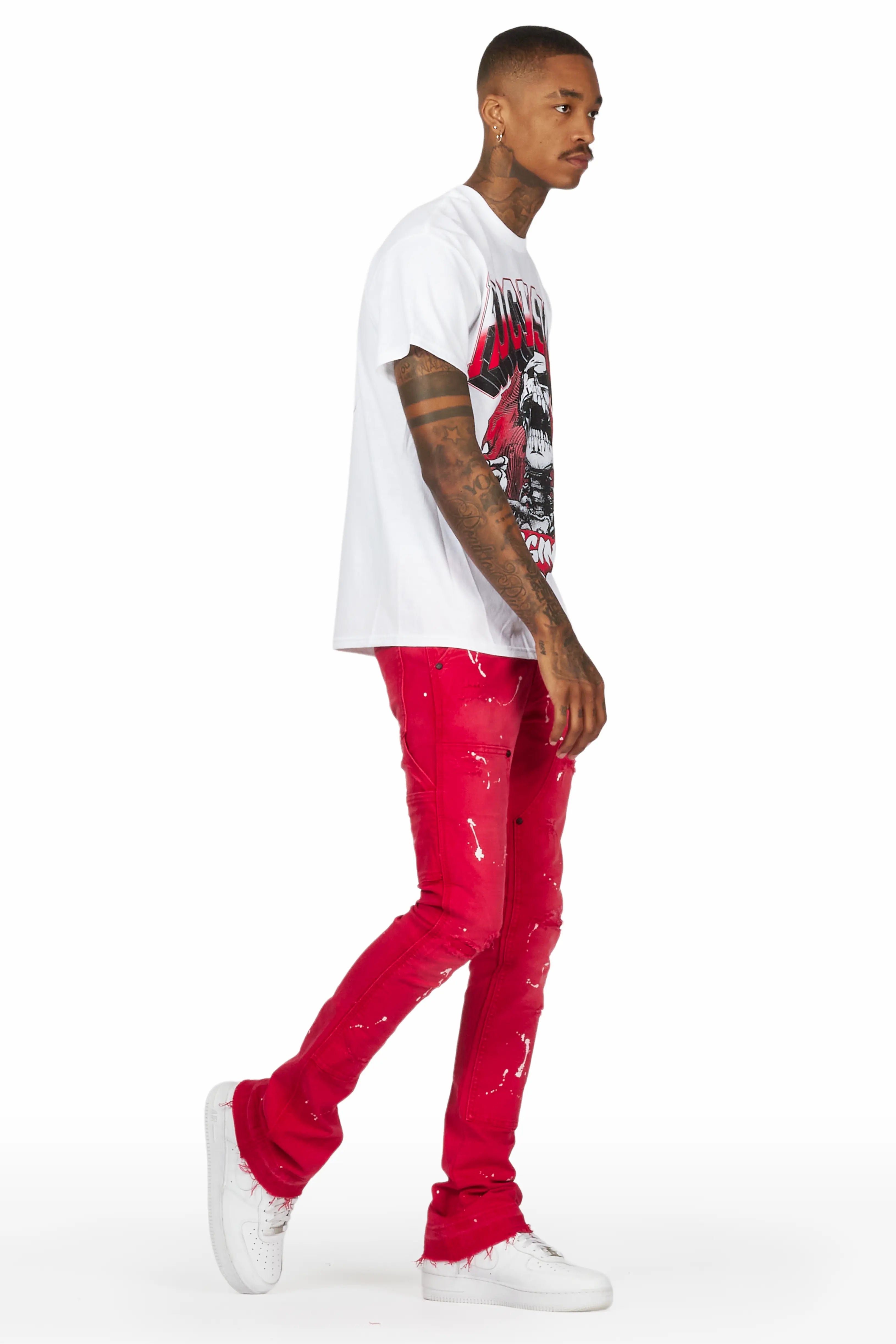 An urban stacked flare denim jean for men in red. Designed with organic cotton and extra long legs for a dope streetwear style.