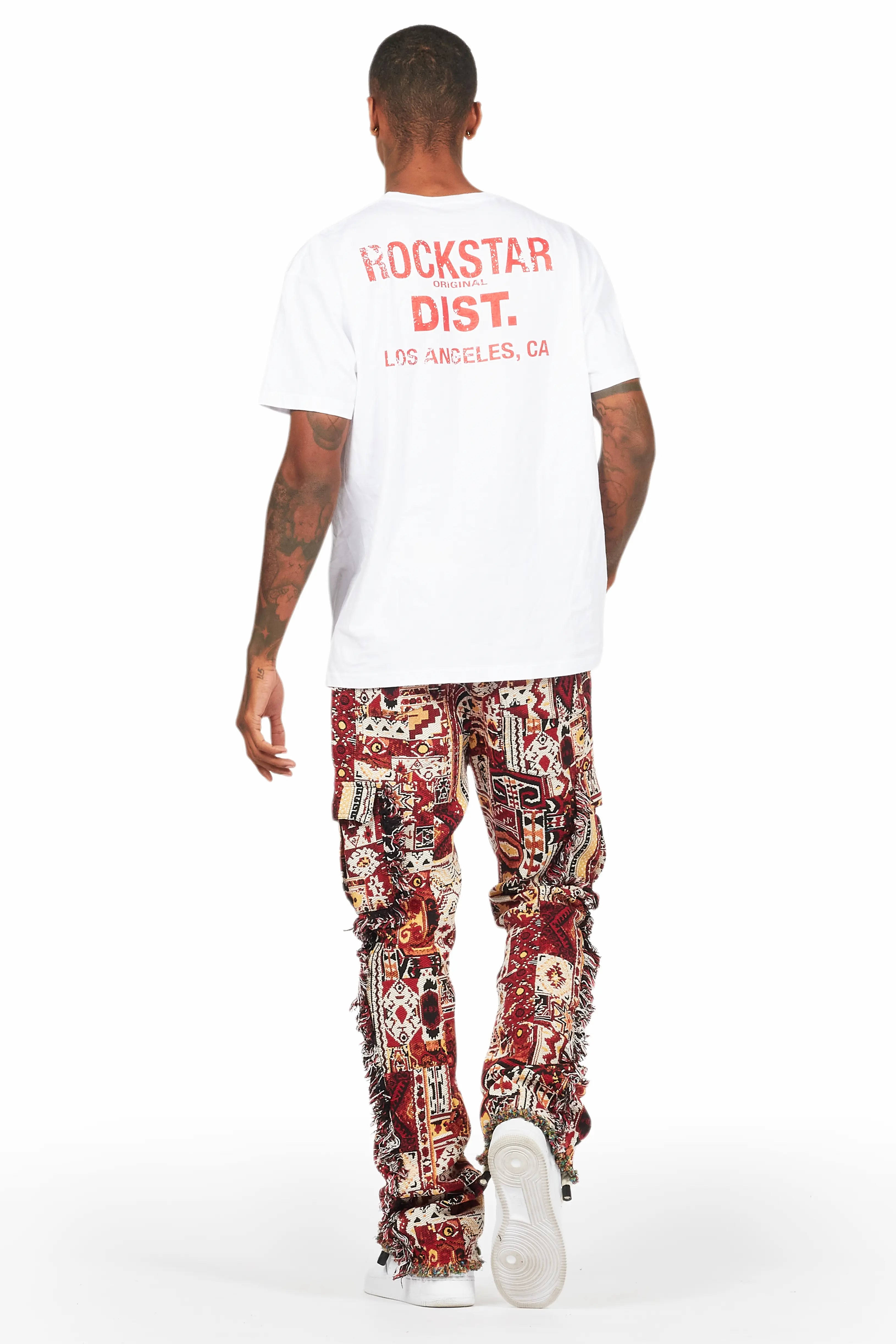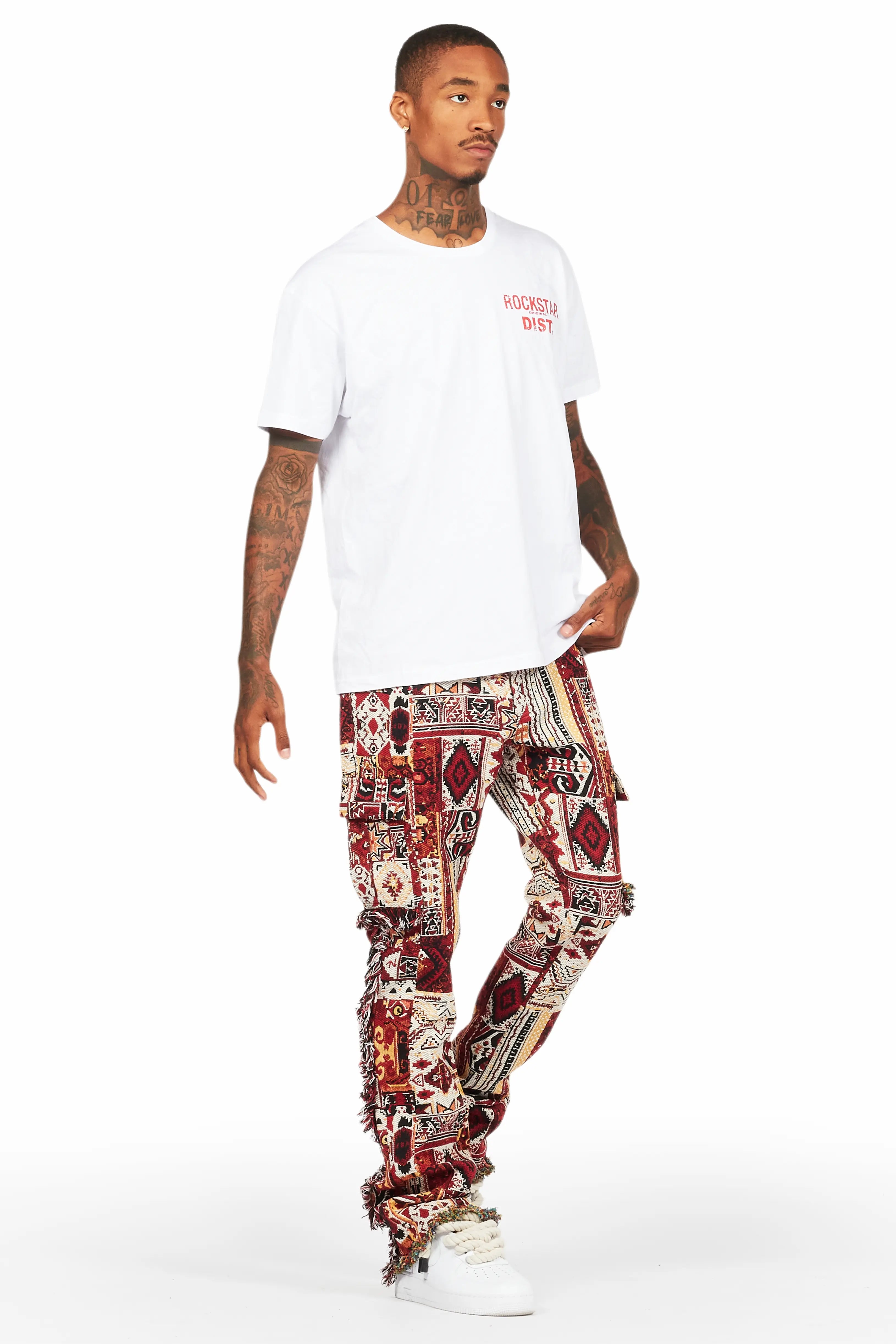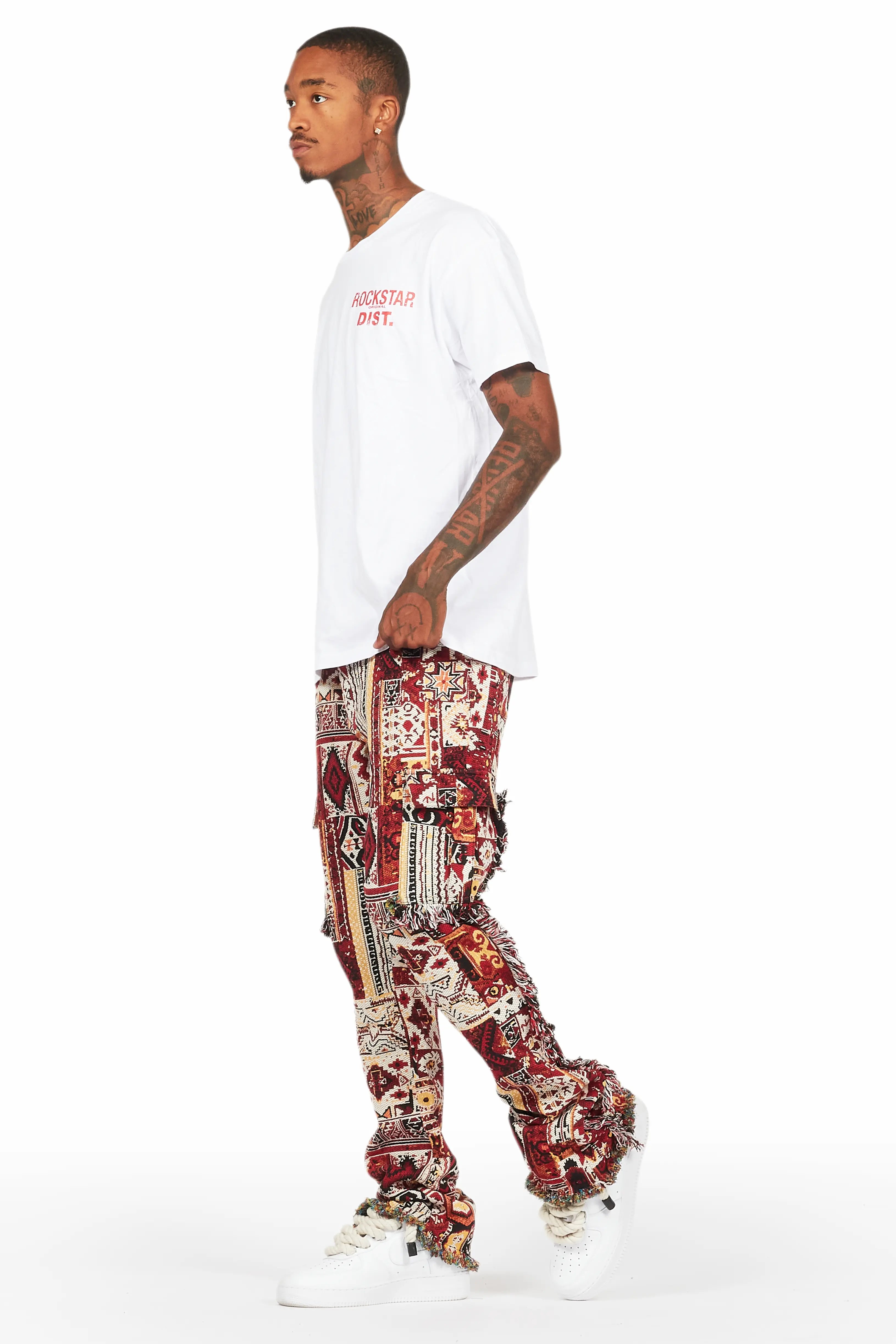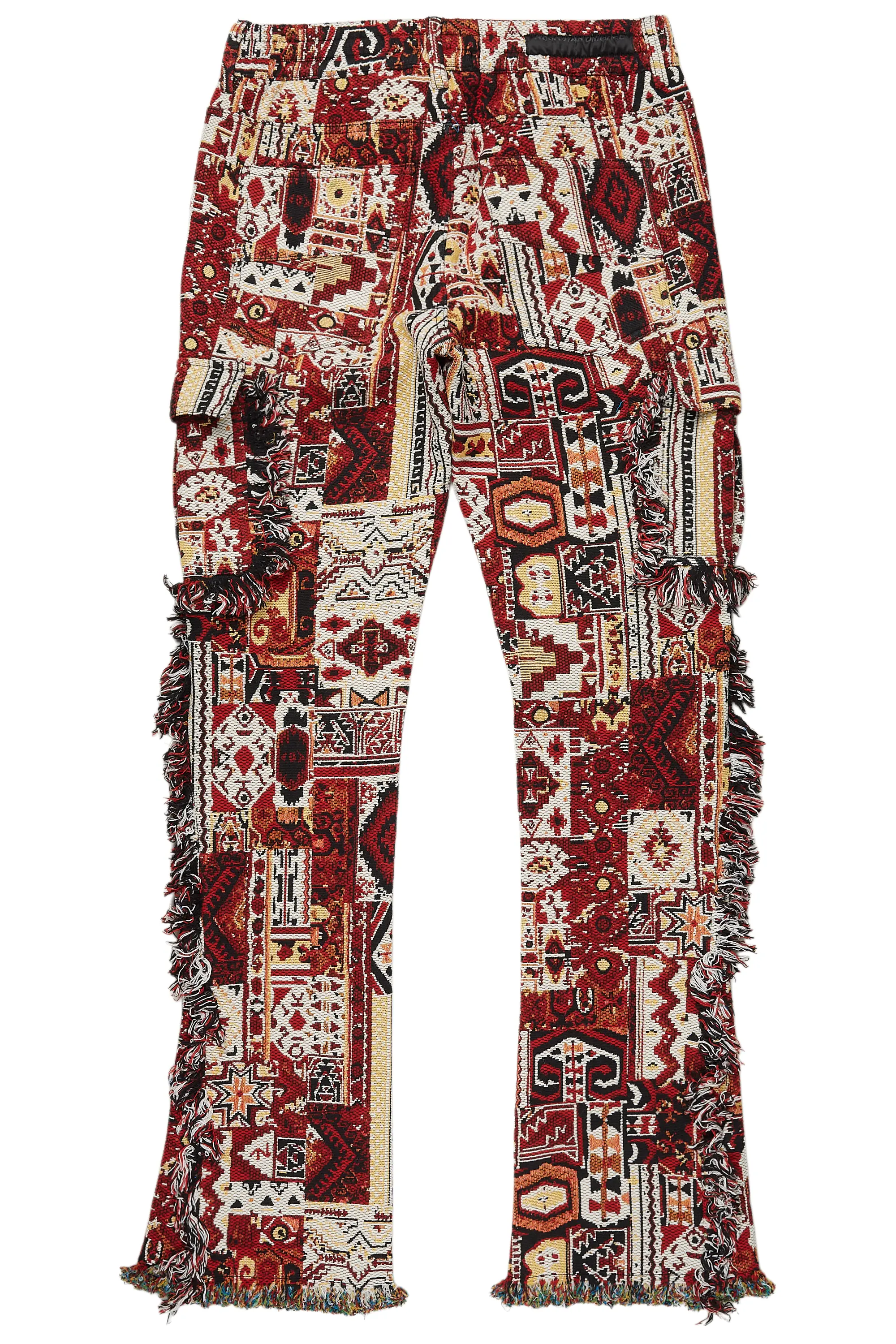 An urban cargo jean for men in pink. Designed with organic cotton and custom hand-woven tapestry details for a dope denim streetwear style.