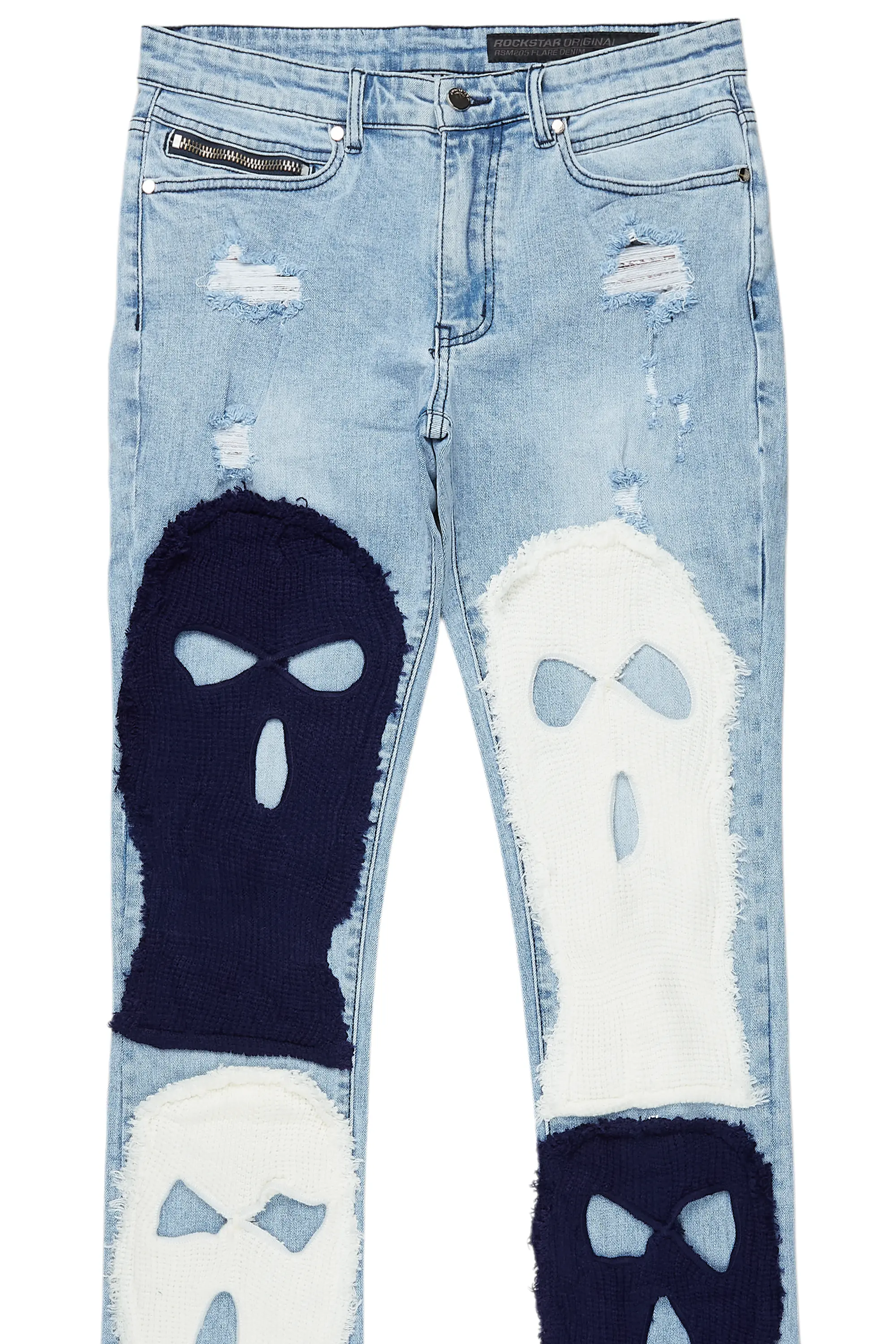 A pair of contemporary stacked patchwork jeans for men in blue. Designed with a retro feel and organic cotton for the perfect everyday style.