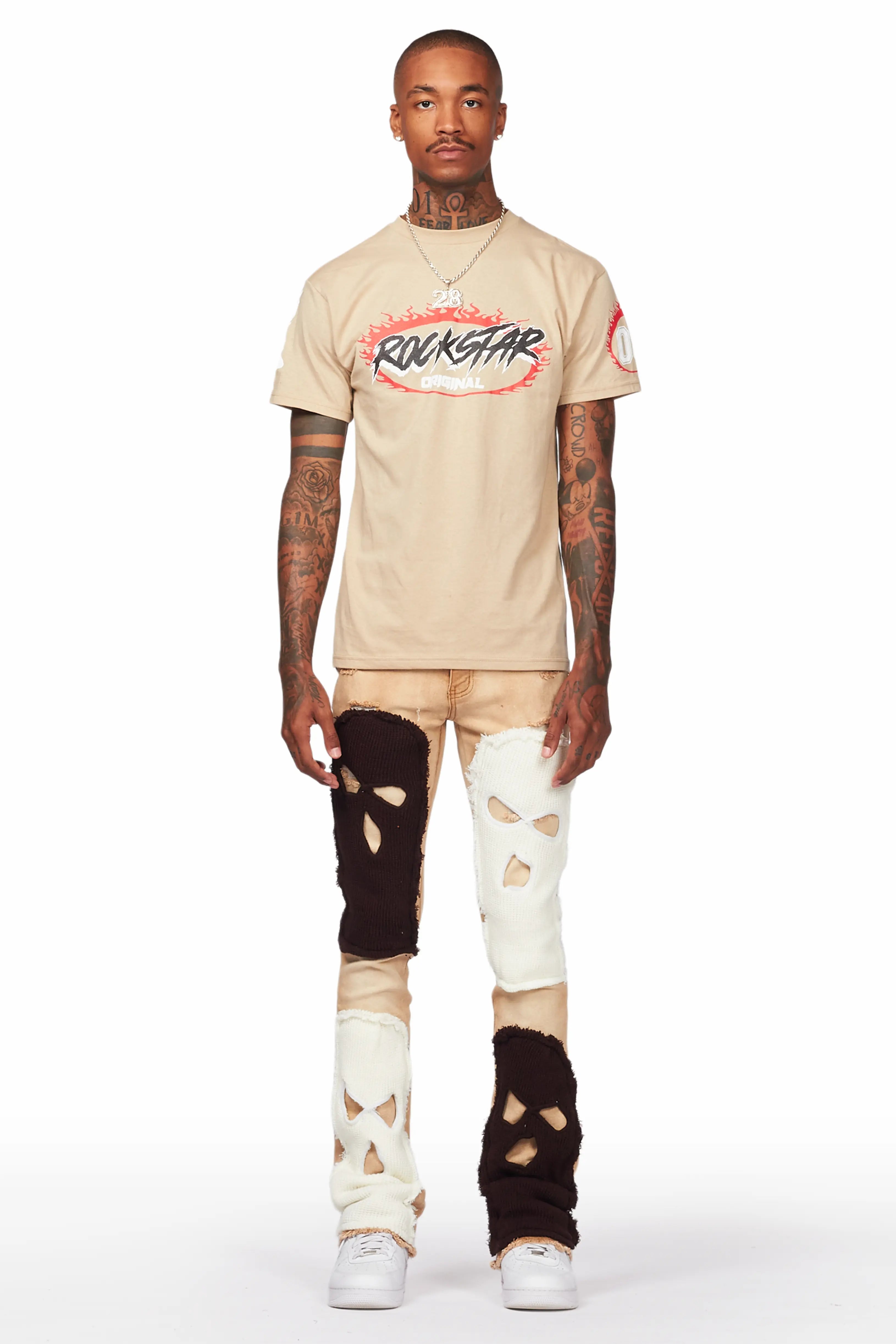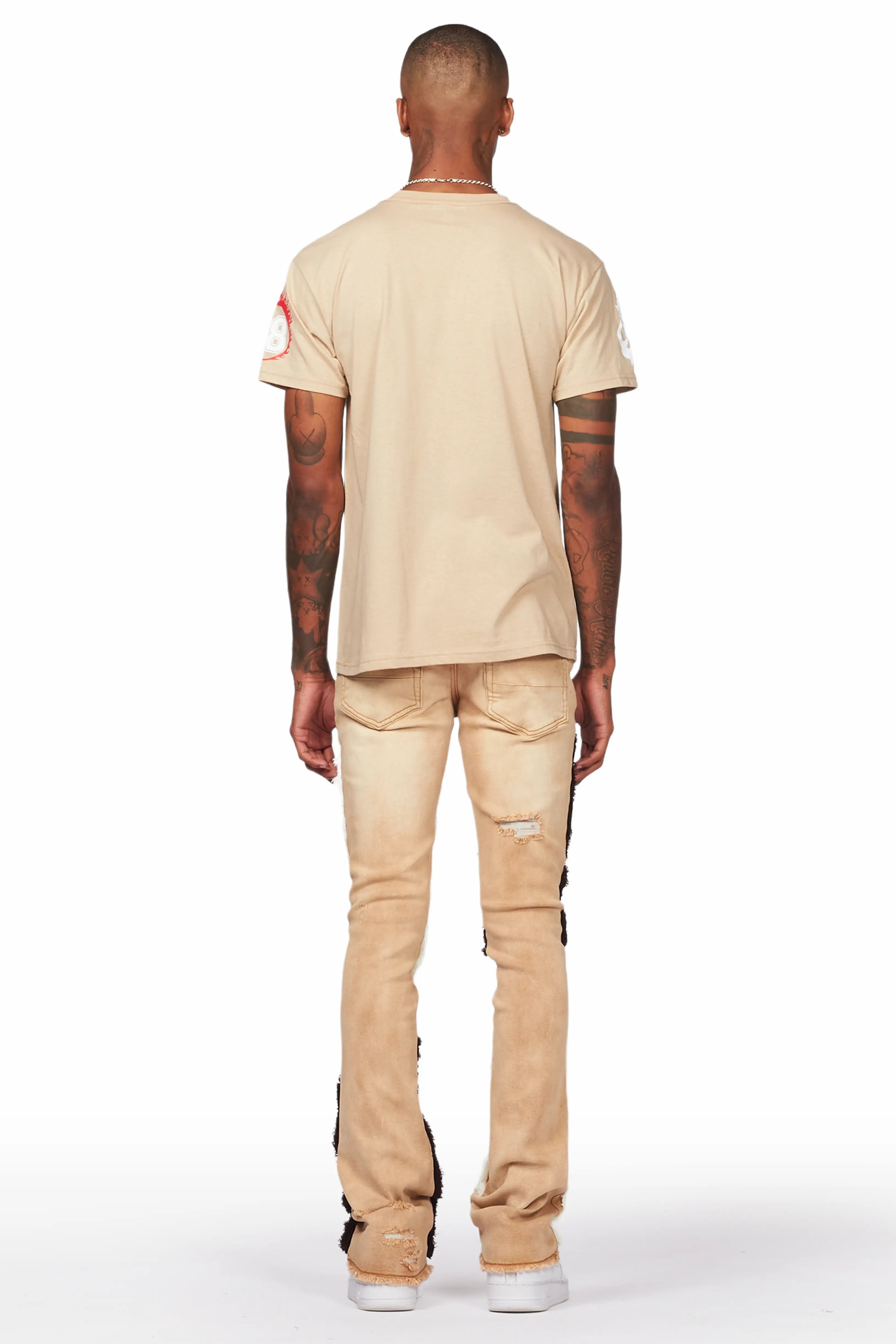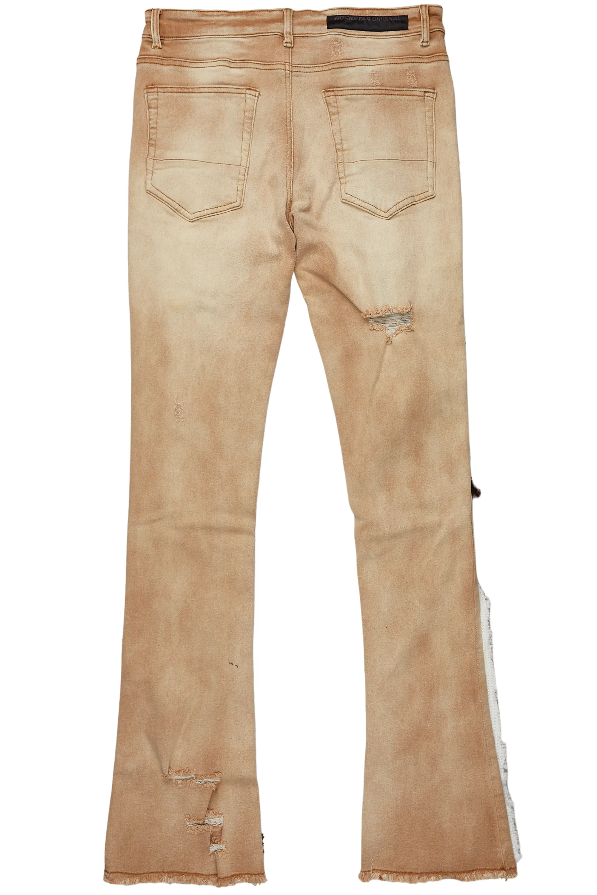 A pair of contemporary stacked patchwork jeans for men in tan. Designed with a retro feel and organic cotton for the perfect everyday style.