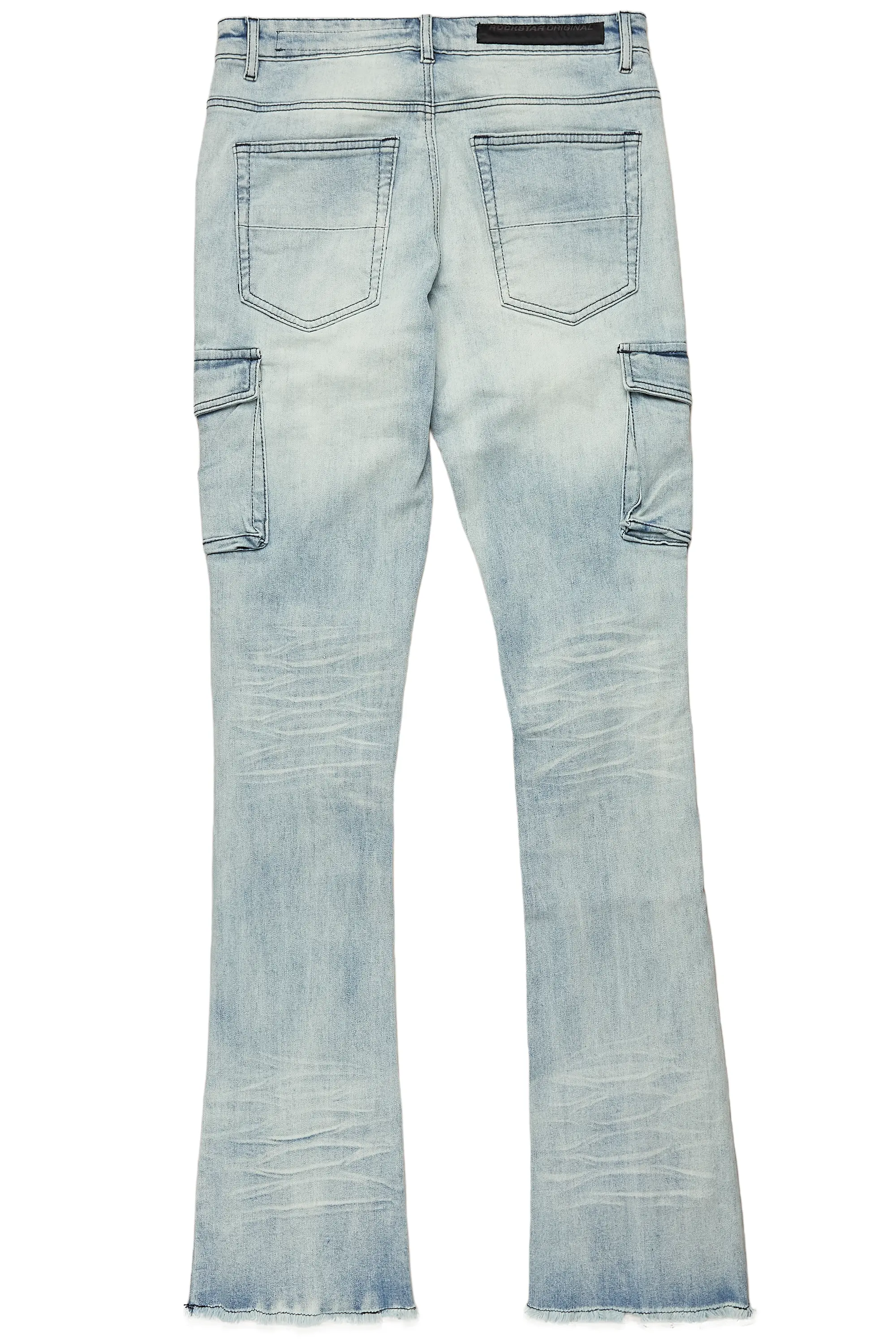 An urban stacked denim cargo jean for men in light blue. Designed with organic cotton and extra long legs for an essential streetwear style.