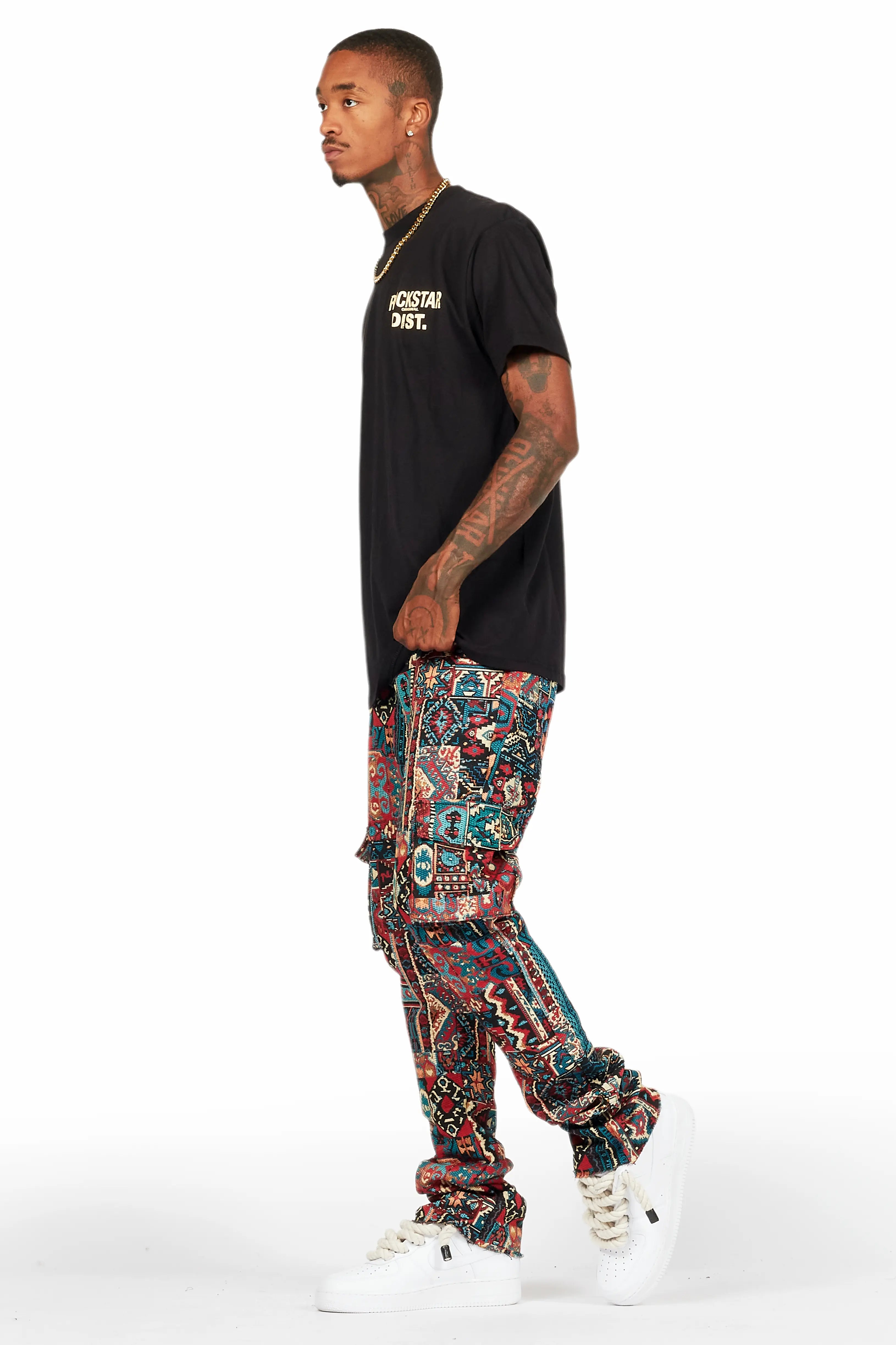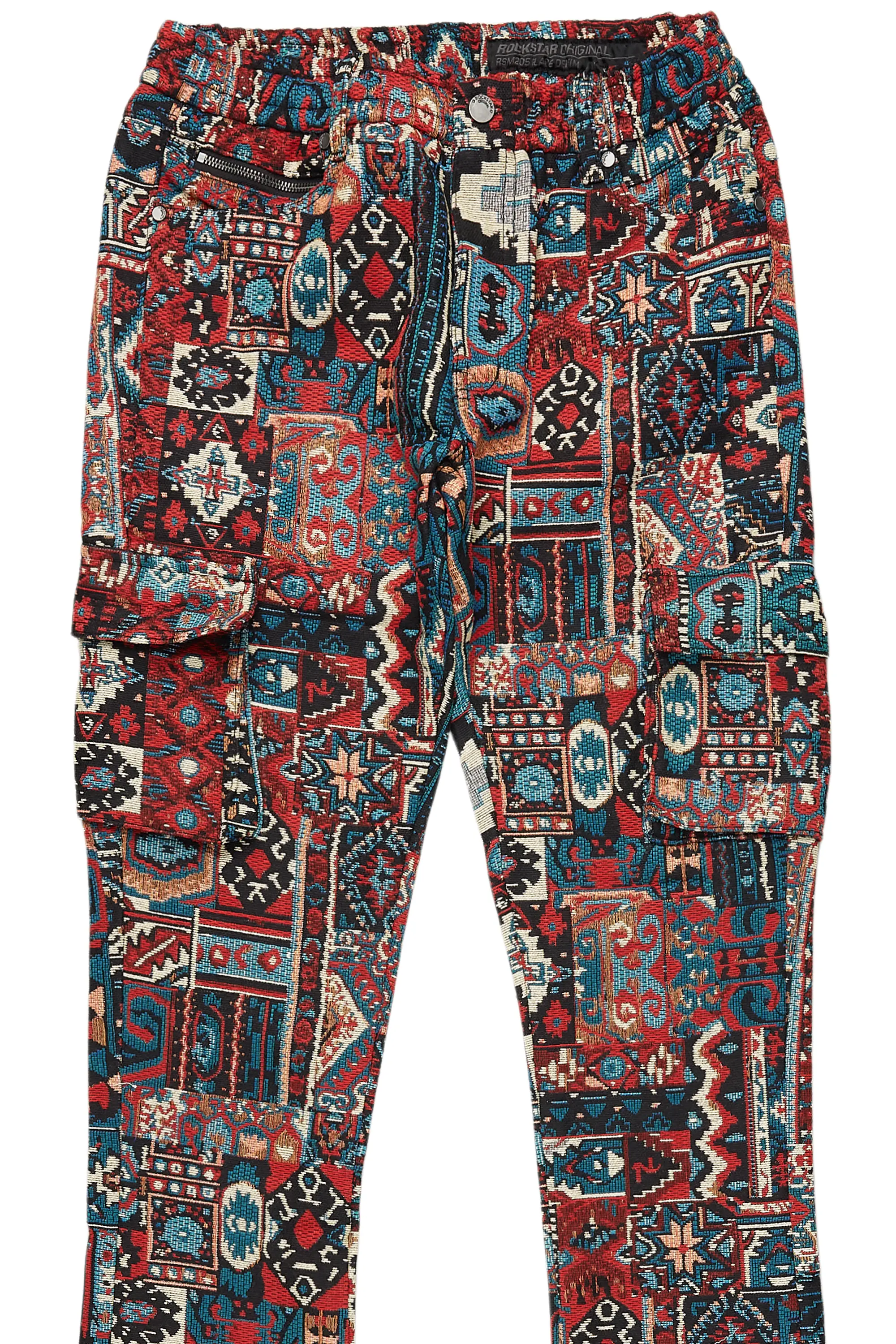 An urban cargo stacked tapestry jean for men in red. Designed with organic cotton and utility pockets for a dope denim streetwear style.