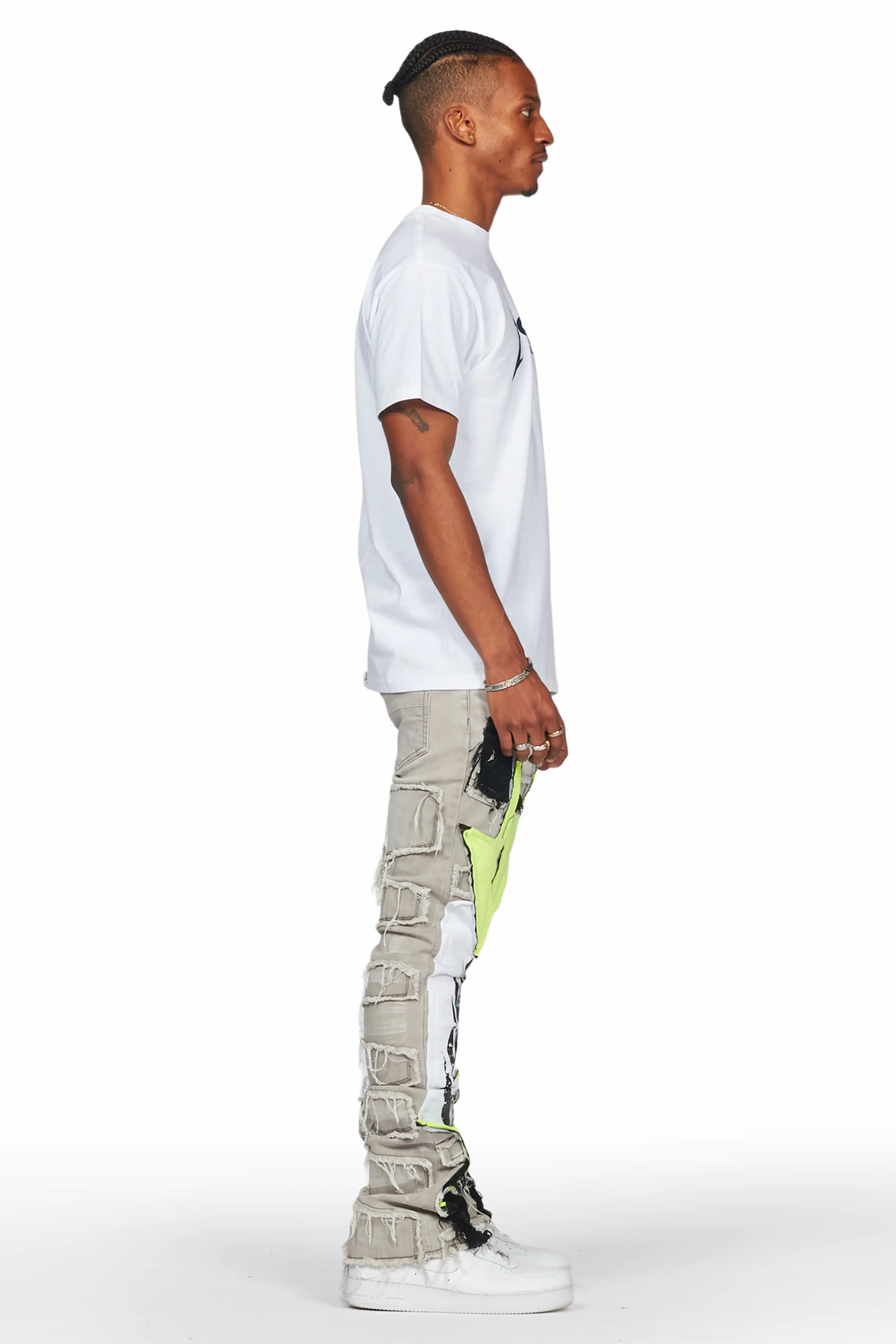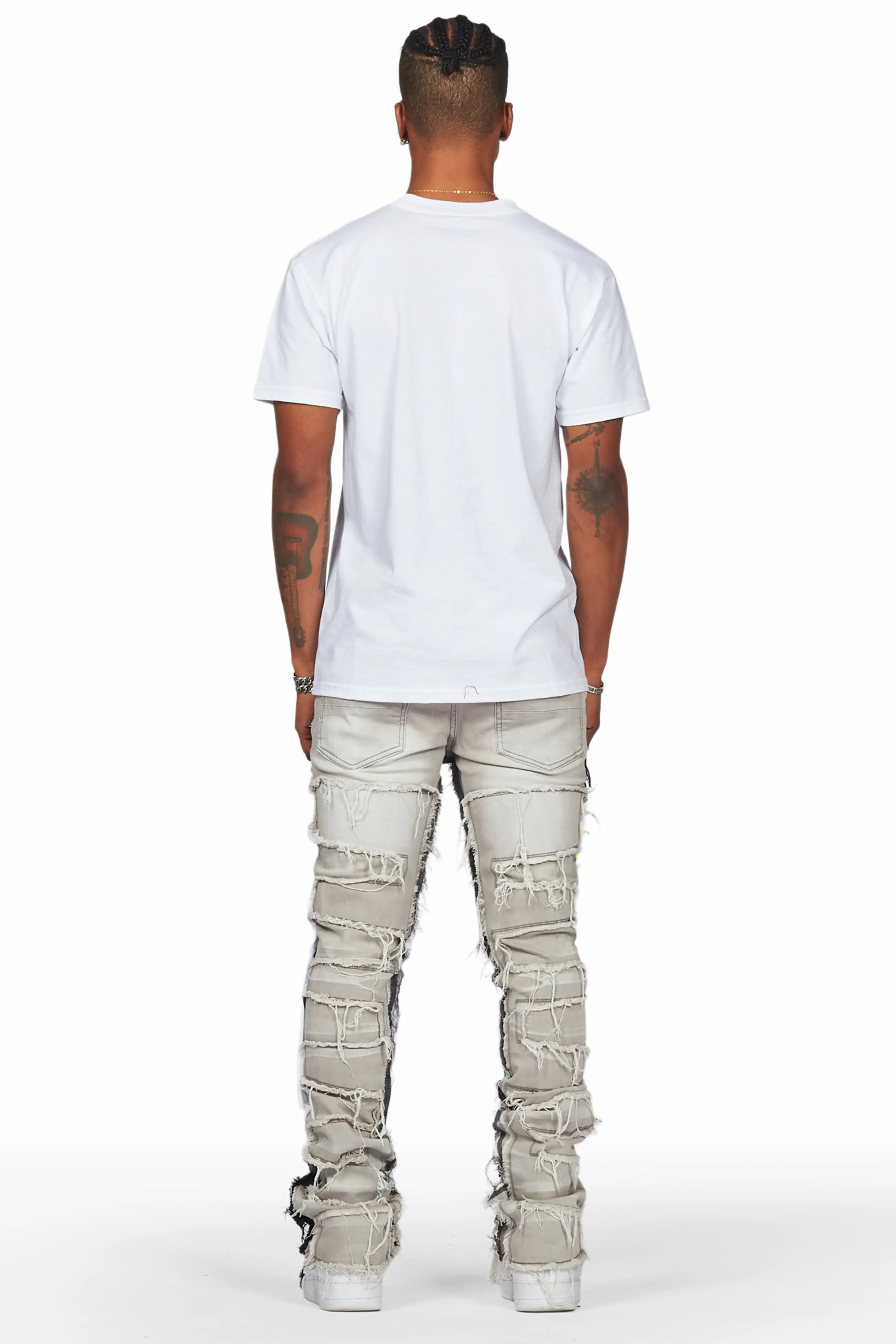 A pair of urban stacked denim jeans for men in grey. Designed with organic cotton and custom patchwork for a dope streetwear style.