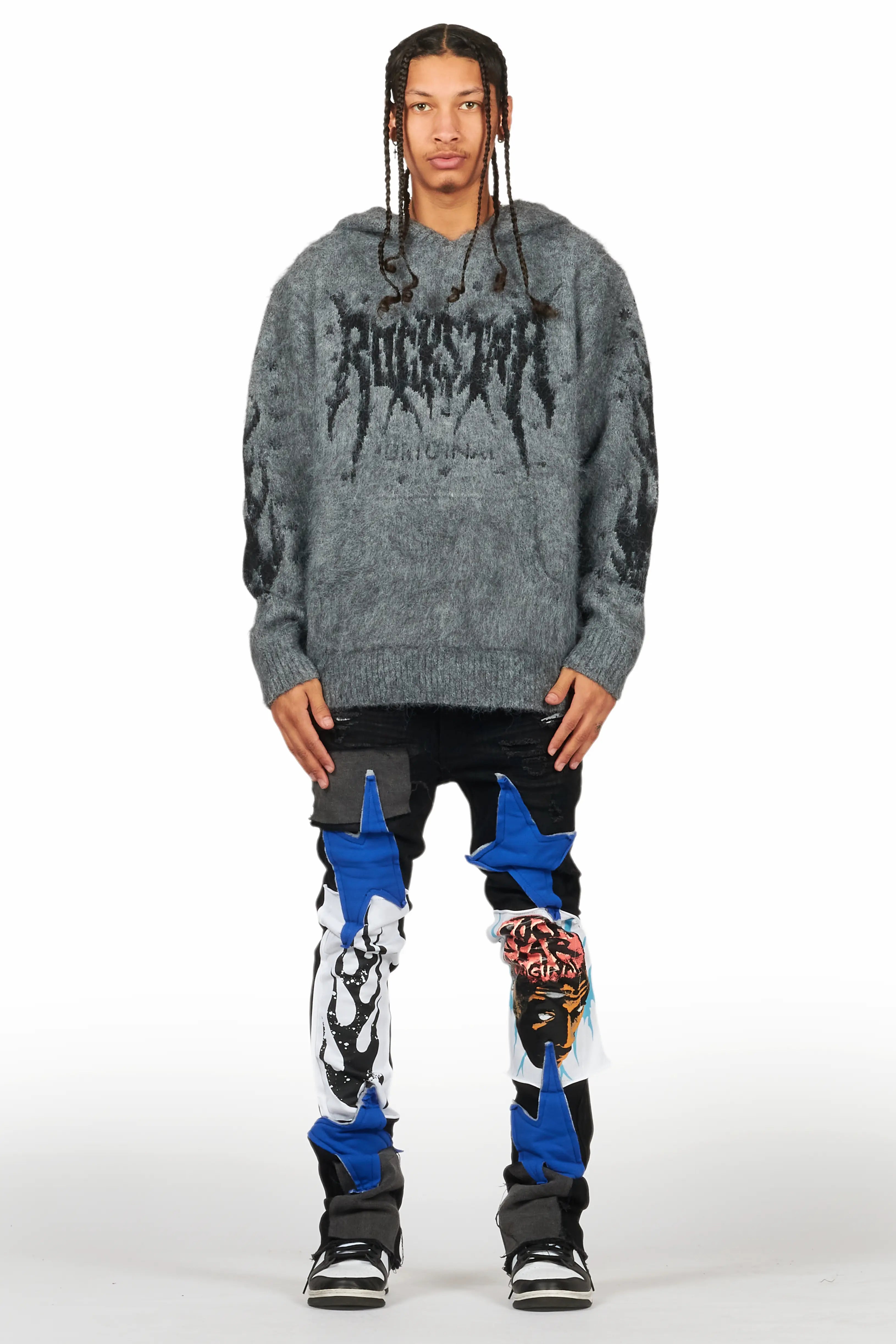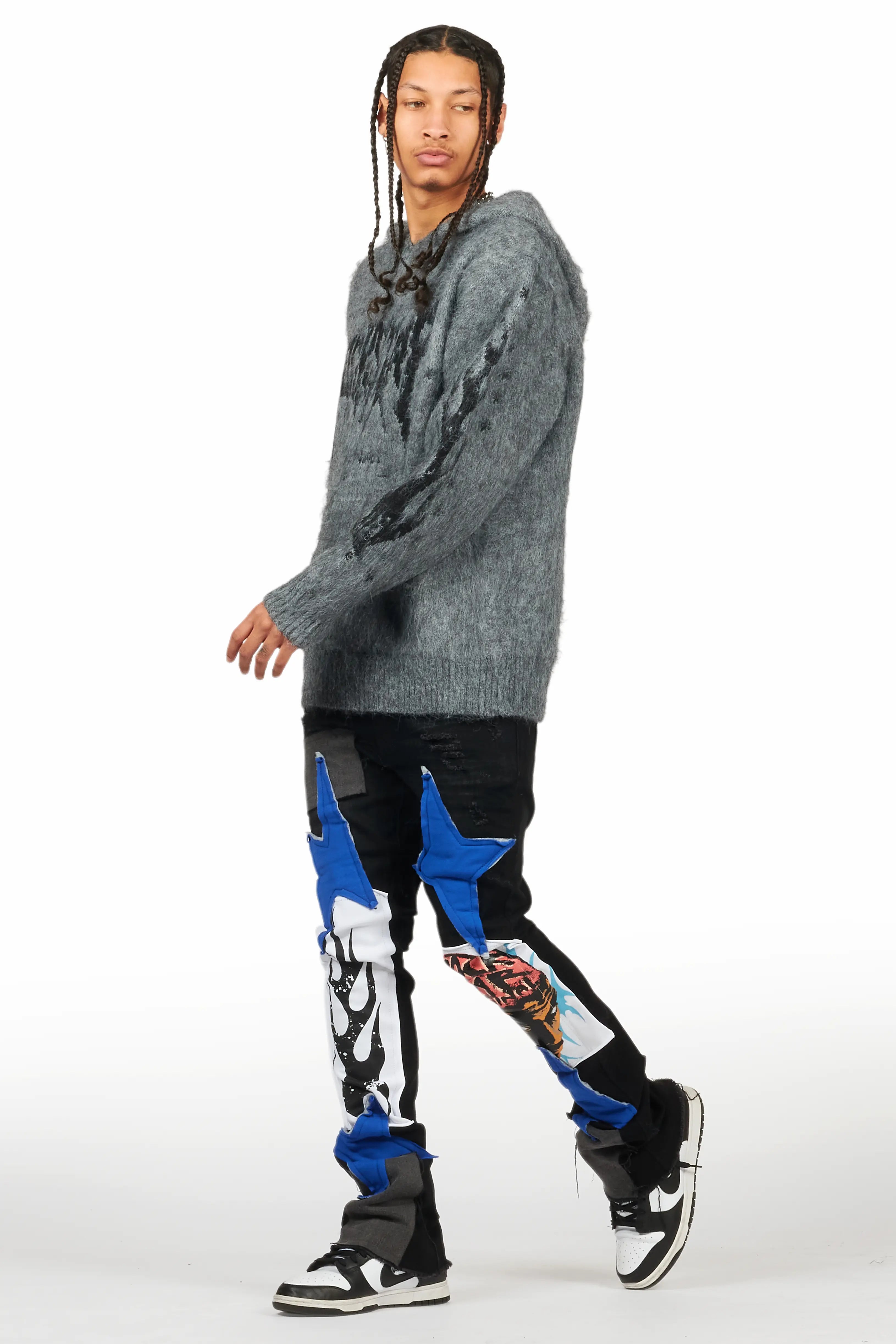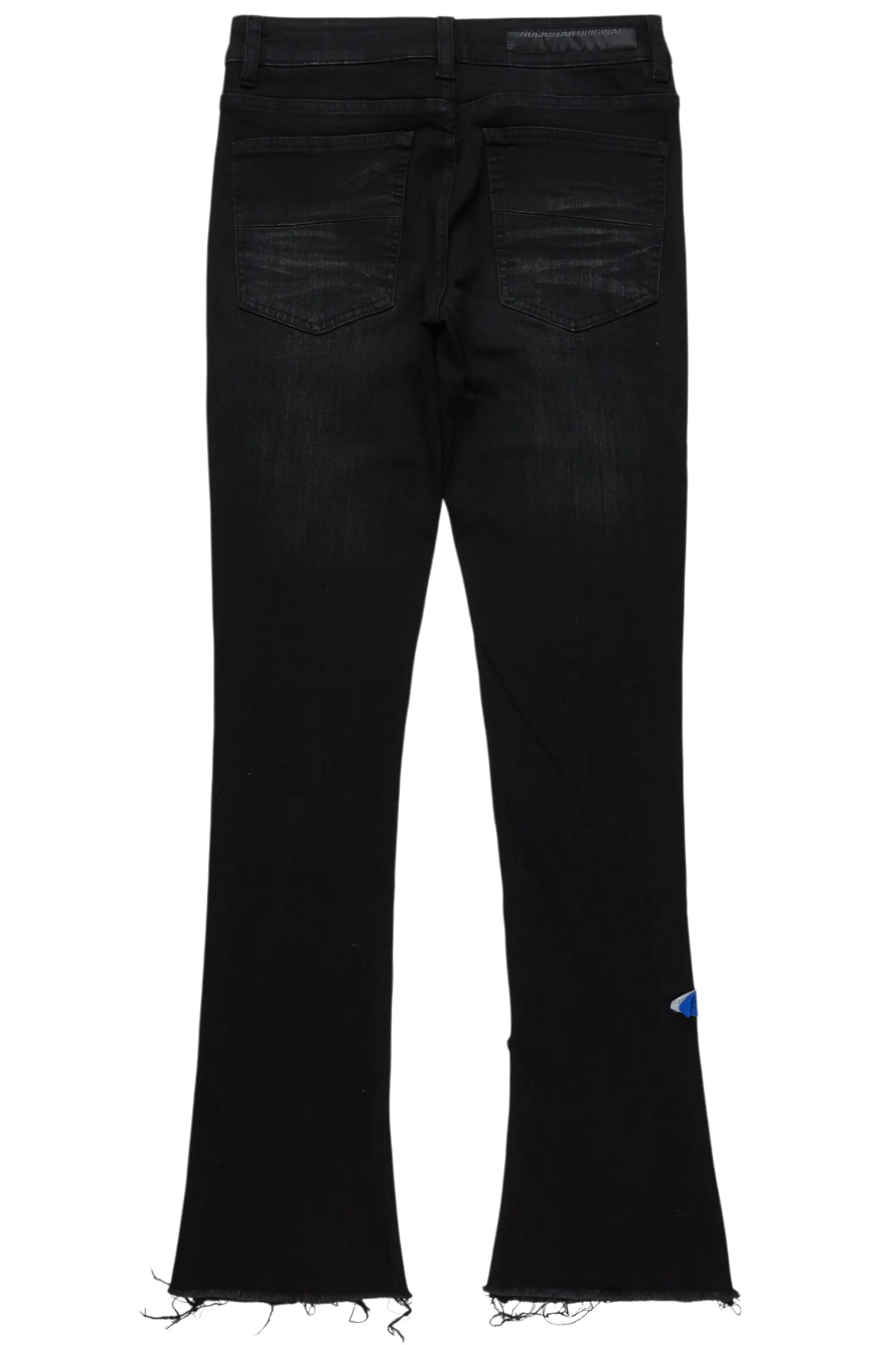 A pair of urban stacked denim jeans for men in jet black. Designed with organic cotton and custom patchwork for a dope streetwear style.
