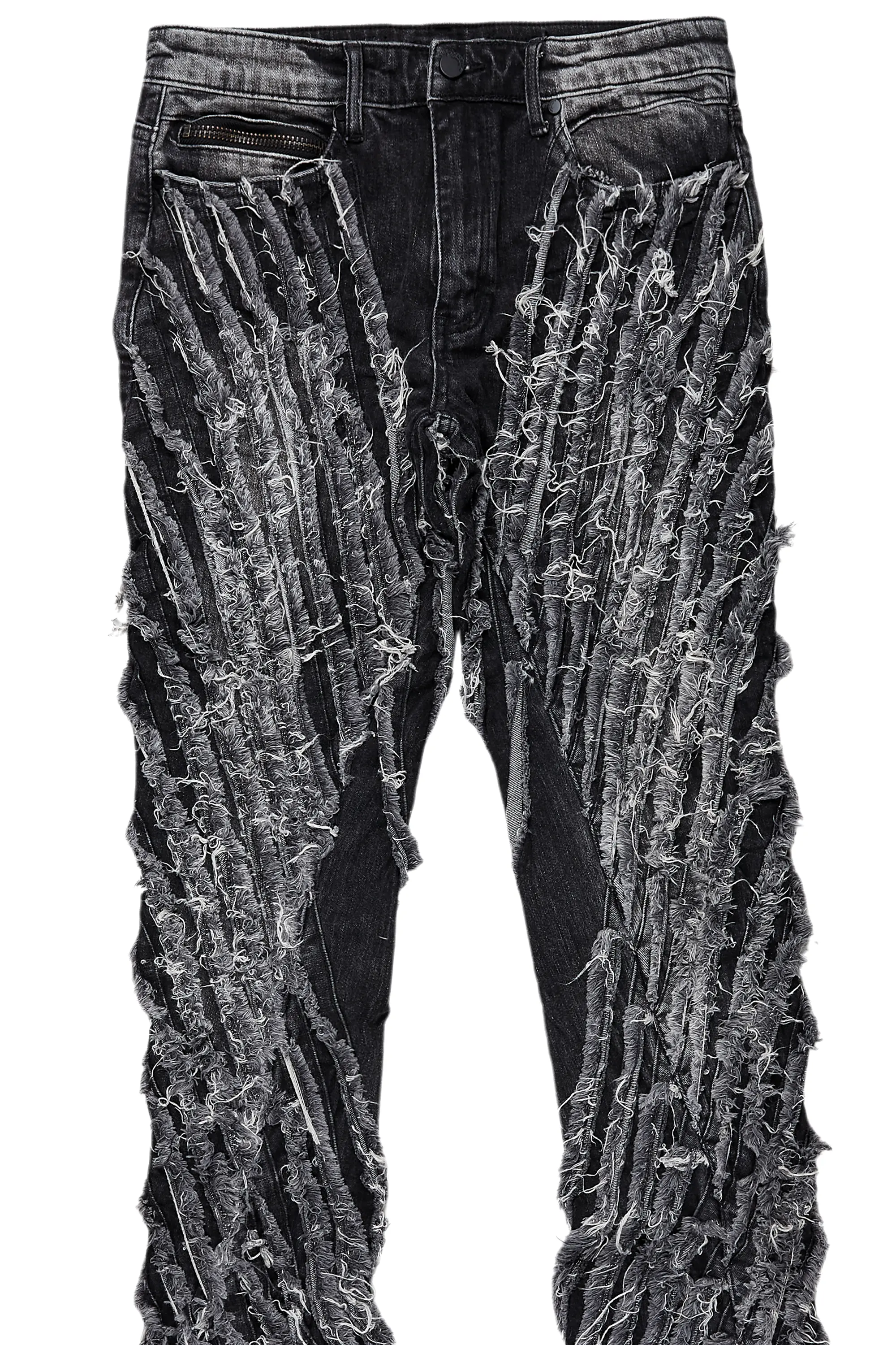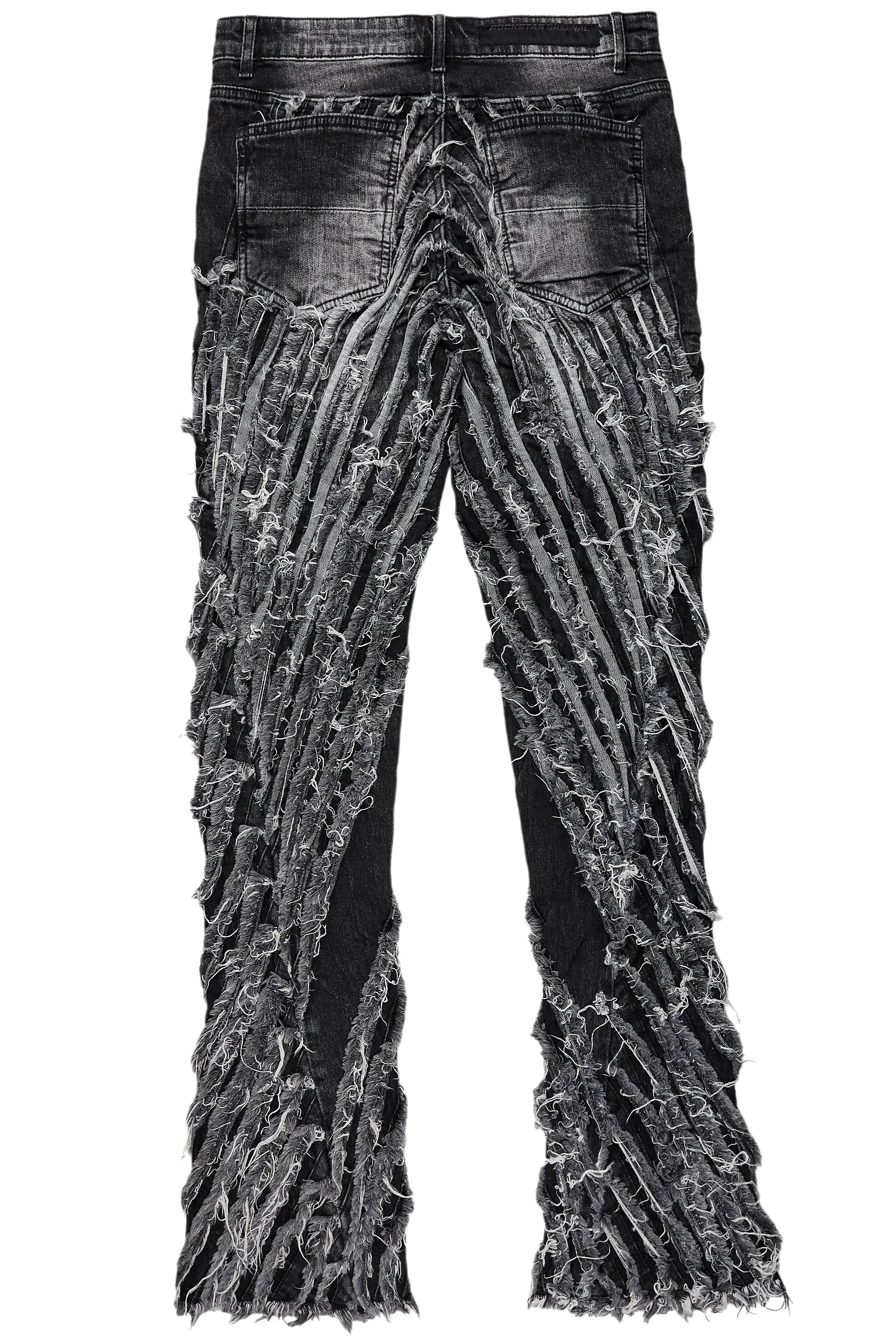 An urban stacked flare denim jean for men in dark grey. Designed with organic cotton and extra long legs for an essential streetwear style.