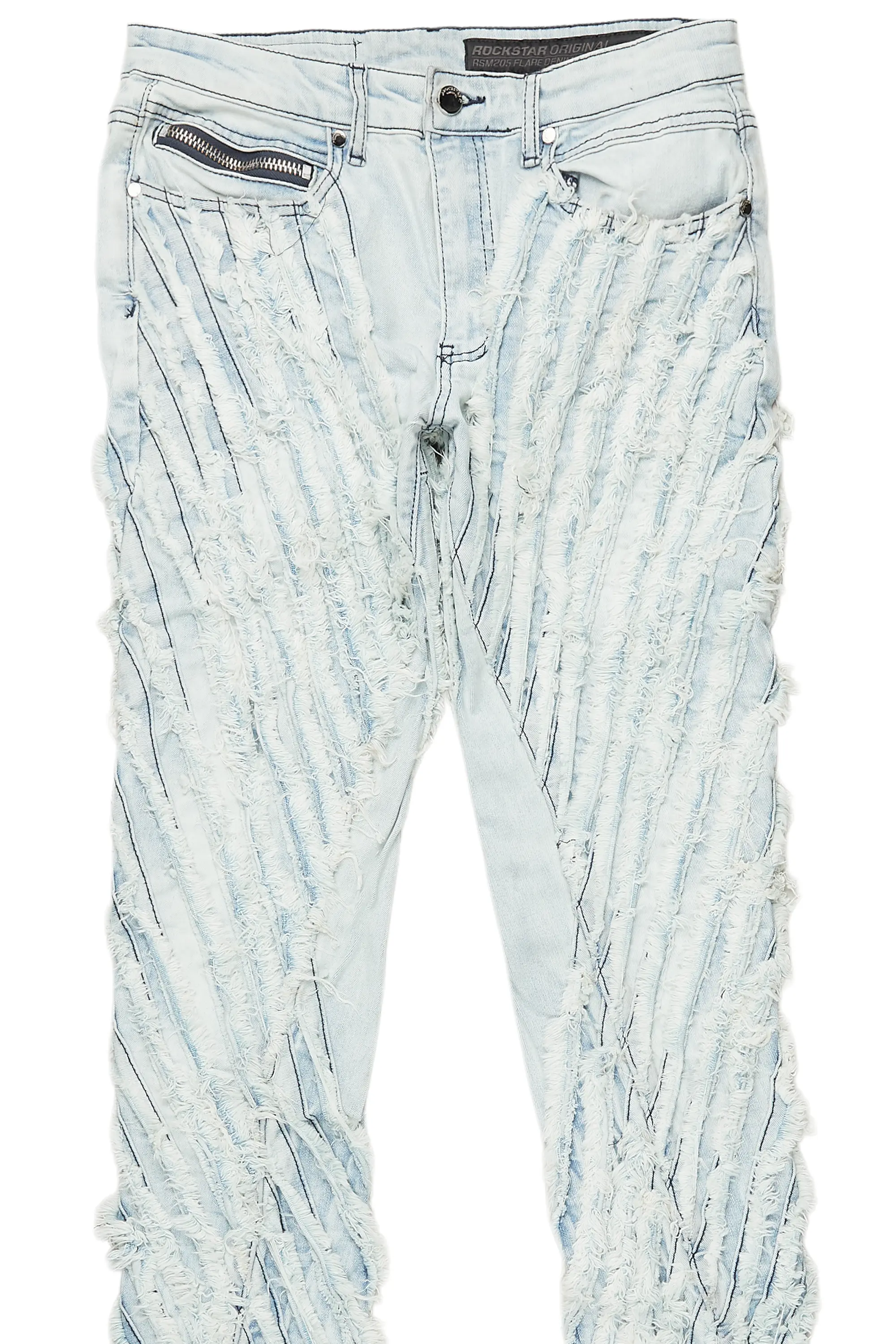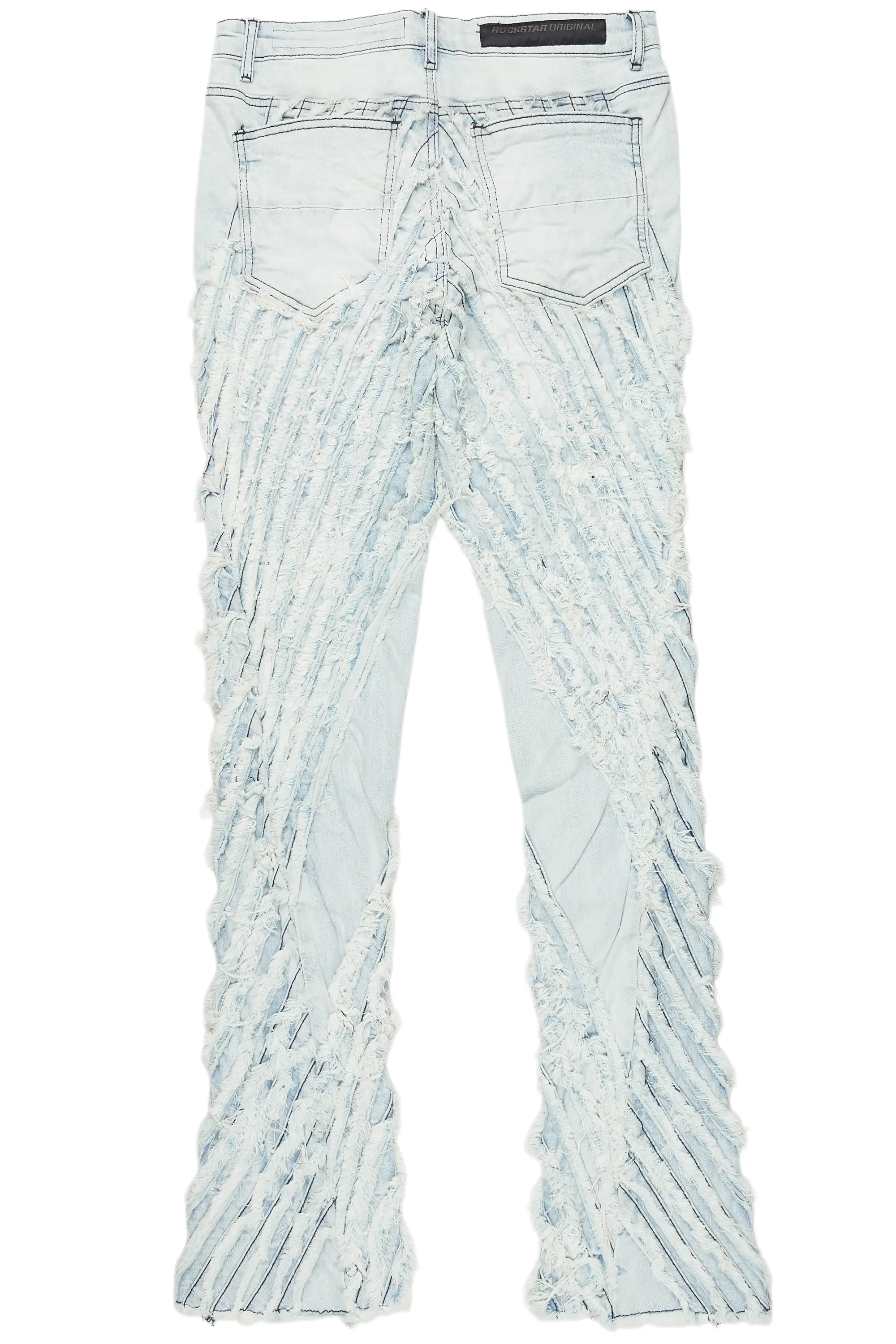 An urban stacked flare denim jean for men in light blue. Designed with organic cotton and extra long legs for an essential streetwear style.