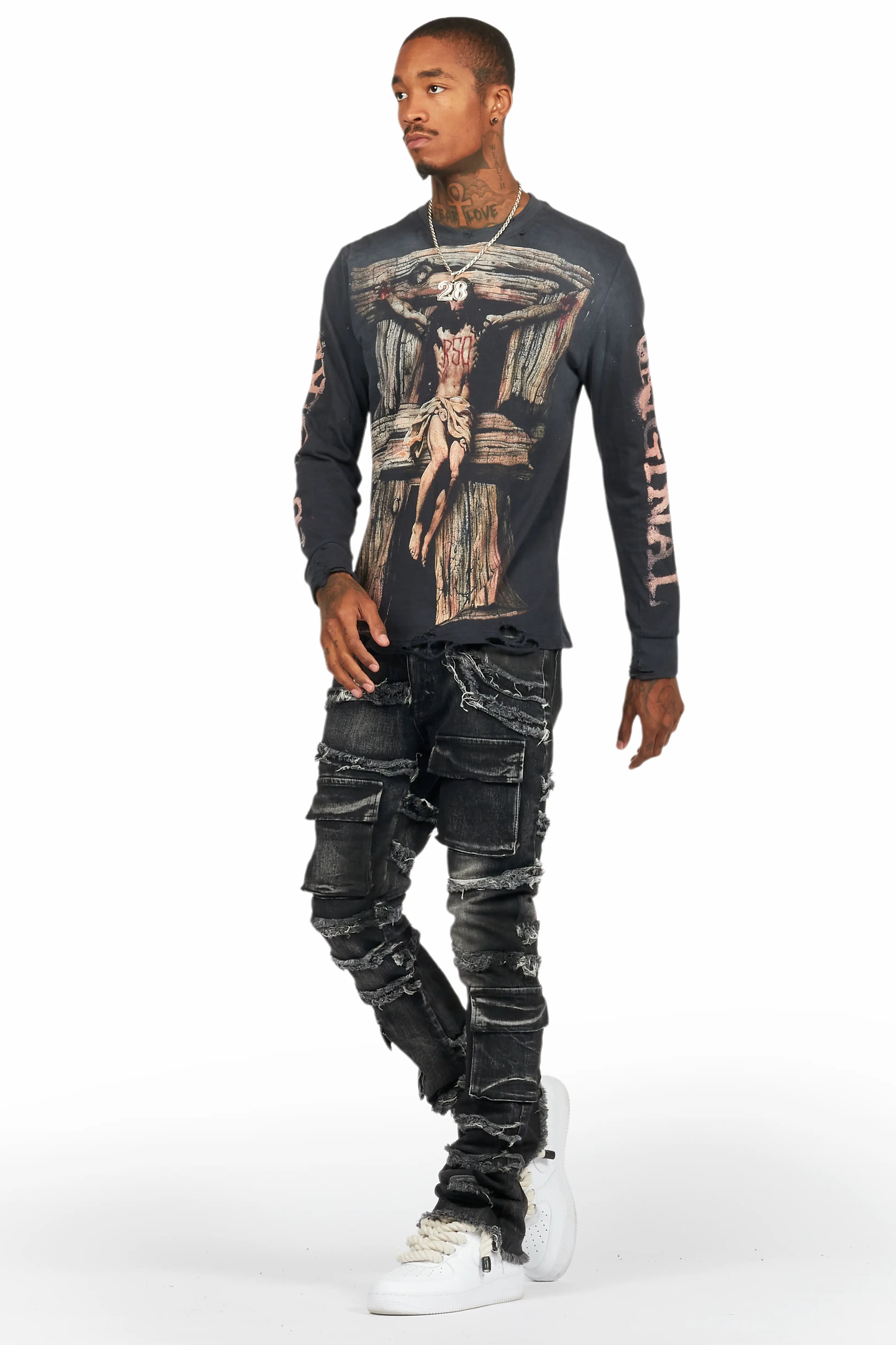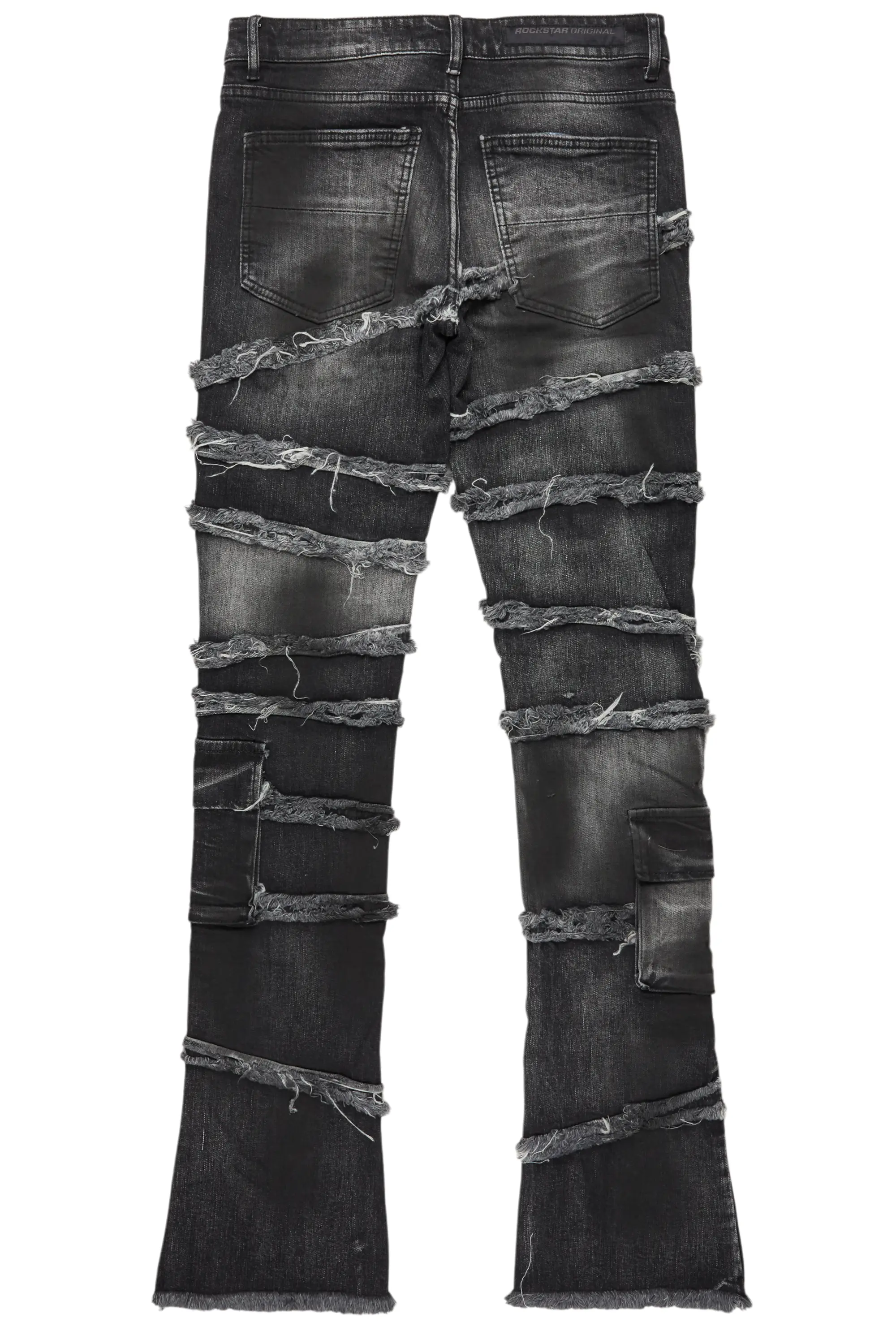 An urban stacked denim jean for men in black. Designed with frayed patterned stitching and extra long legs for a must-cop streetwear staple piece.
