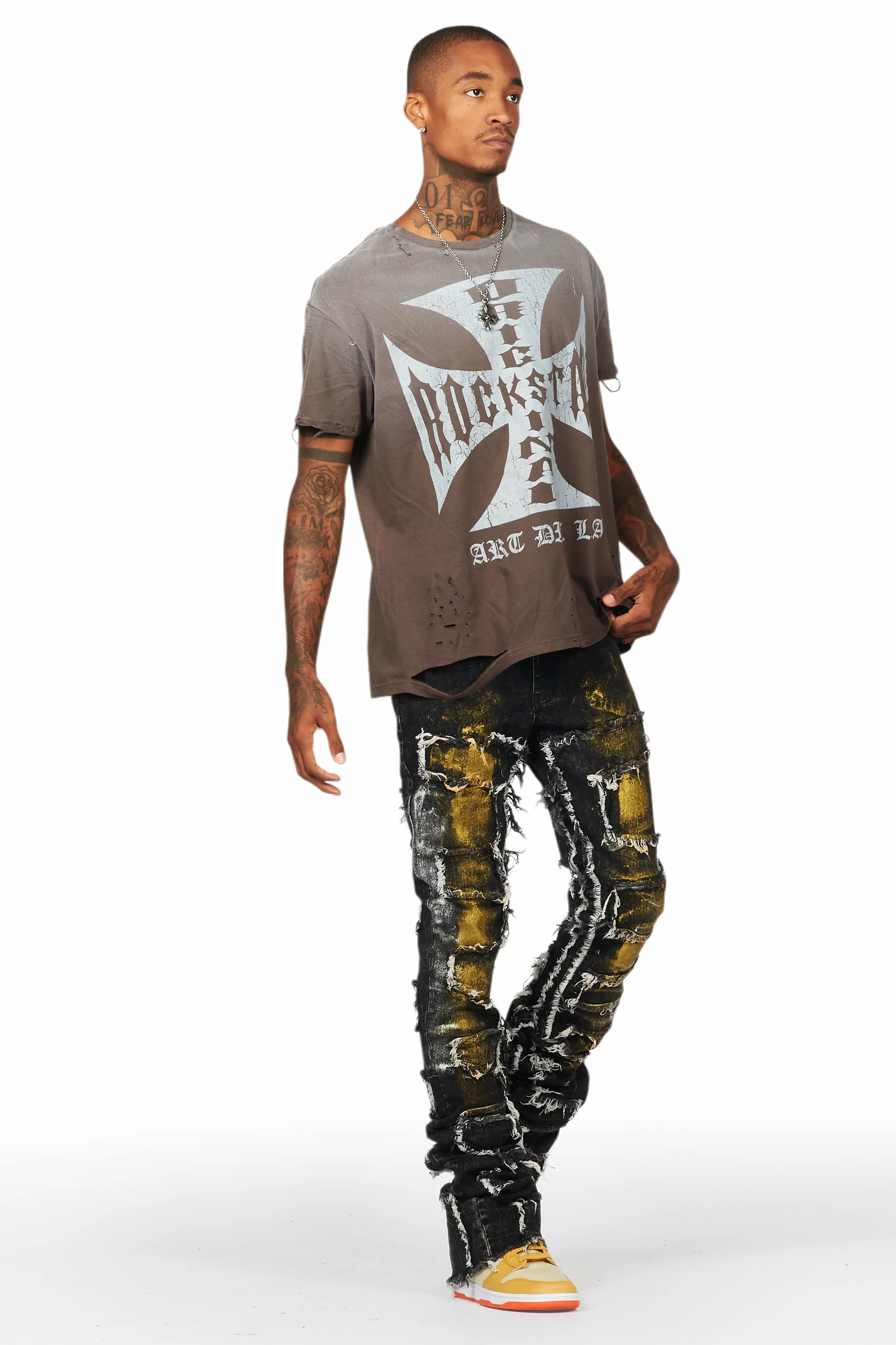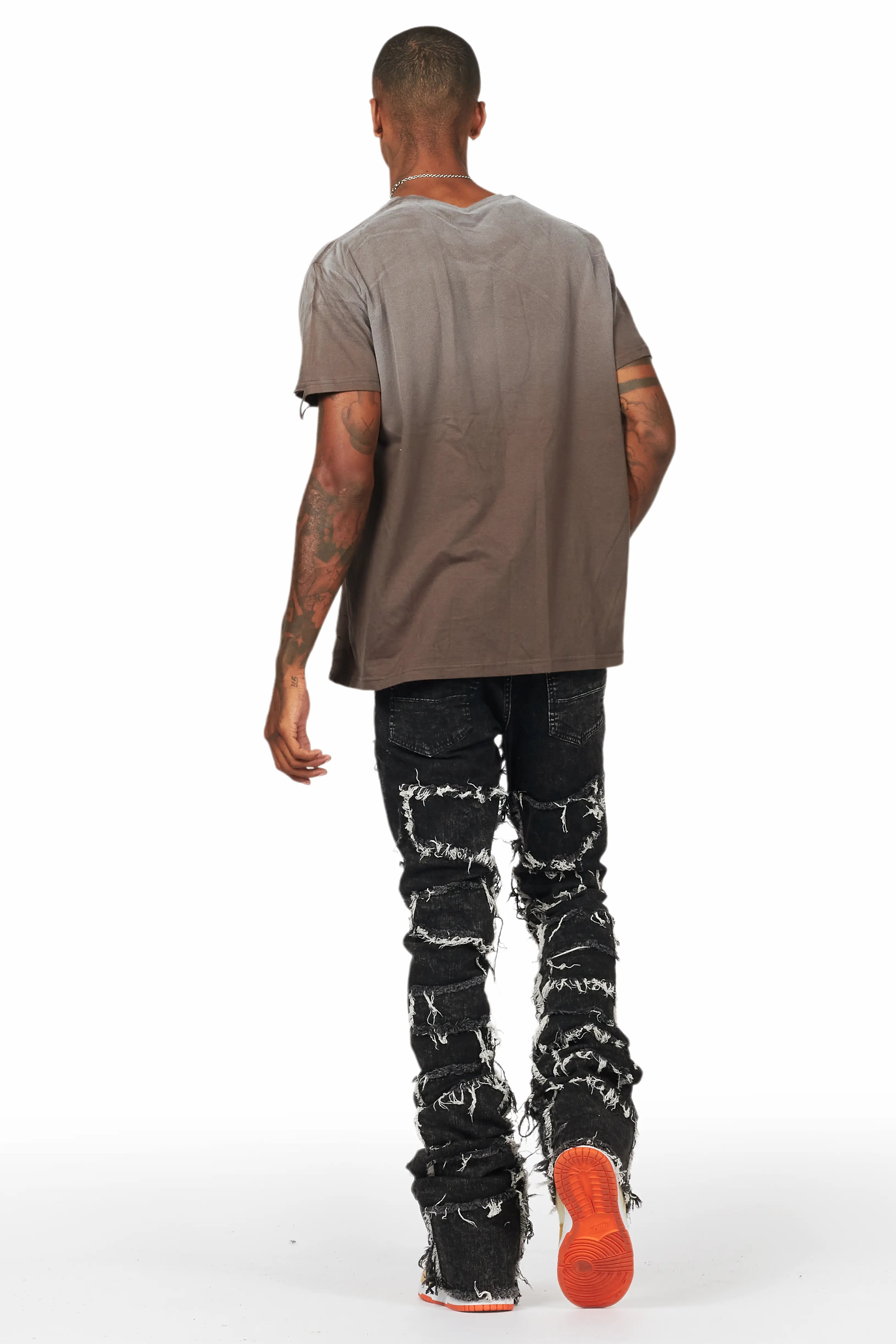 An urban stacked flare denim jean for men in dark grey. Designed with organic cotton and extra long legs for an essential streetwear style.