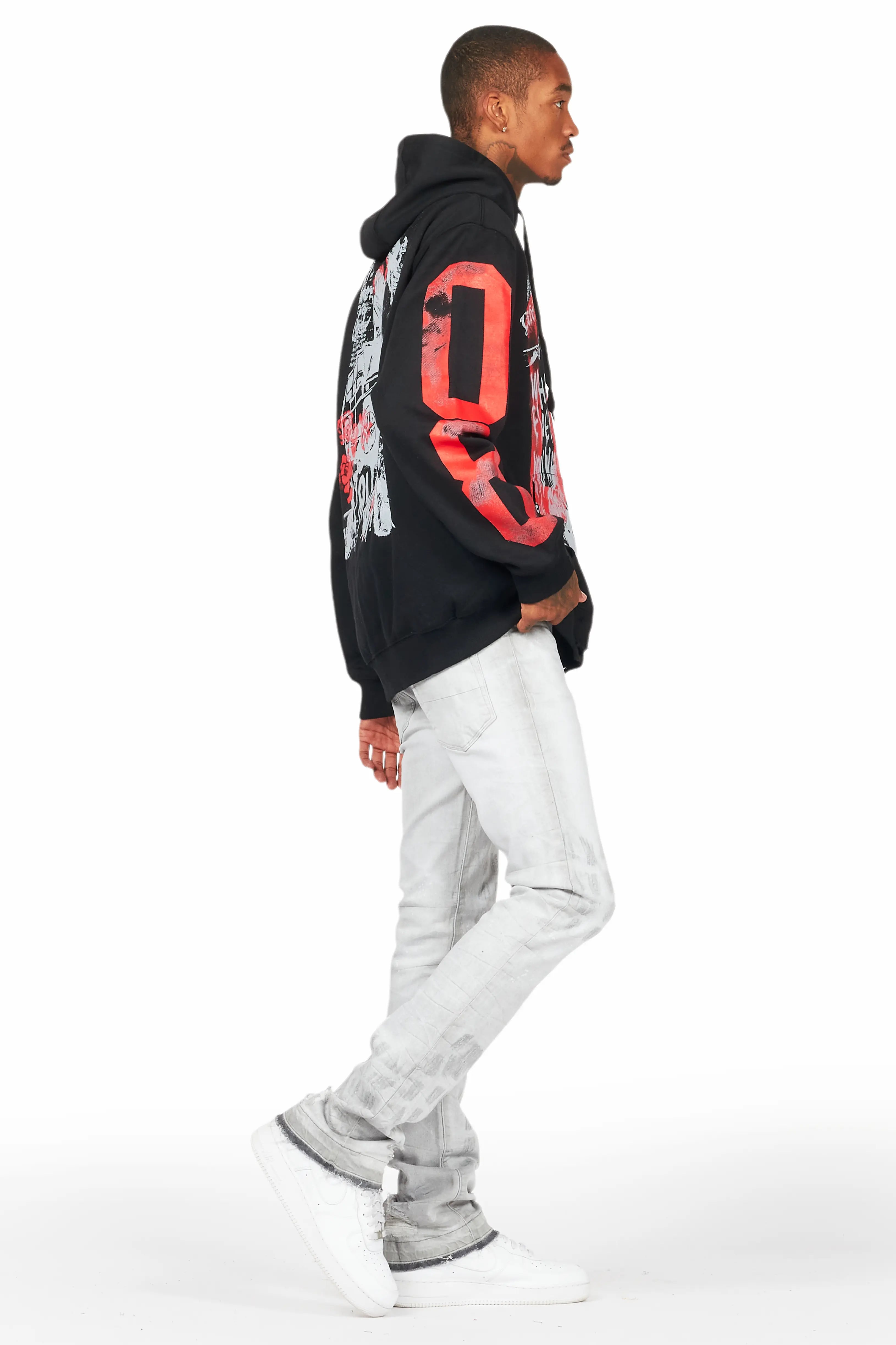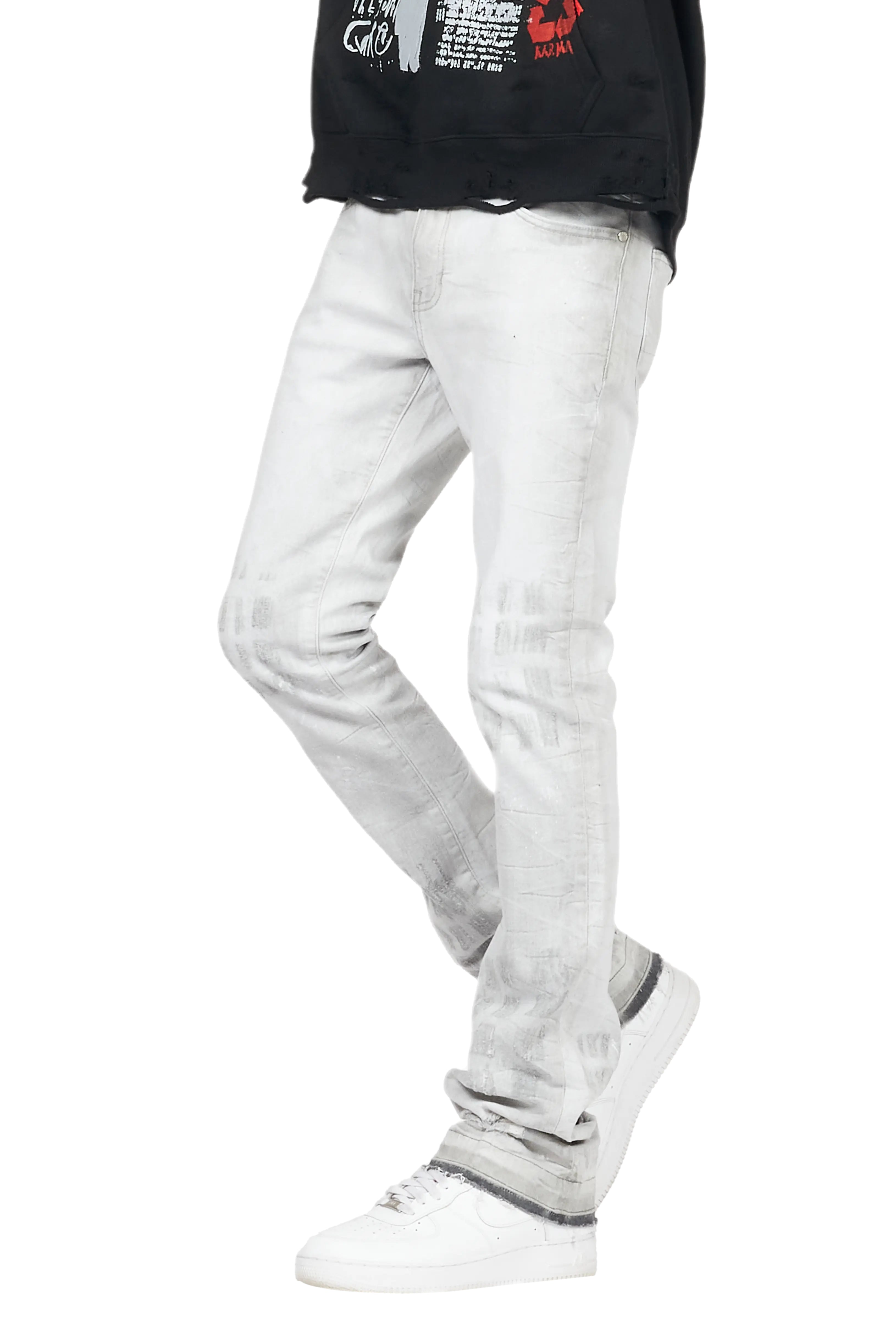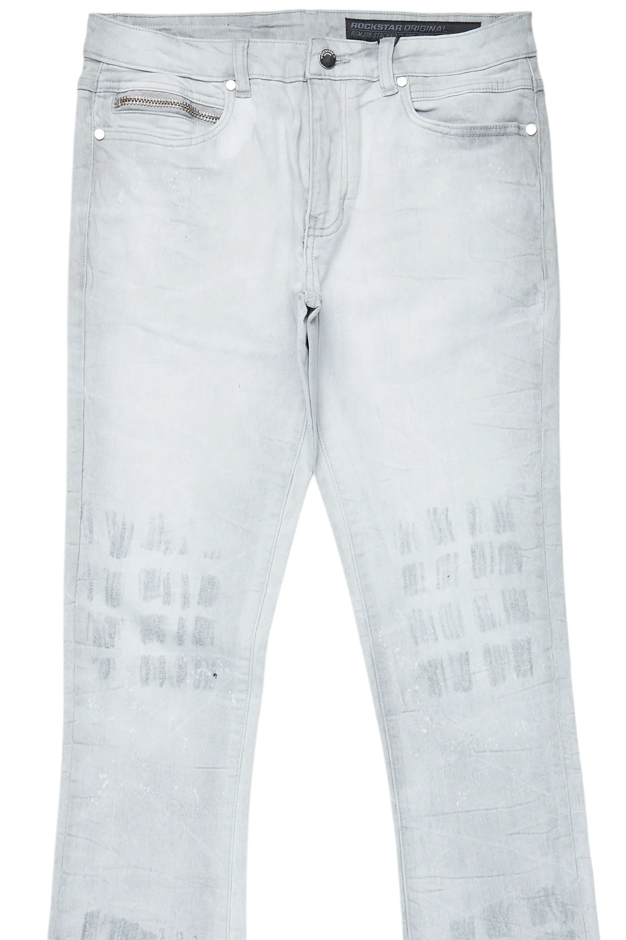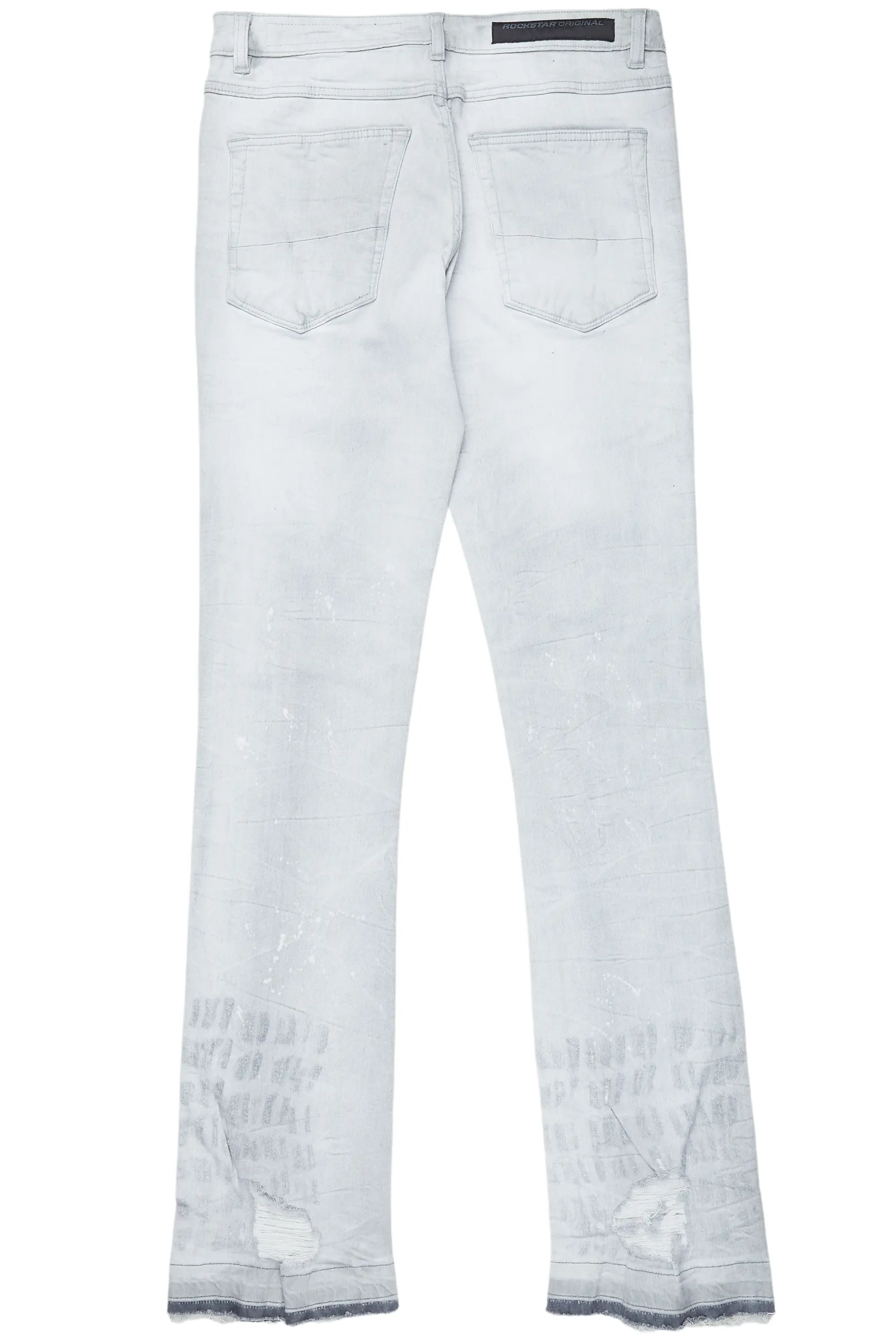 An urban stacked flare denim jean for men in light grey. Designed with organic cotton and extra long legs for an essential streetwear style.