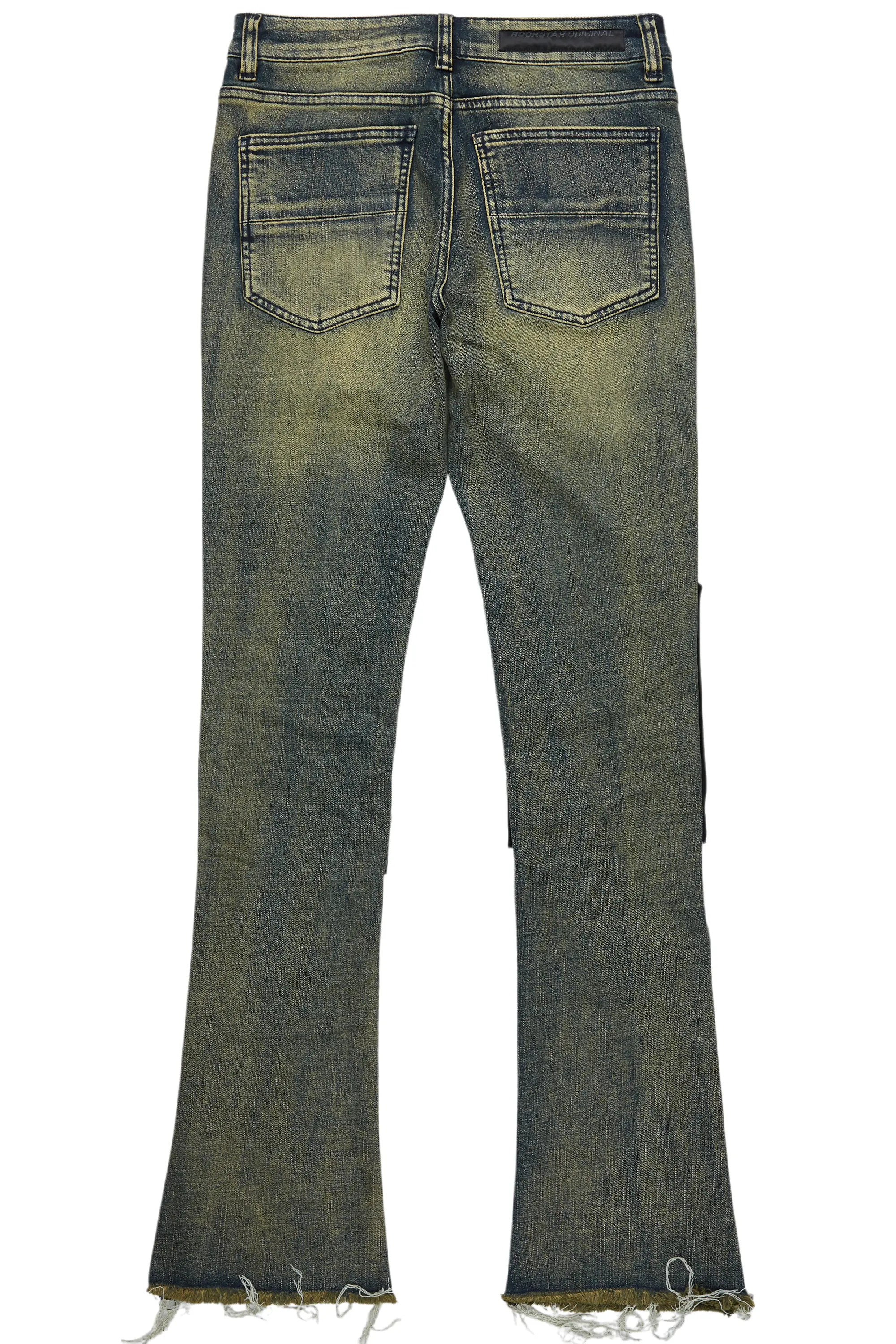 An urban stacked flare jean for men in blue. Designed with organic cotton and extra long legs for a dope denim streetwear style.