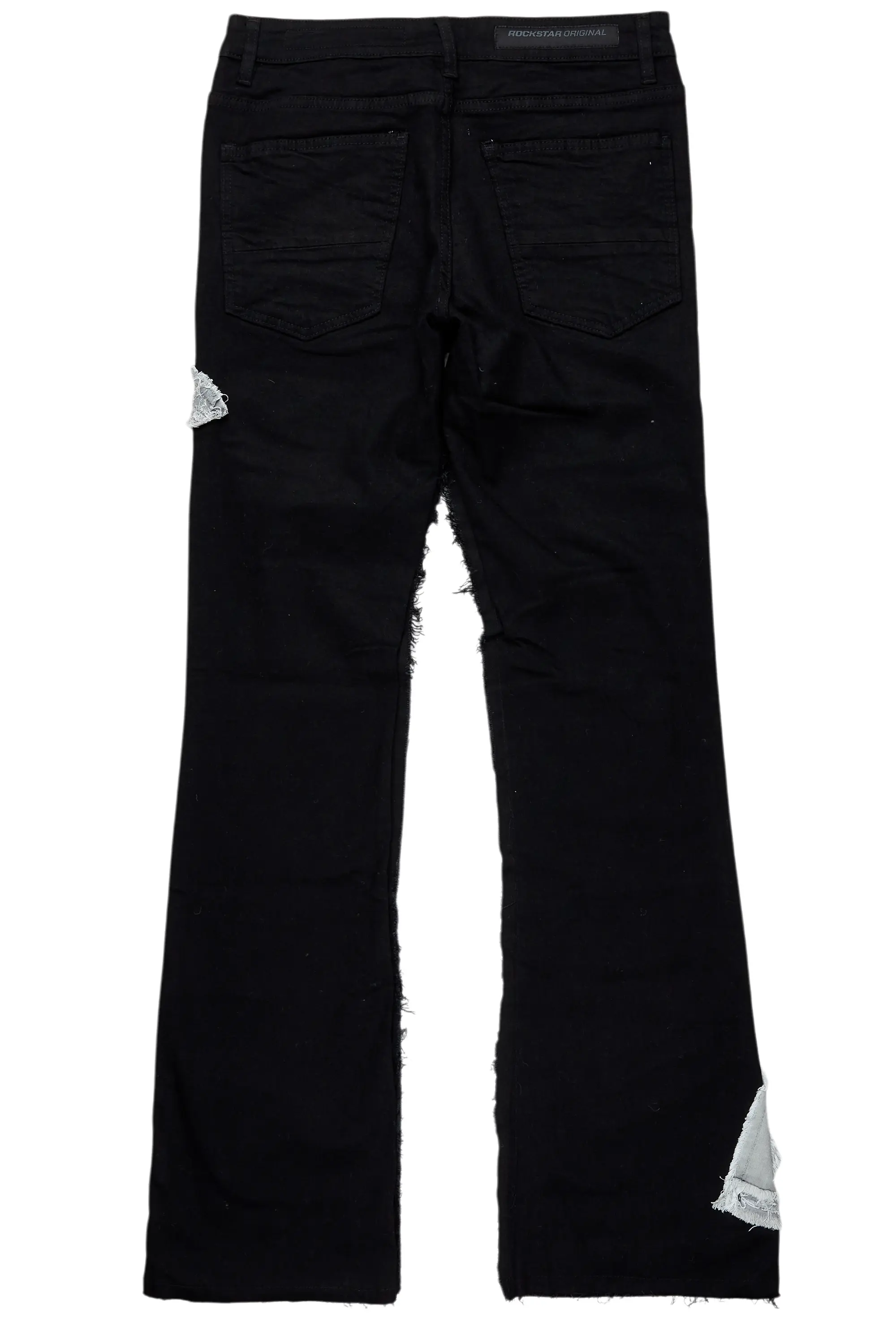 An urban stacked flare denim jean for men in jet black. Designed with organic cotton and custom detailing for the perfect streetwear style.