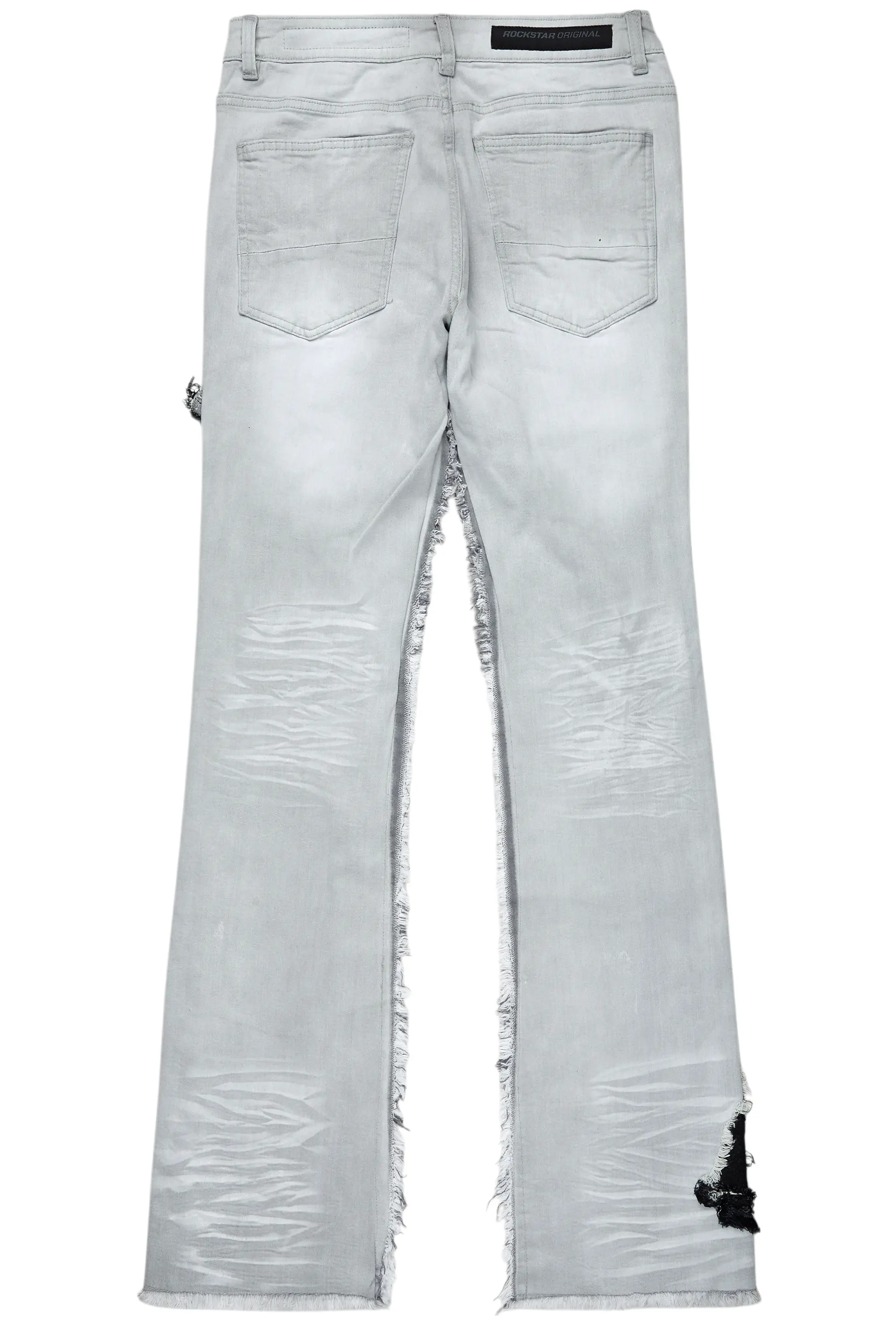 An urban stacked flare denim jean for men in light grey. Designed with organic cotton and custom detailing for the perfect streetwear style.
