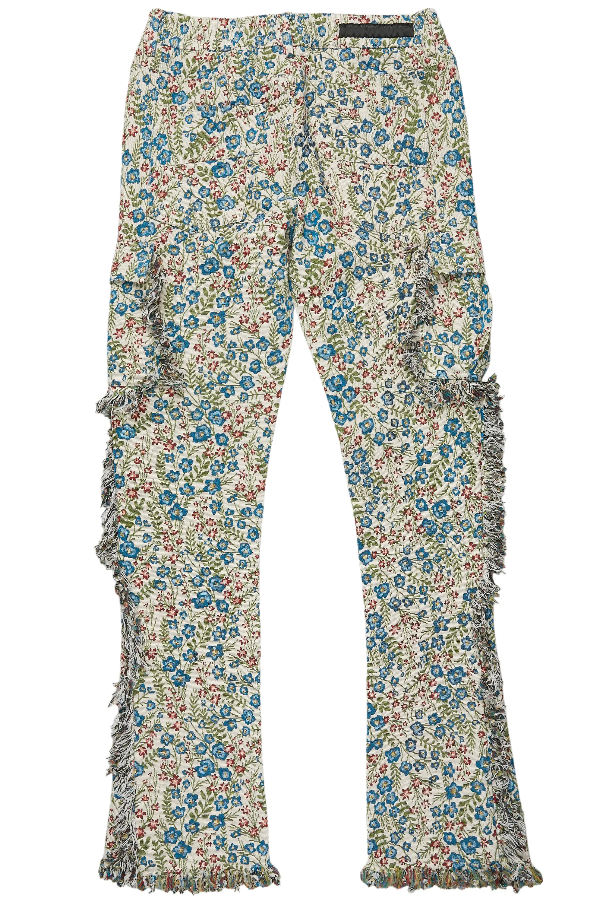 An urban cargo jean for men in beige. Designed with organic cotton and custom hand-woven tapestry details for a dope denim streetwear style.