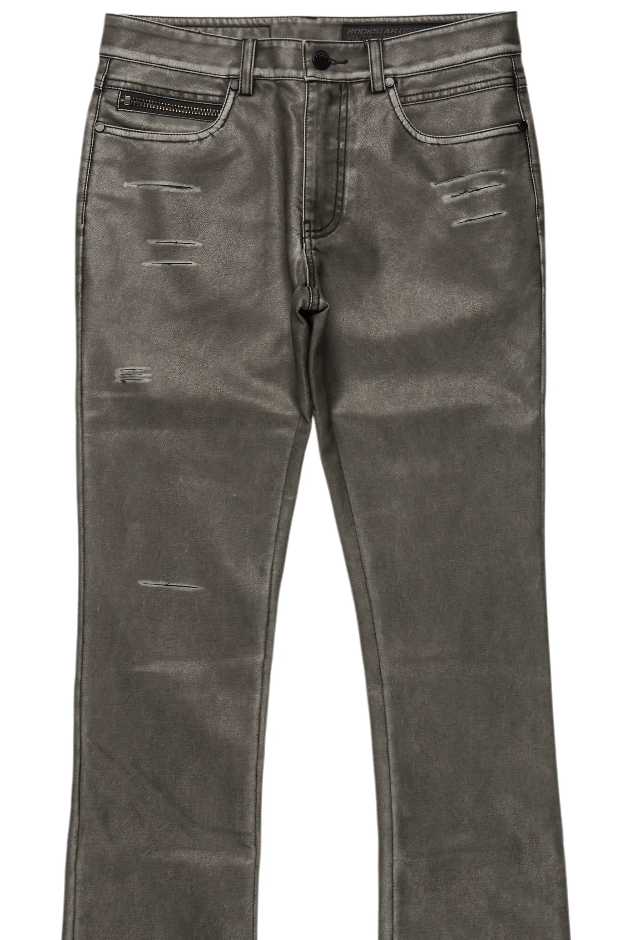 An elevated stacked flare jean for men in black. Designed with PU fabric and distressed detailing for a must-cop streetwear style.