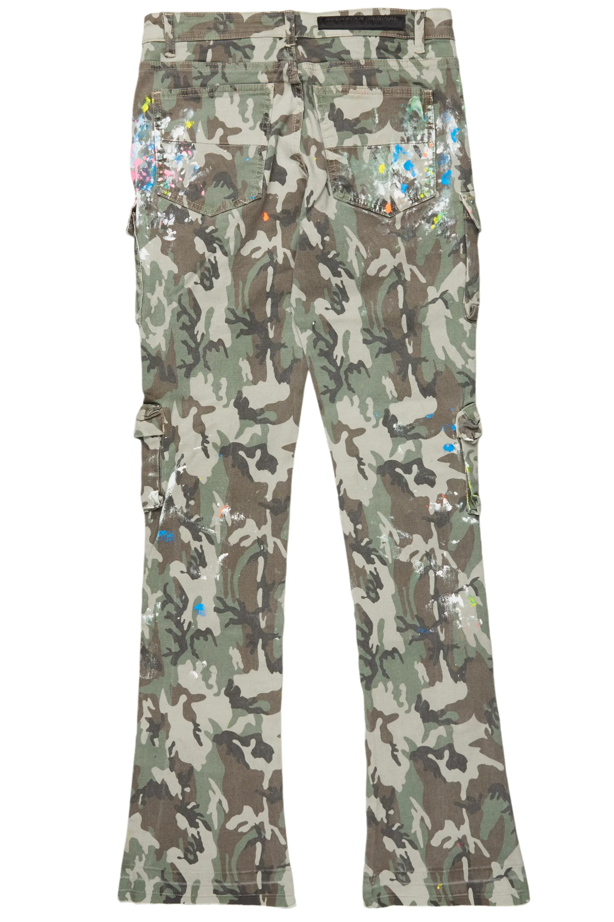 An urban stacked denim cargo jean for men in green camo. Designed with organic cotton and extra long legs for a must-cop streetwear staple piece.