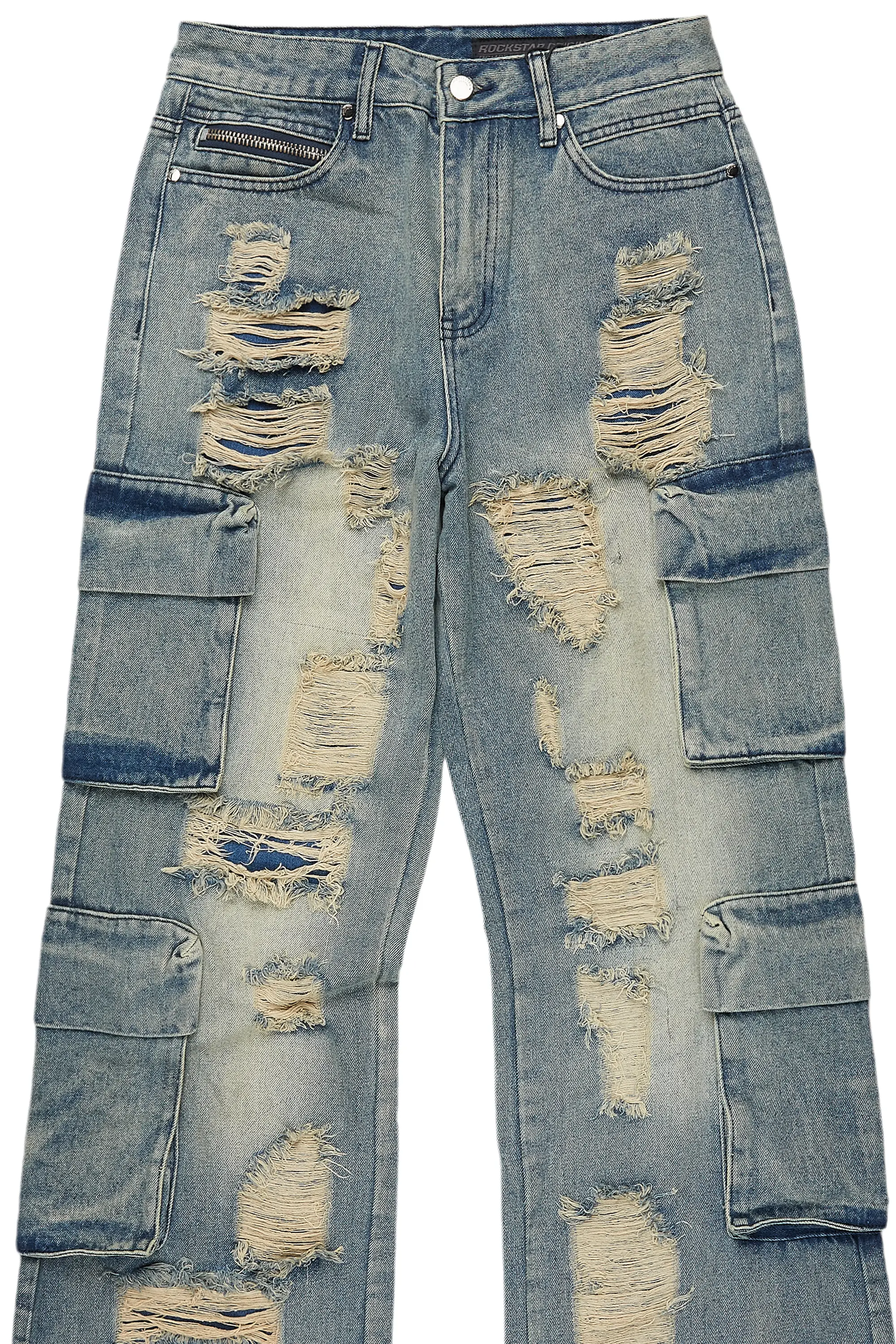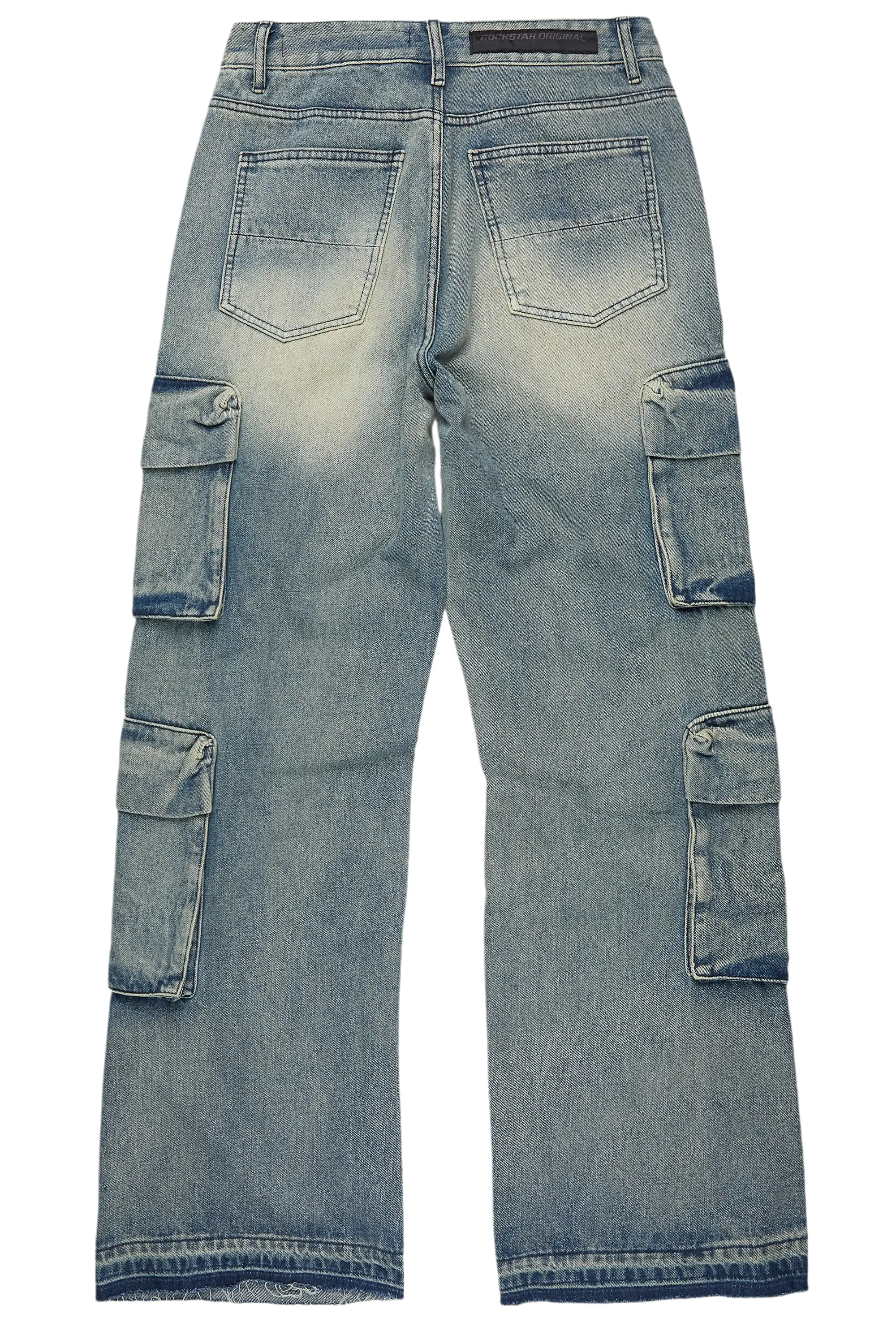 An urban cargo baggy jean for men in blue. Designed with organic cotton and utility pockets for a dope denim streetwear style.