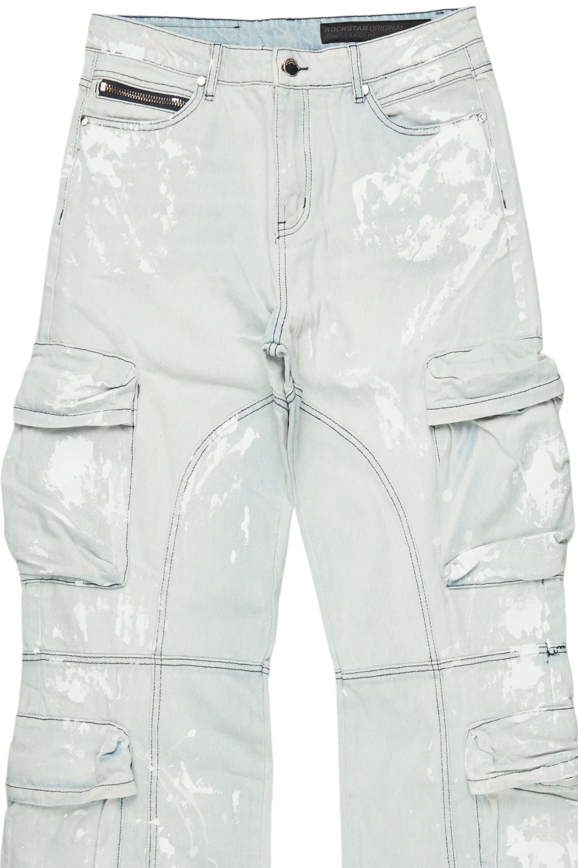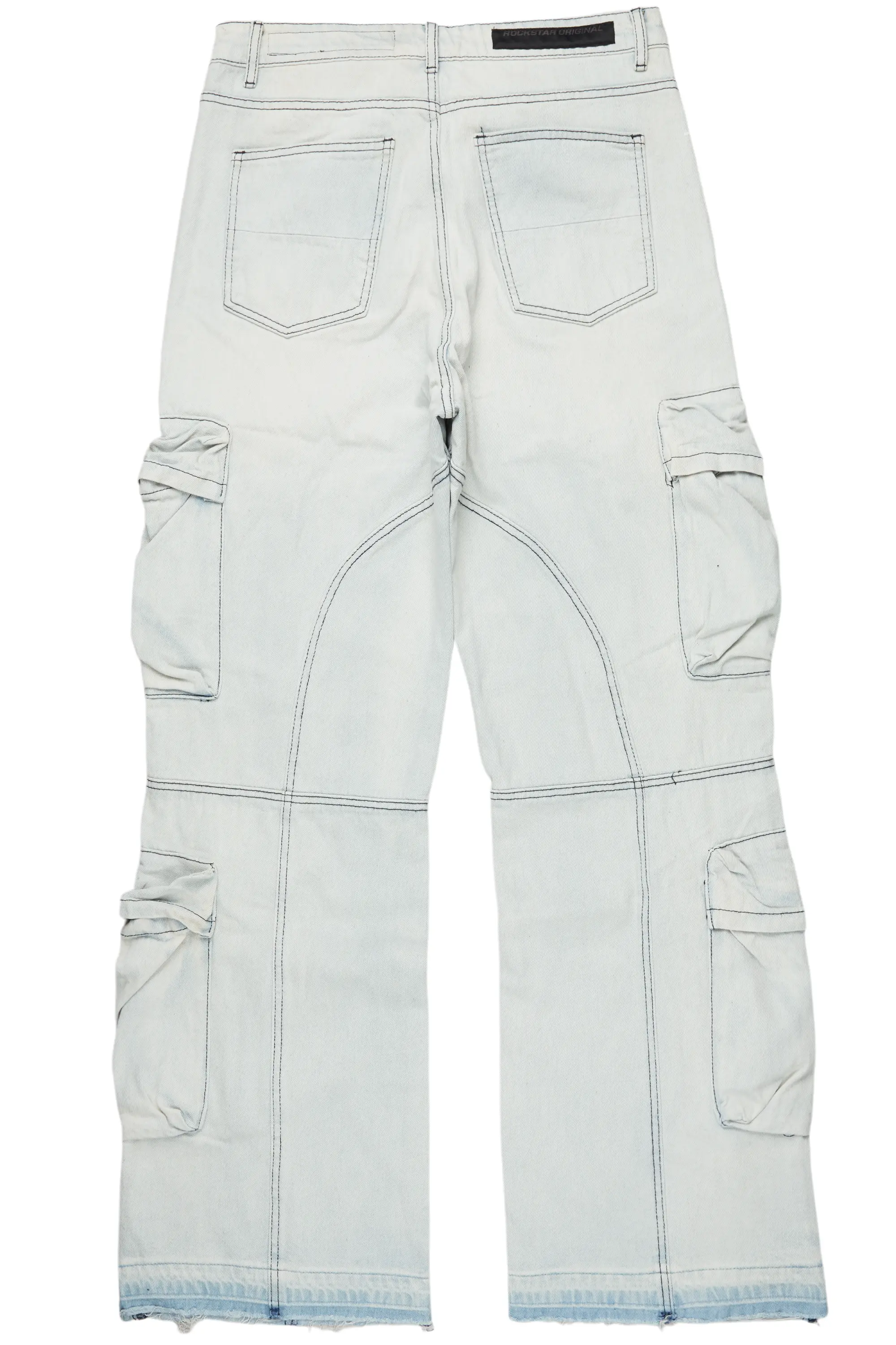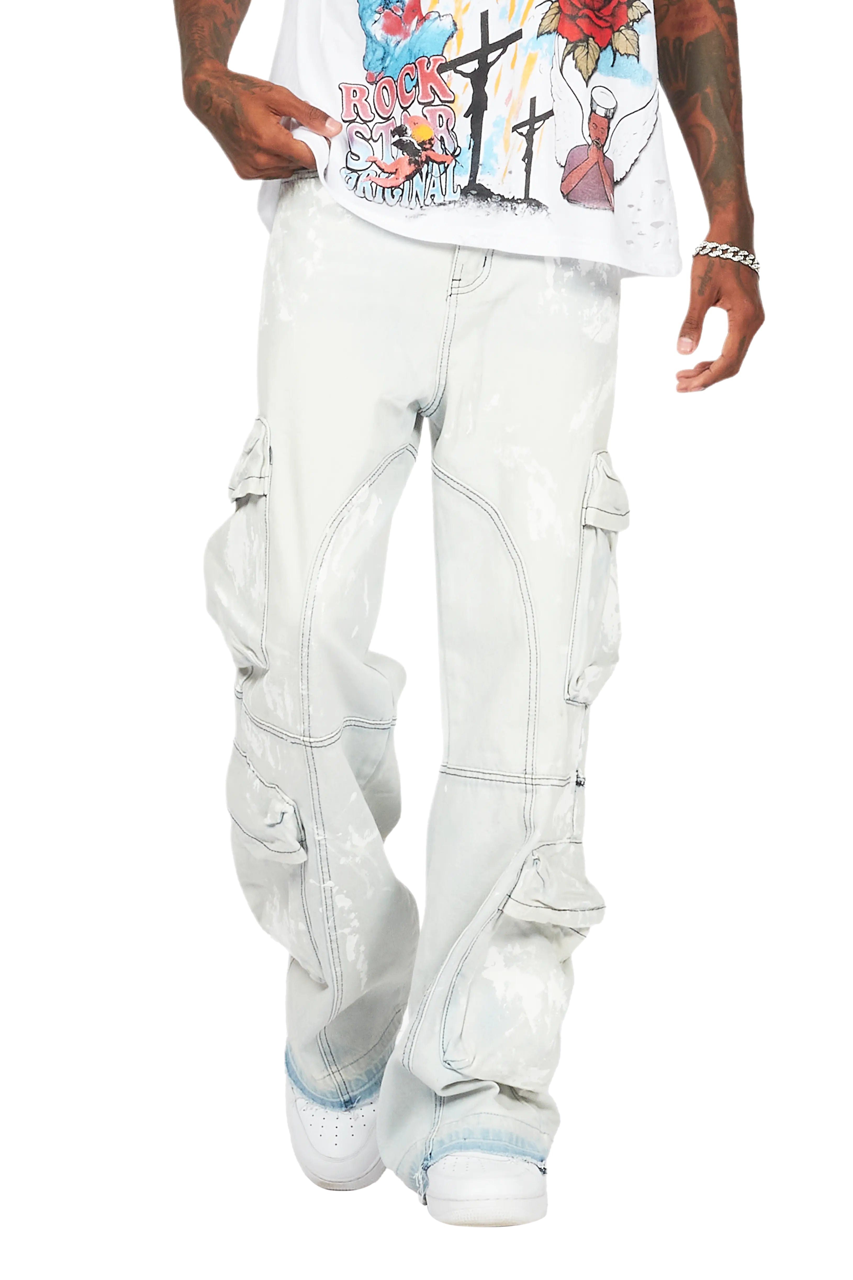 An urban cargo baggy jean for men in blue. Designed with organic cotton and utility pockets for a dope denim streetwear style.