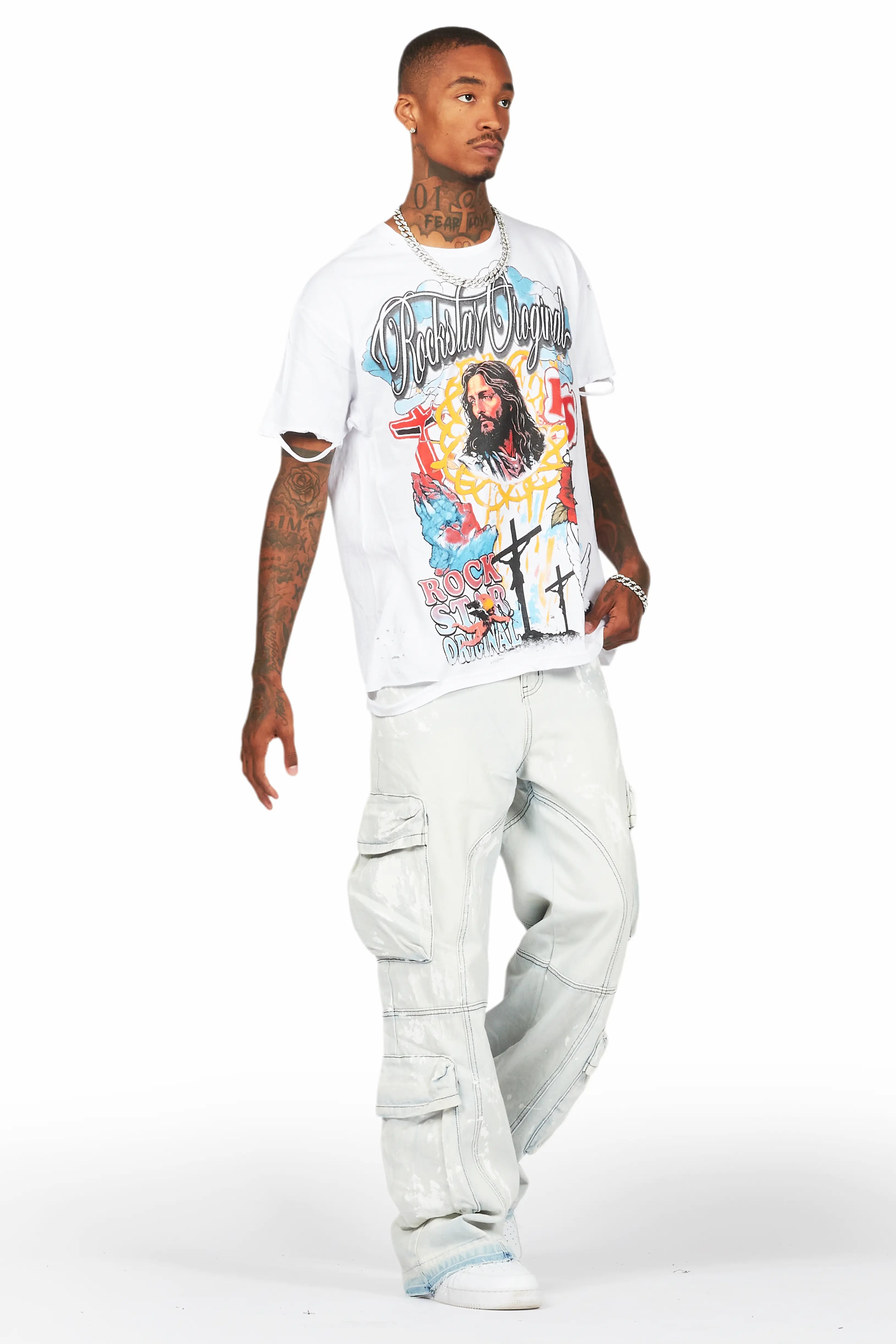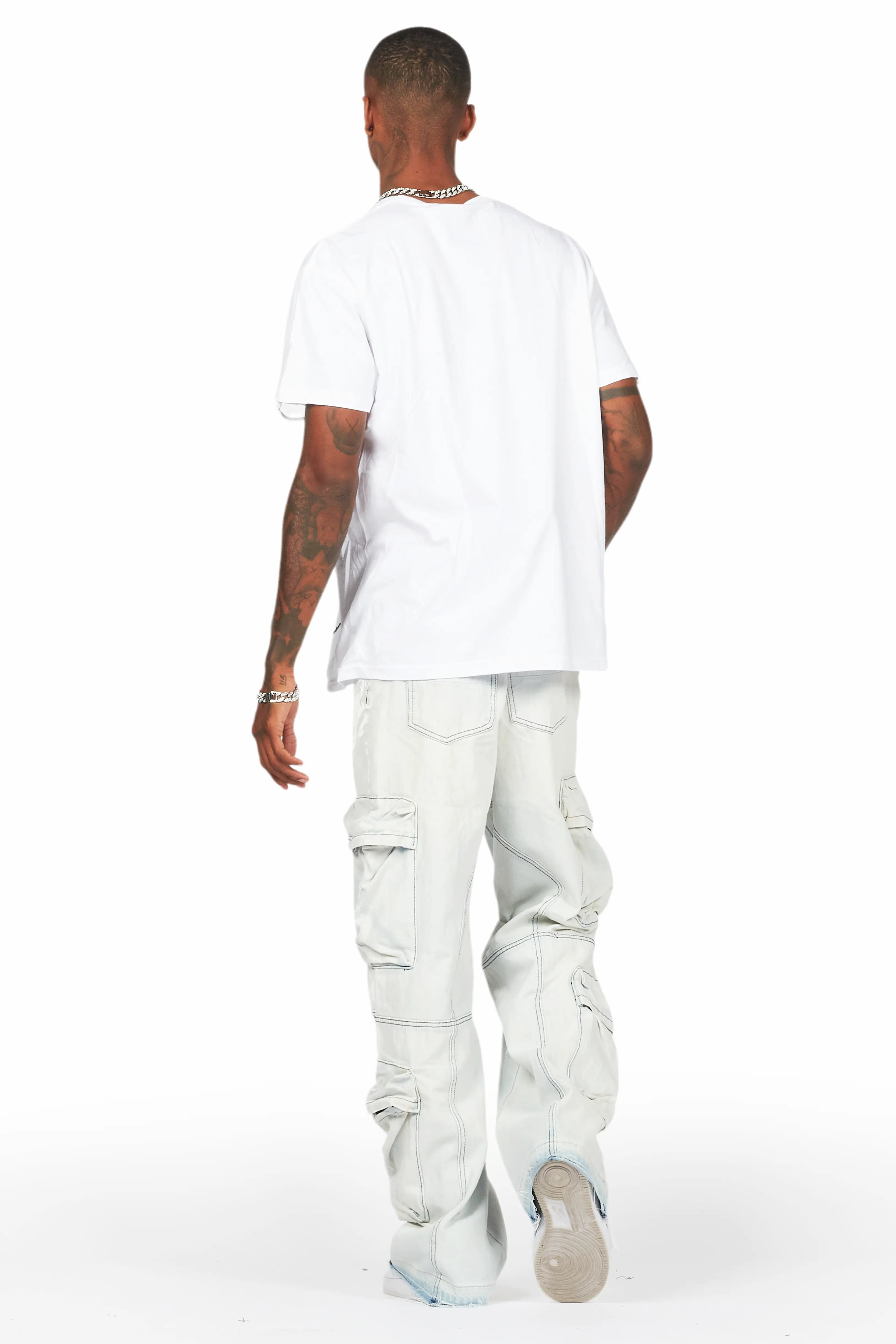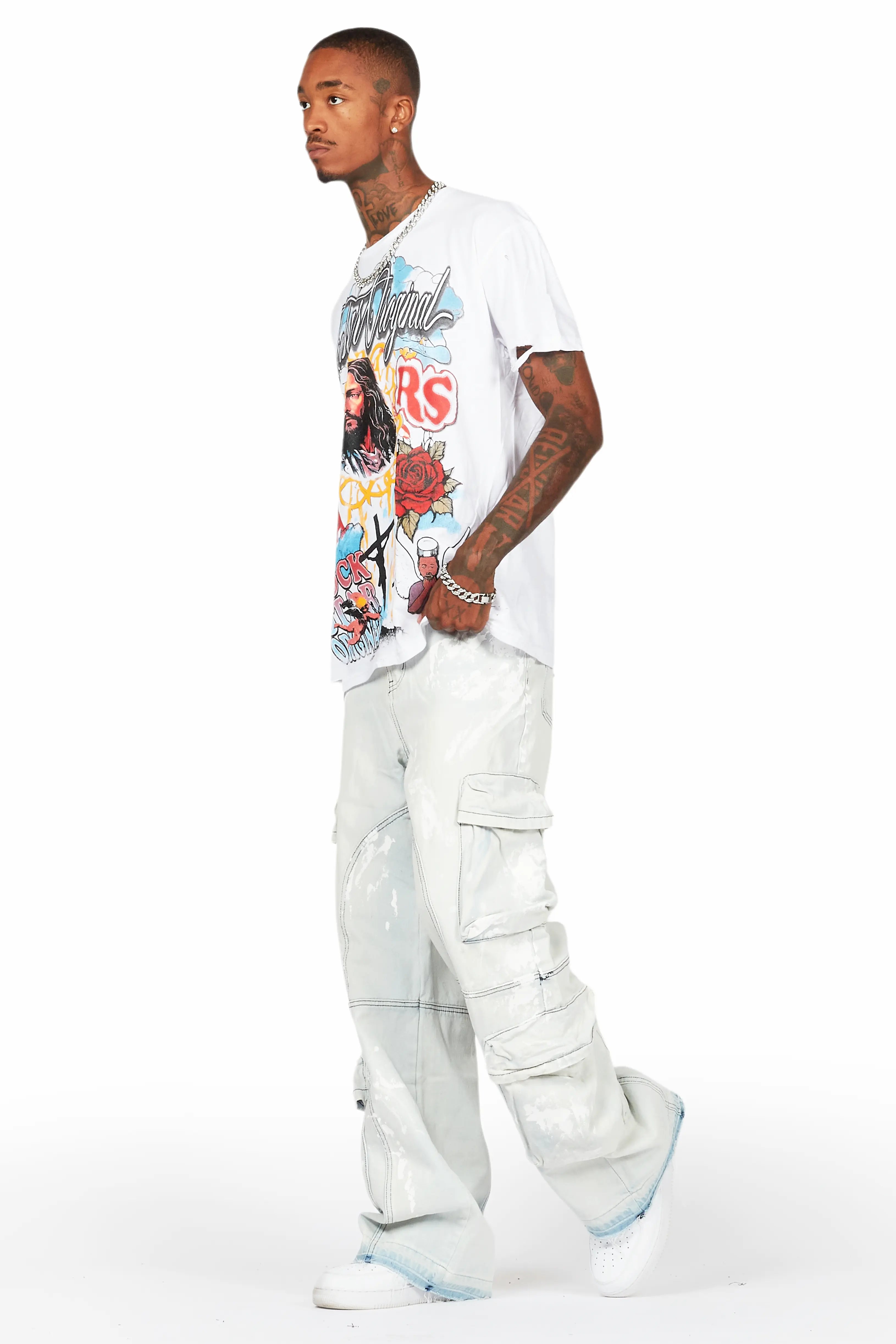 An urban cargo baggy jean for men in blue. Designed with organic cotton and utility pockets for a dope denim streetwear style.