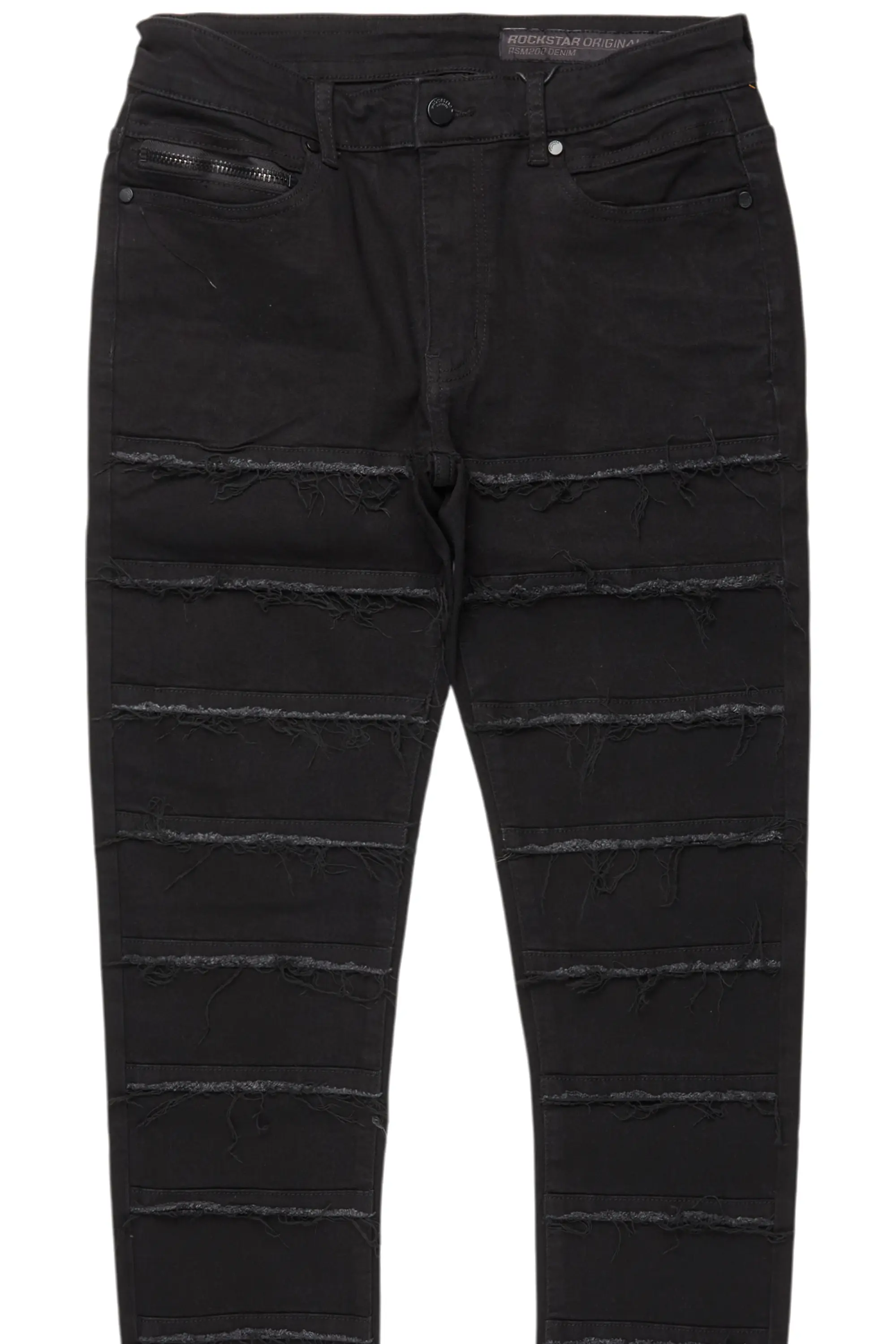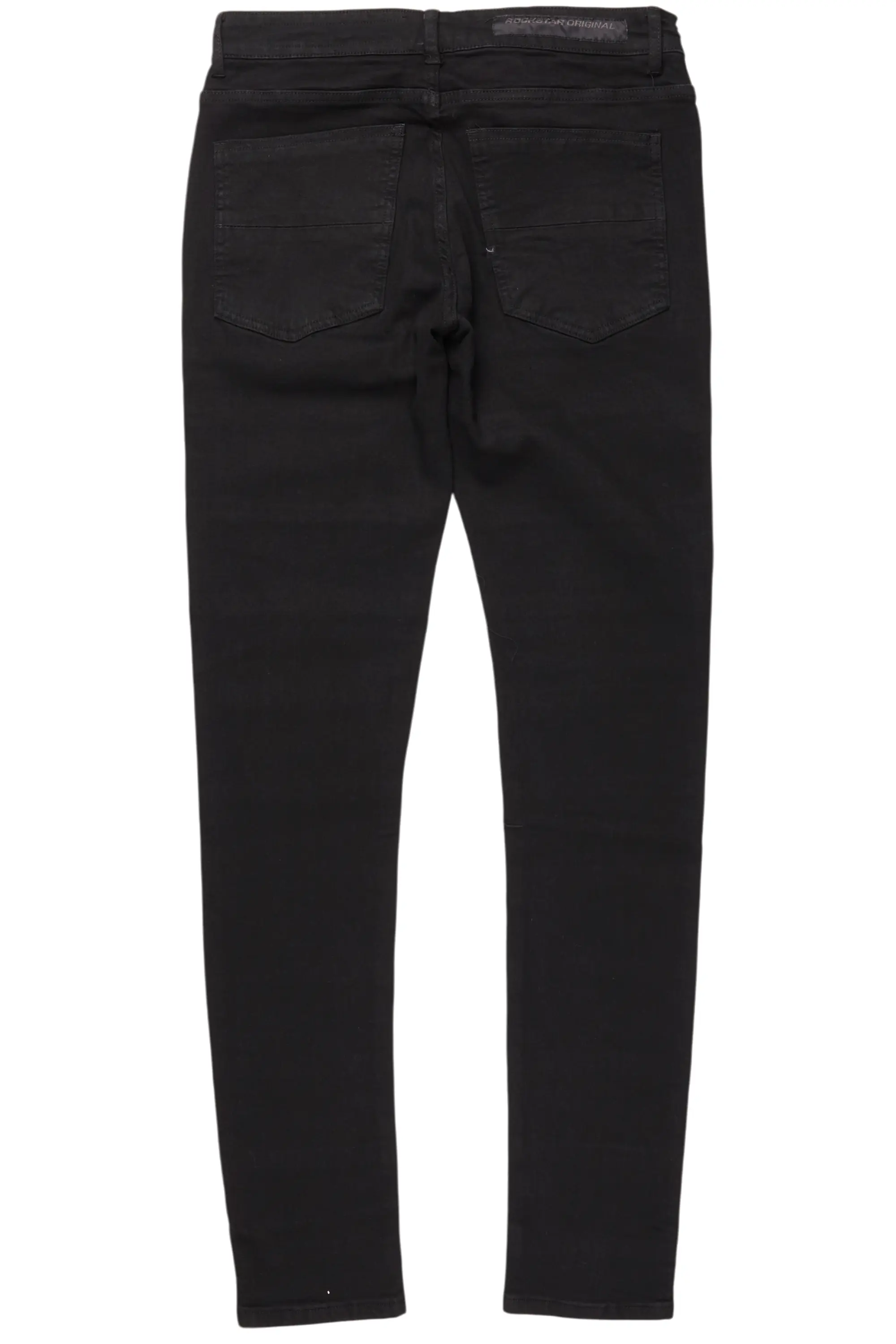 An urban denim slim jean for men in jet black. Designed with organic cotton and distressed detailing for a dope streetwear style.