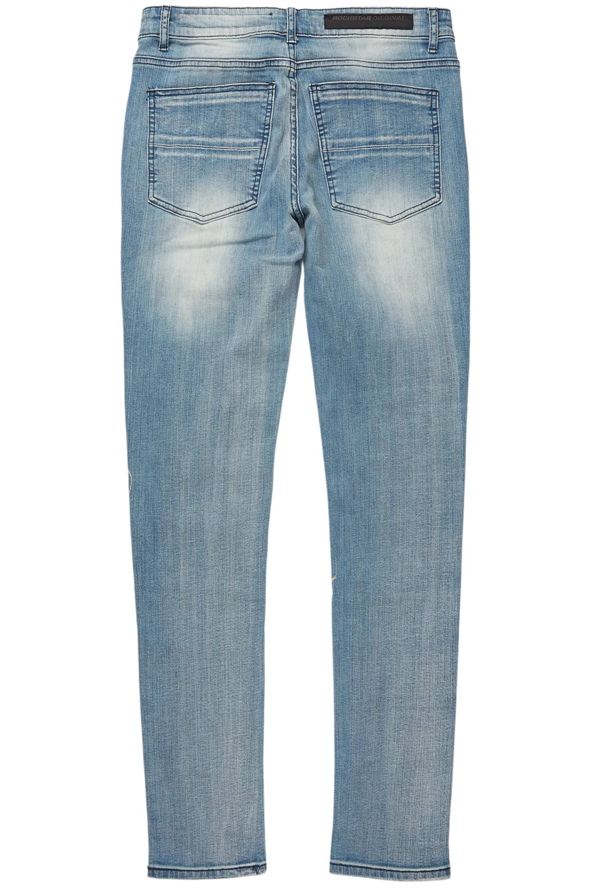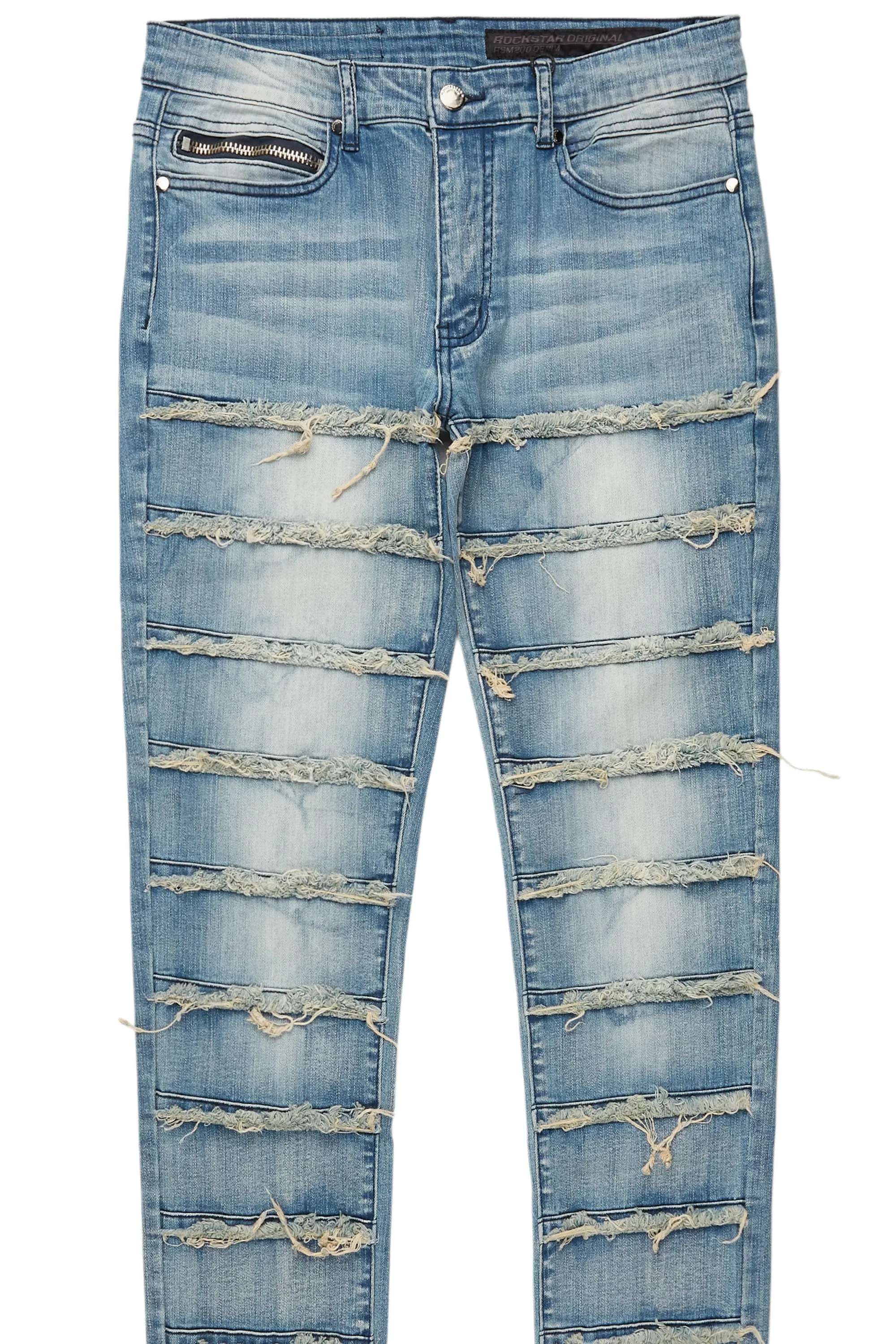 An urban denim slim jean for men in rustic blue. Designed with organic cotton and distressed detailing for a dope streetwear style.