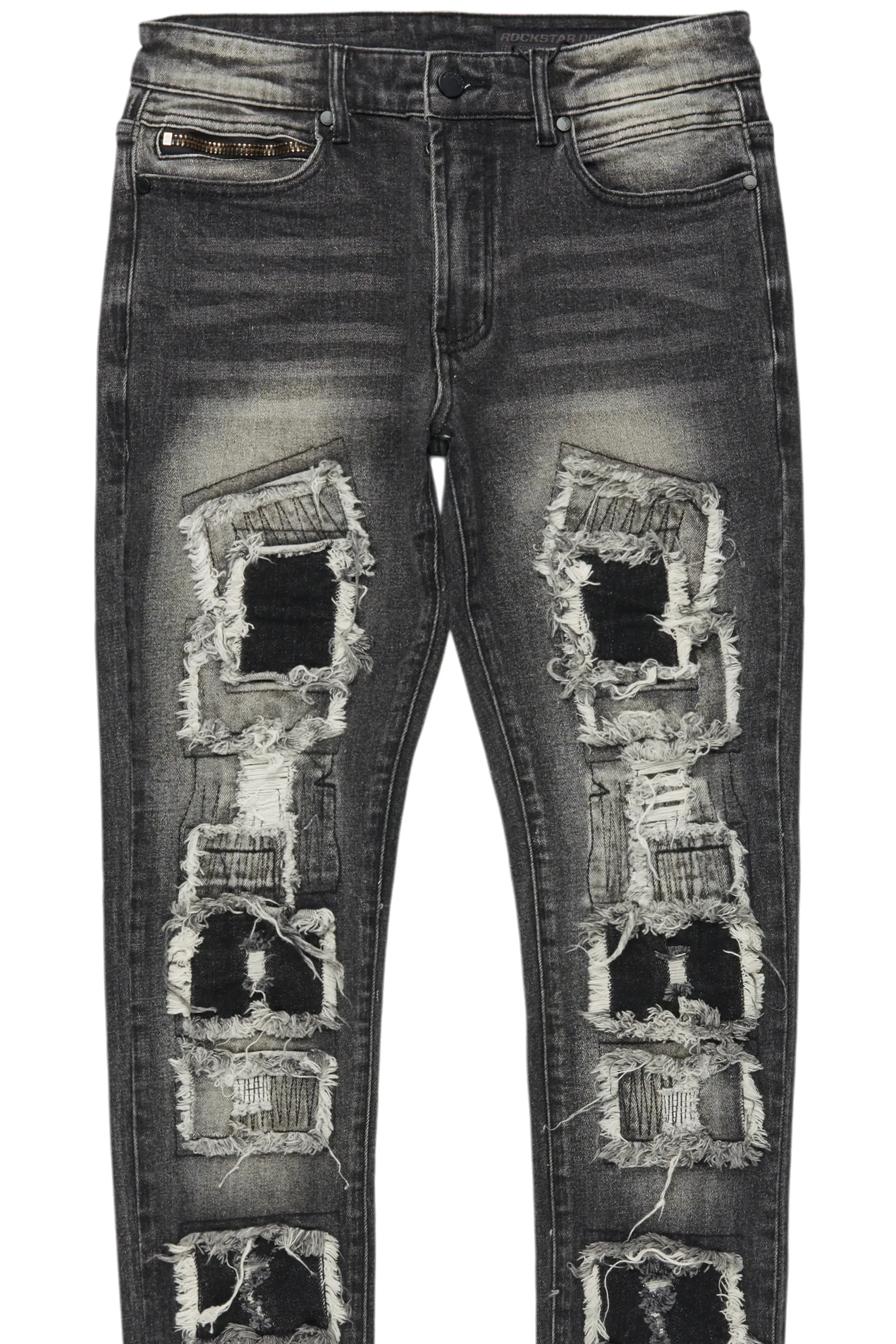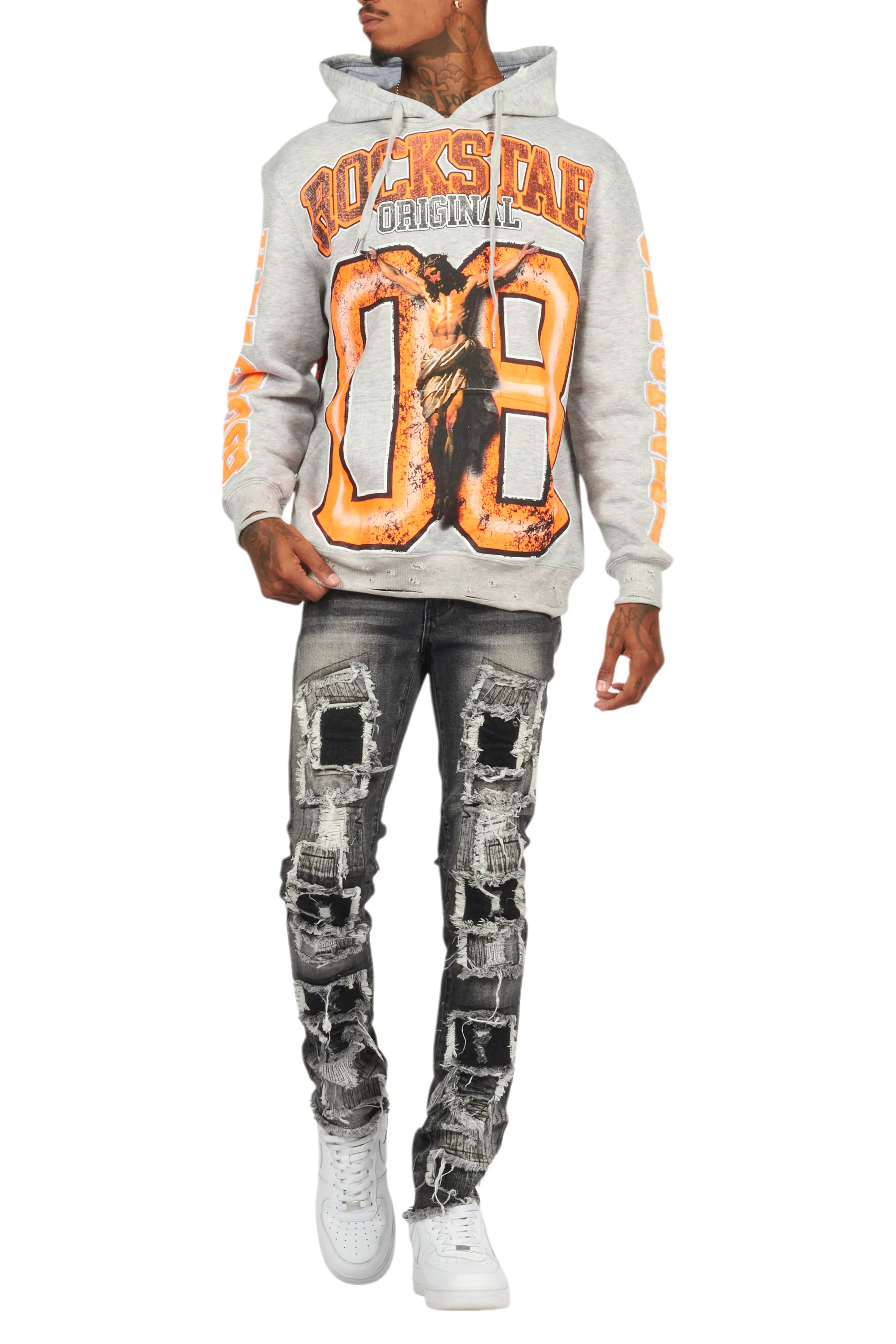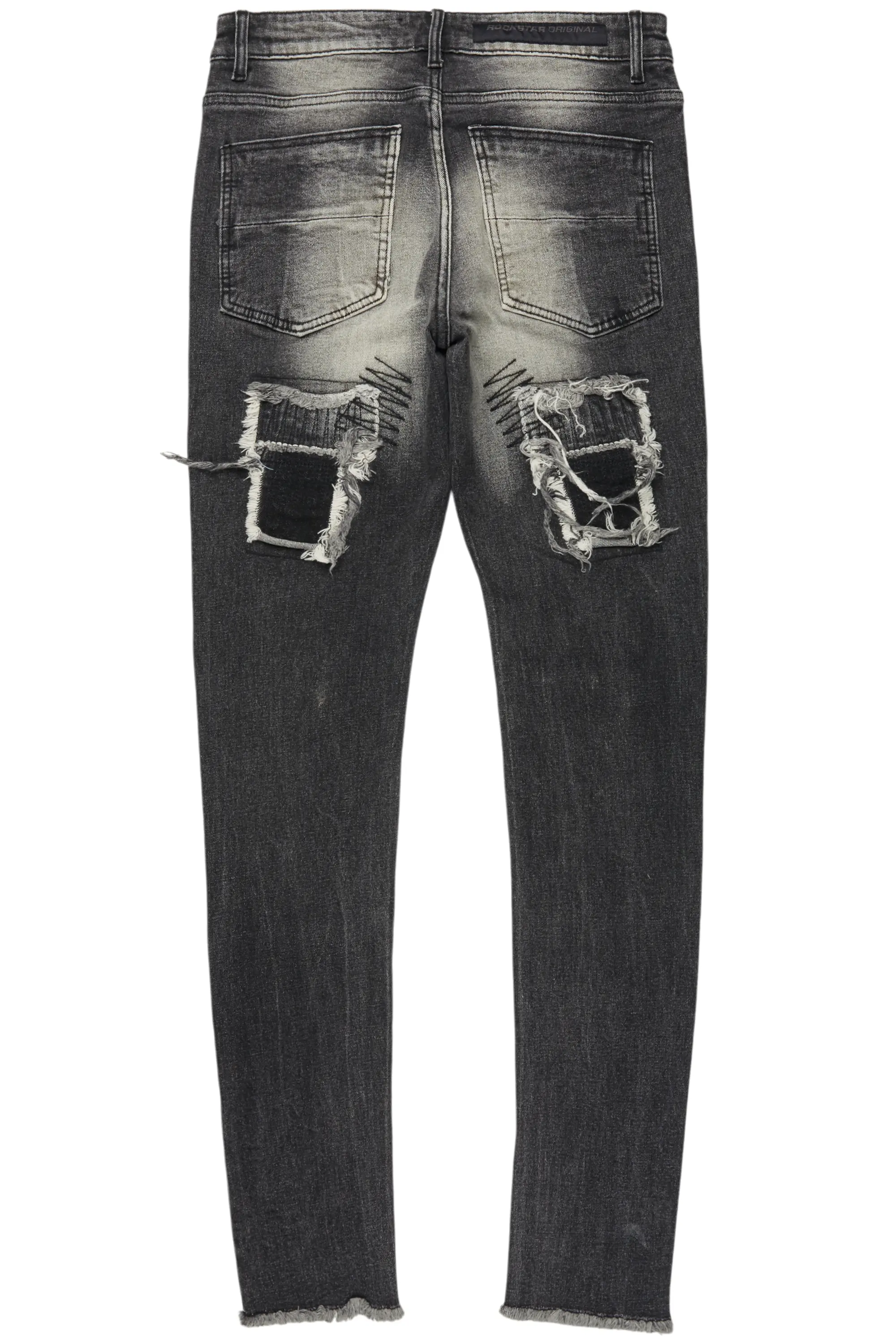 An urban denim slim jean for men in grey. Designed with organic cotton and distressed detailing for a dope streetwear style.