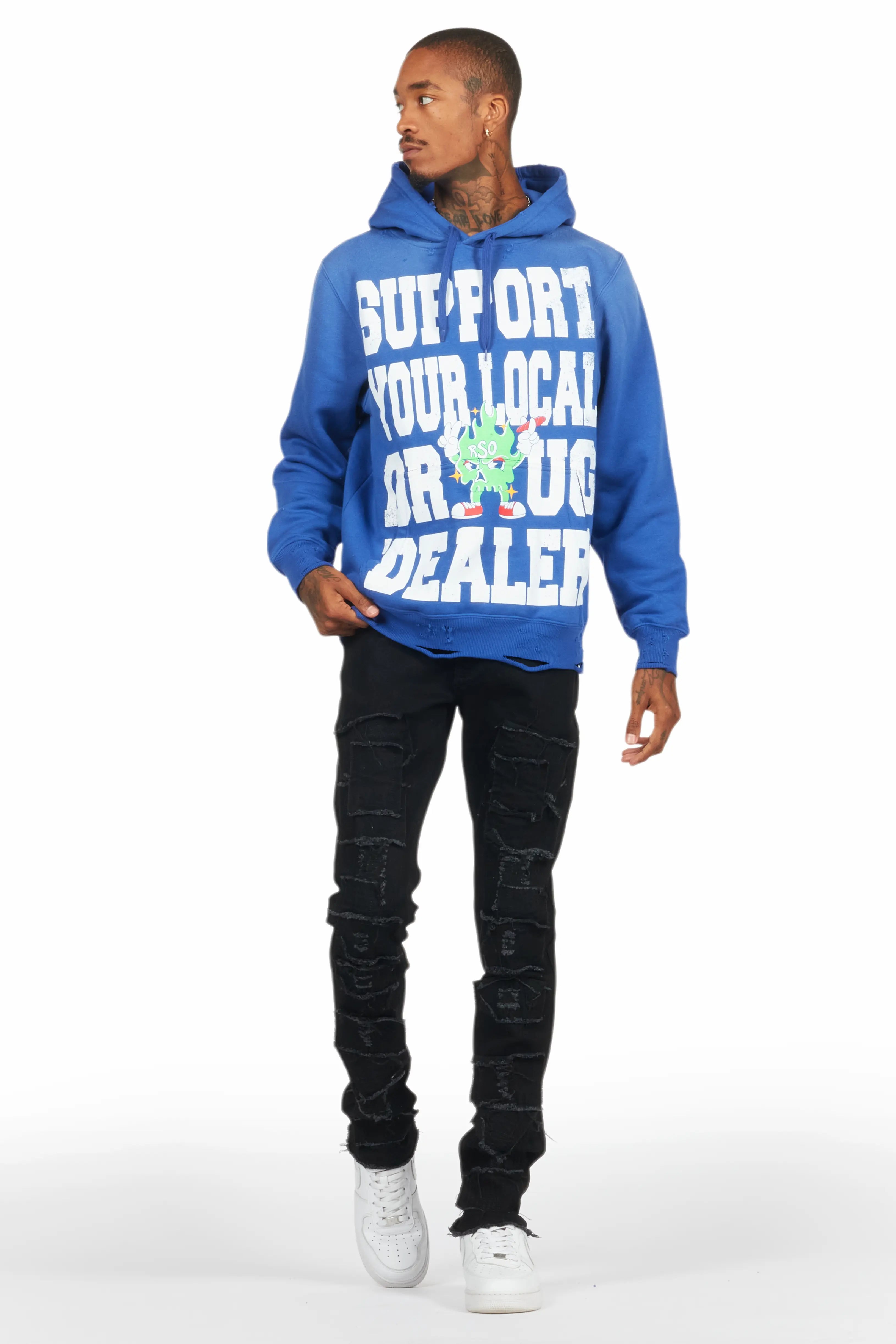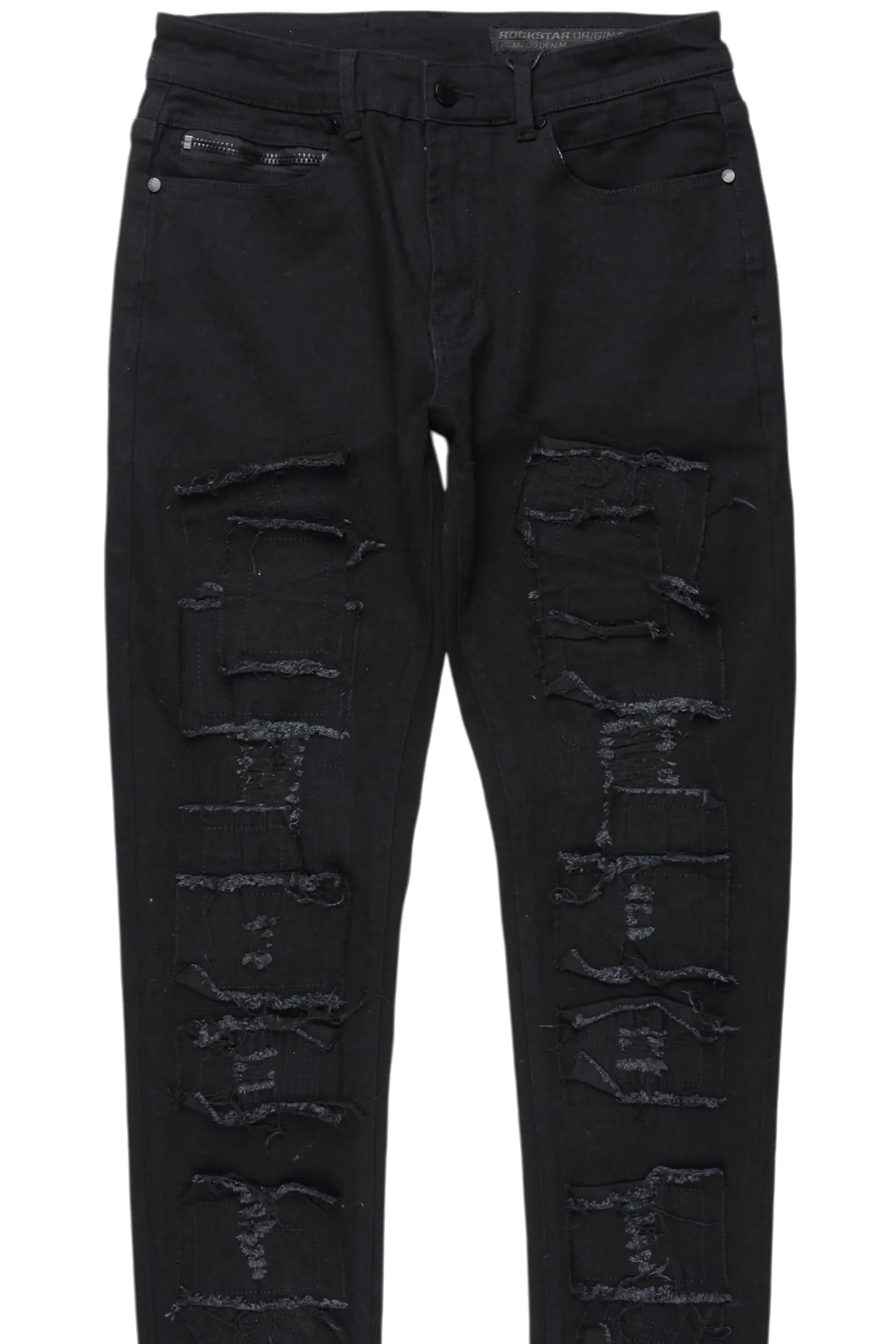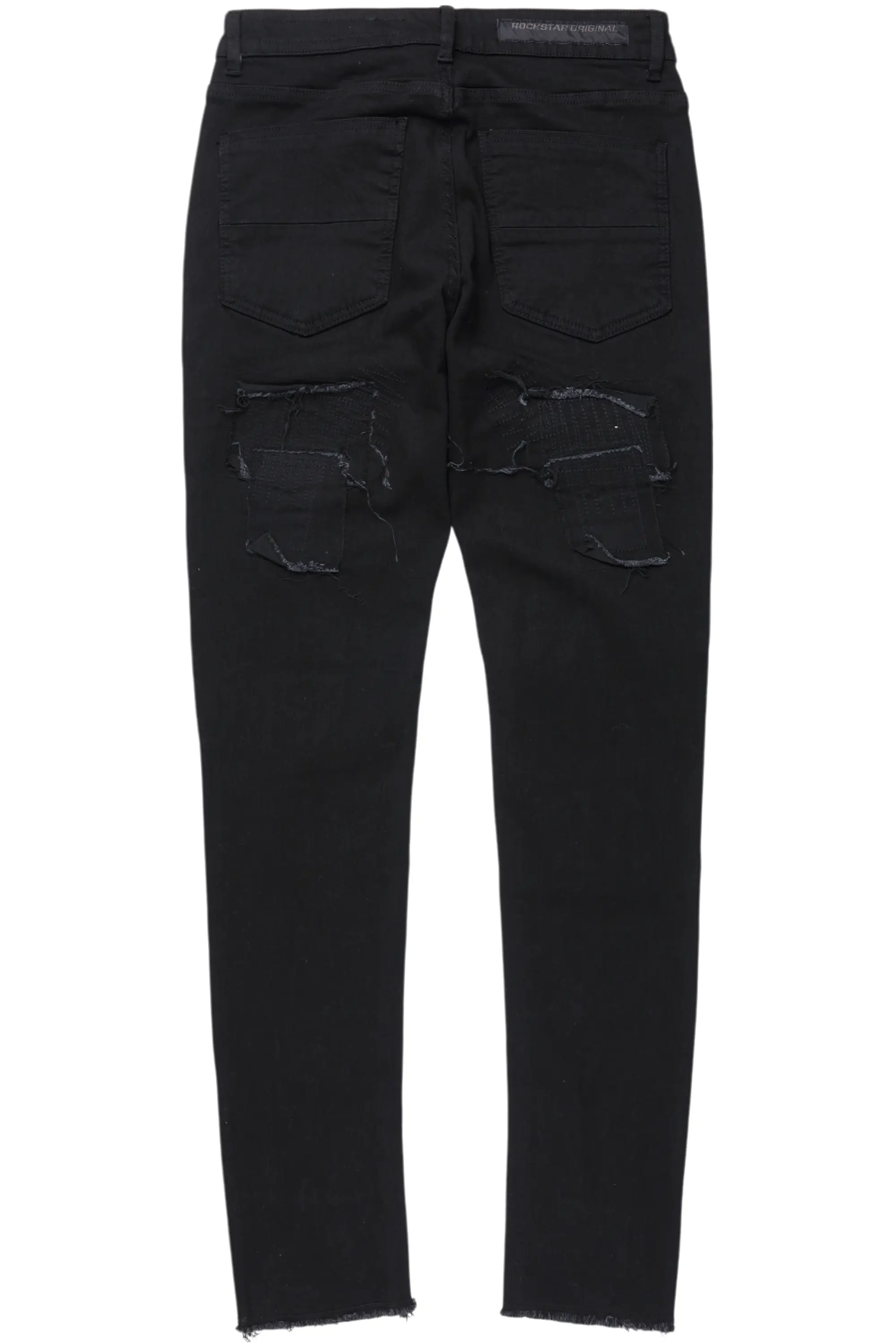 An urban denim slim jean for men in jet black. Designed with organic cotton and distressed detailing for a dope streetwear style.