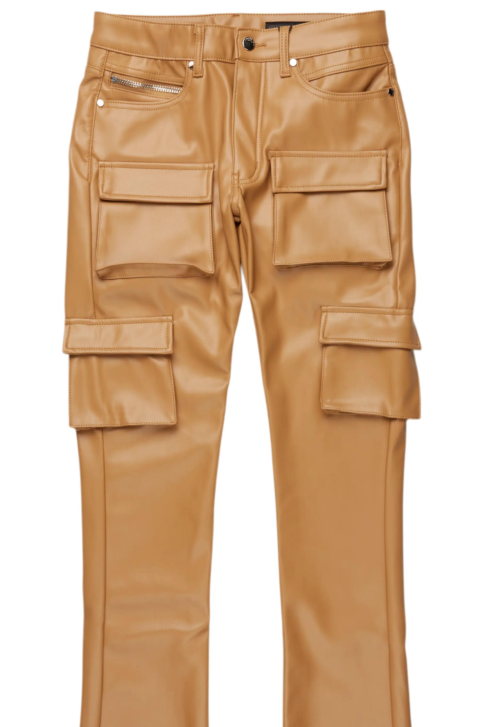 An urban stacked cargo jean for men in beige. Designed with premium PU fabric and utility pockets for a must-cop denim streetwear style.