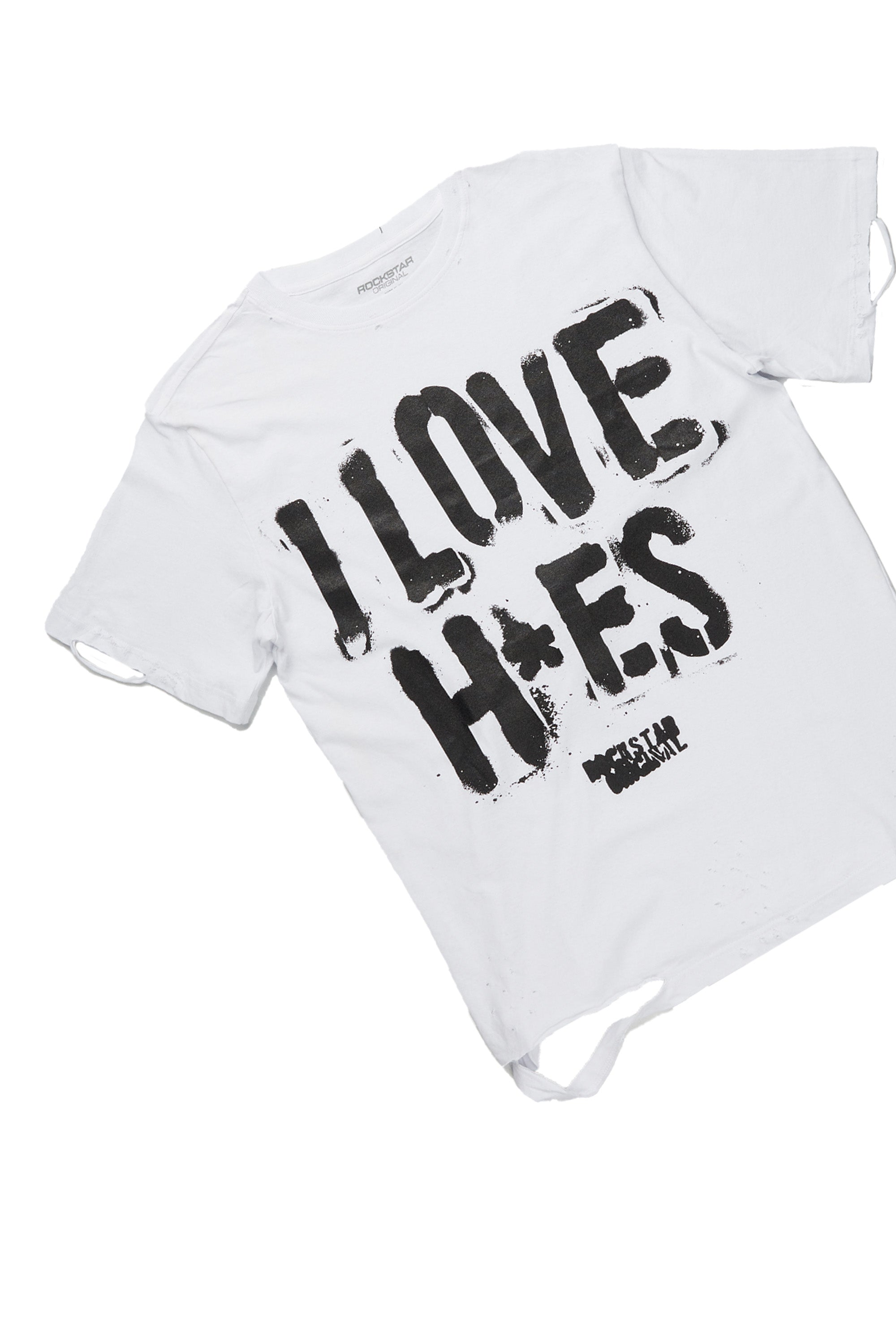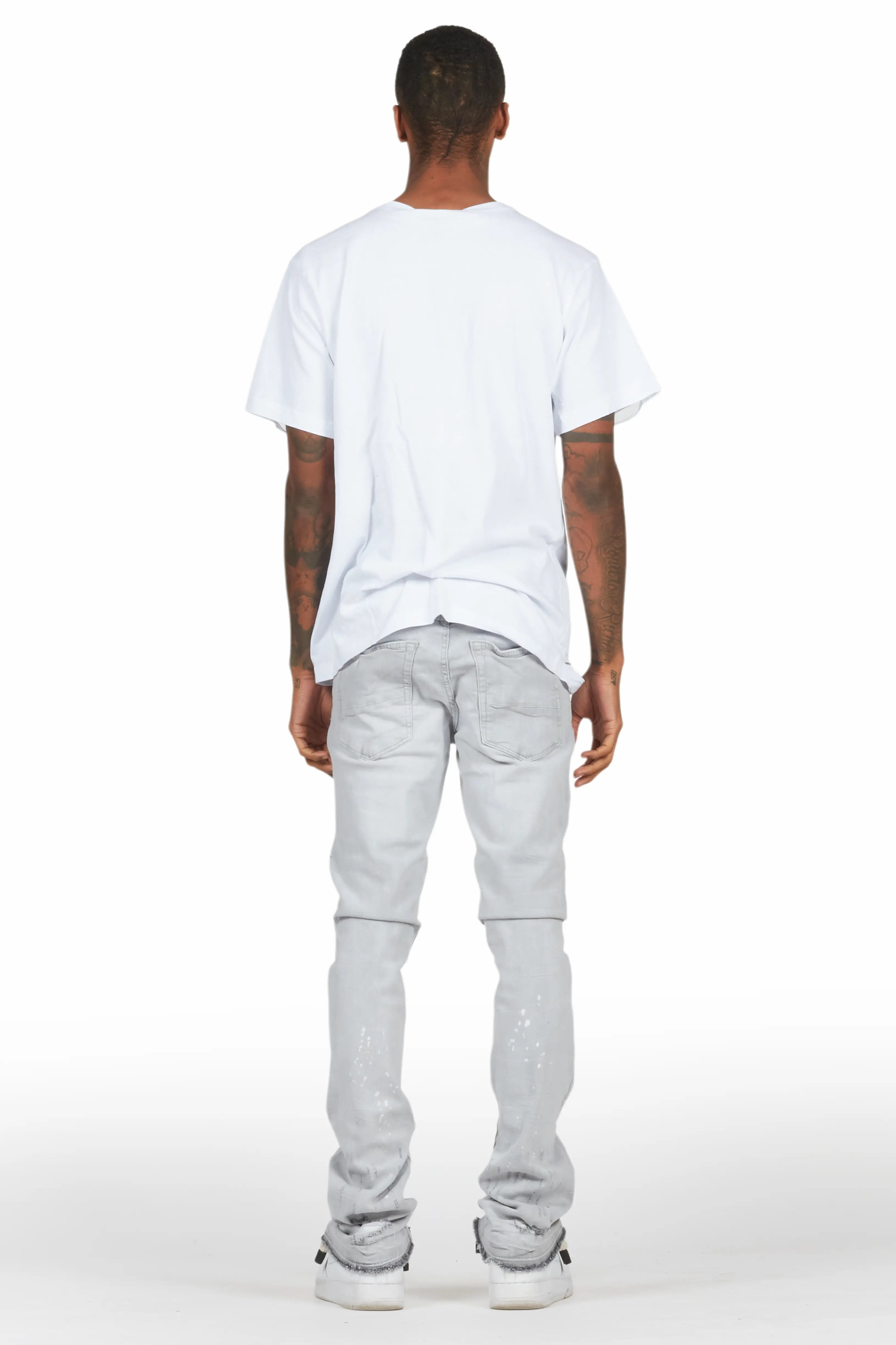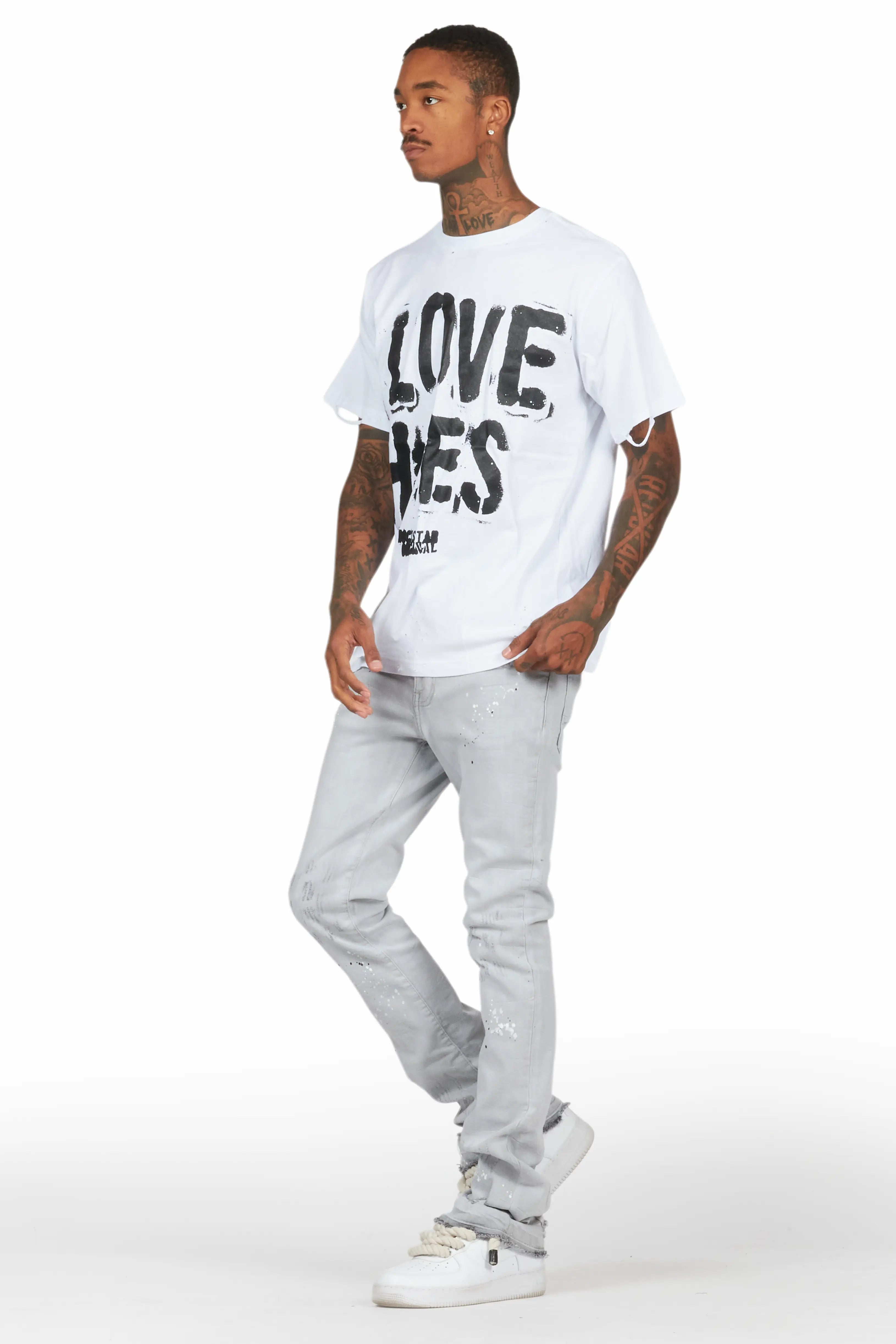 An urban two-piece graphic tee and stacked jean set for men. Designed with organic cotton and extra long legs for a dope streetwear outfit set.