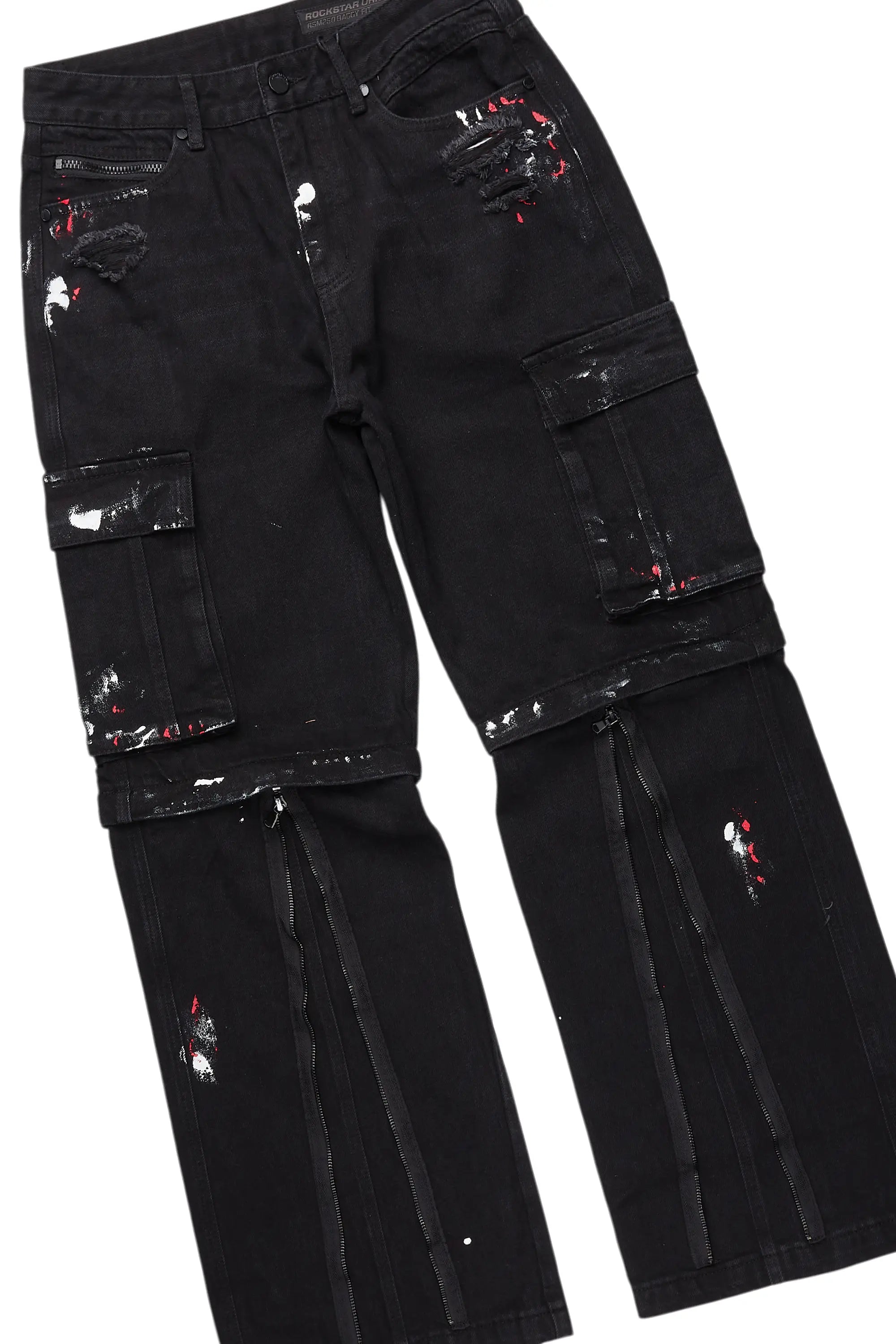 An urban two-piece graphic knit hoodie and baggy cargo jean set for men. Designed with organic cotton and extra long legs for a dope streetwear outfit set.