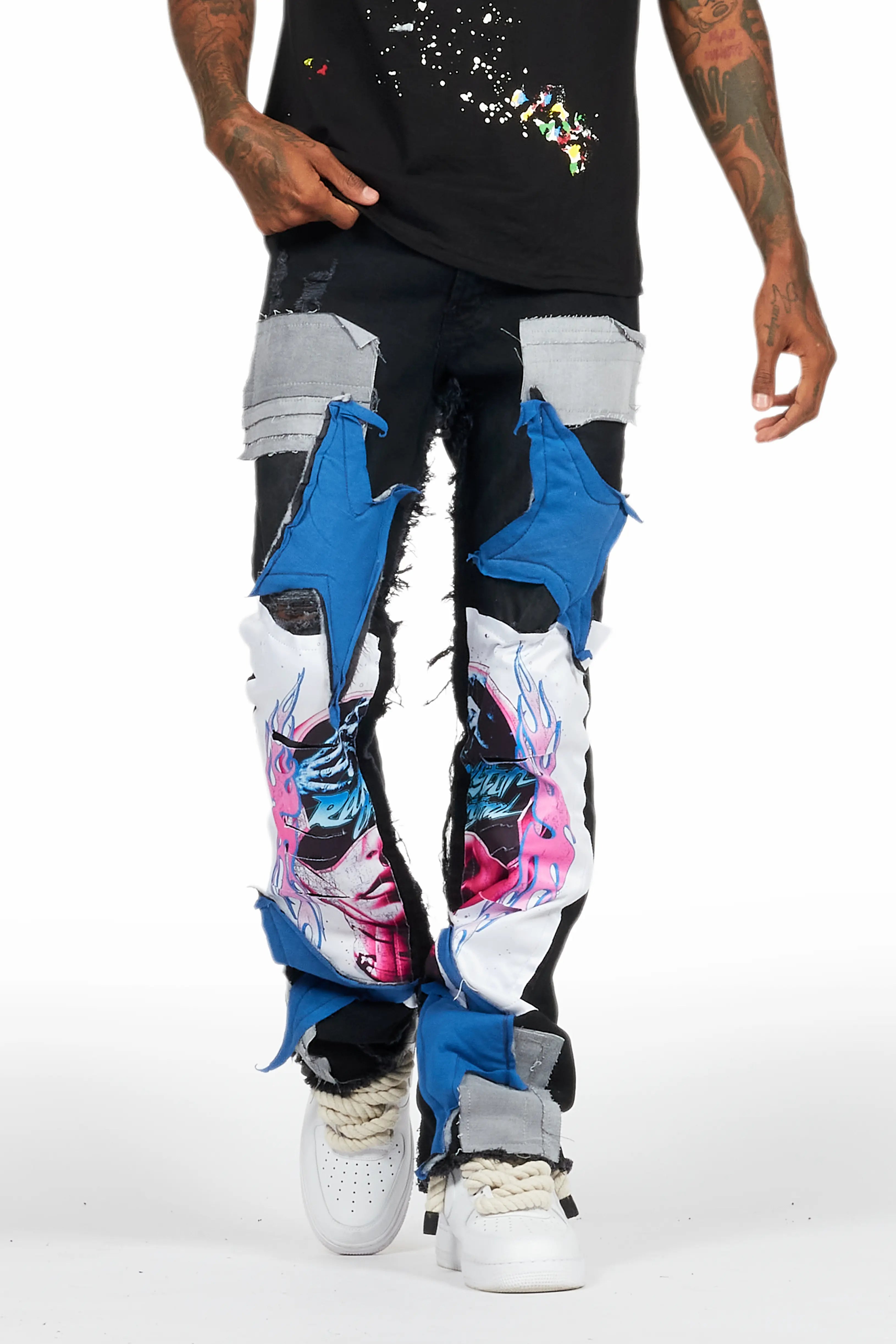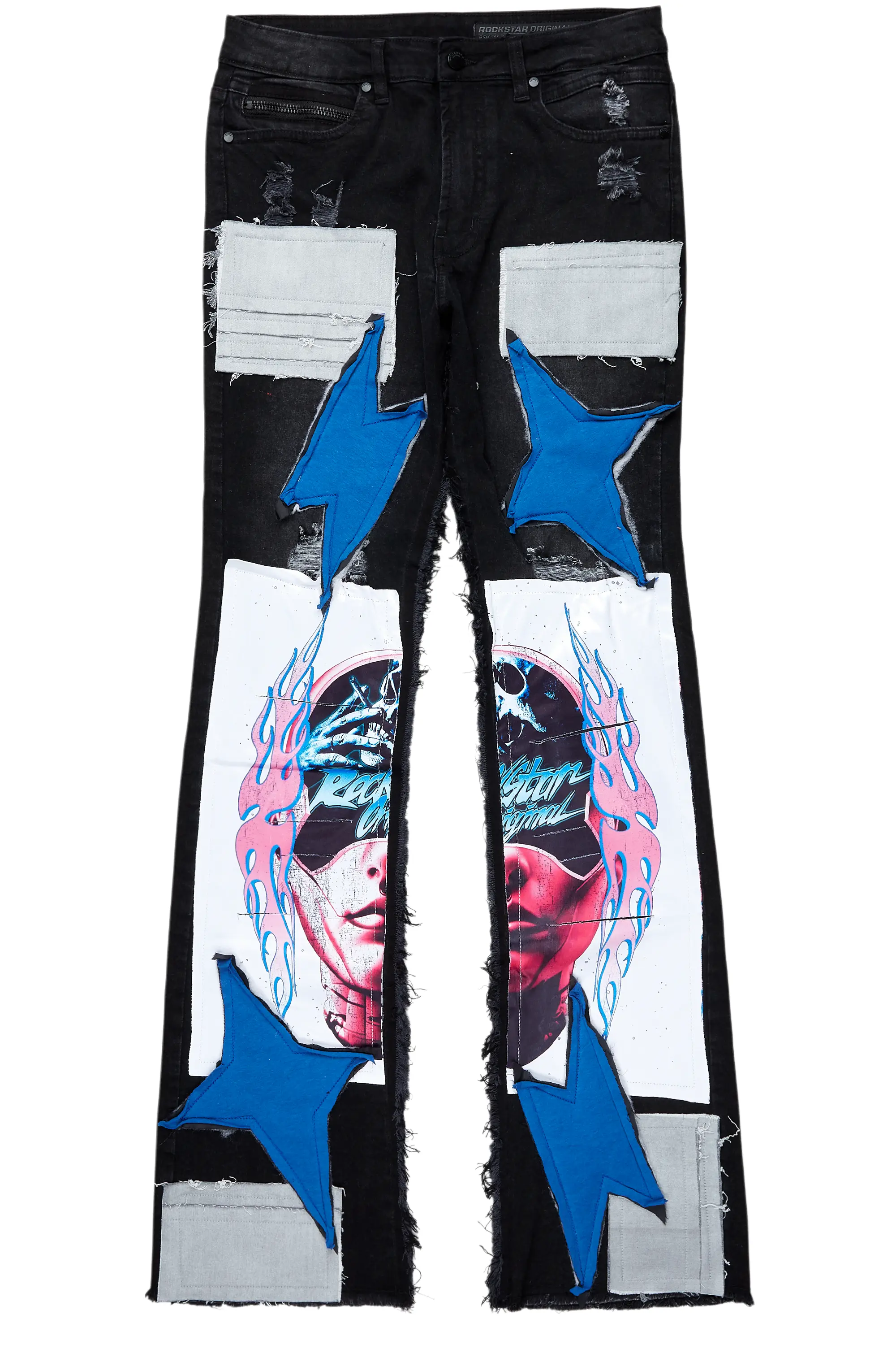Helios Blue Patchwork Stacked Flare Jean