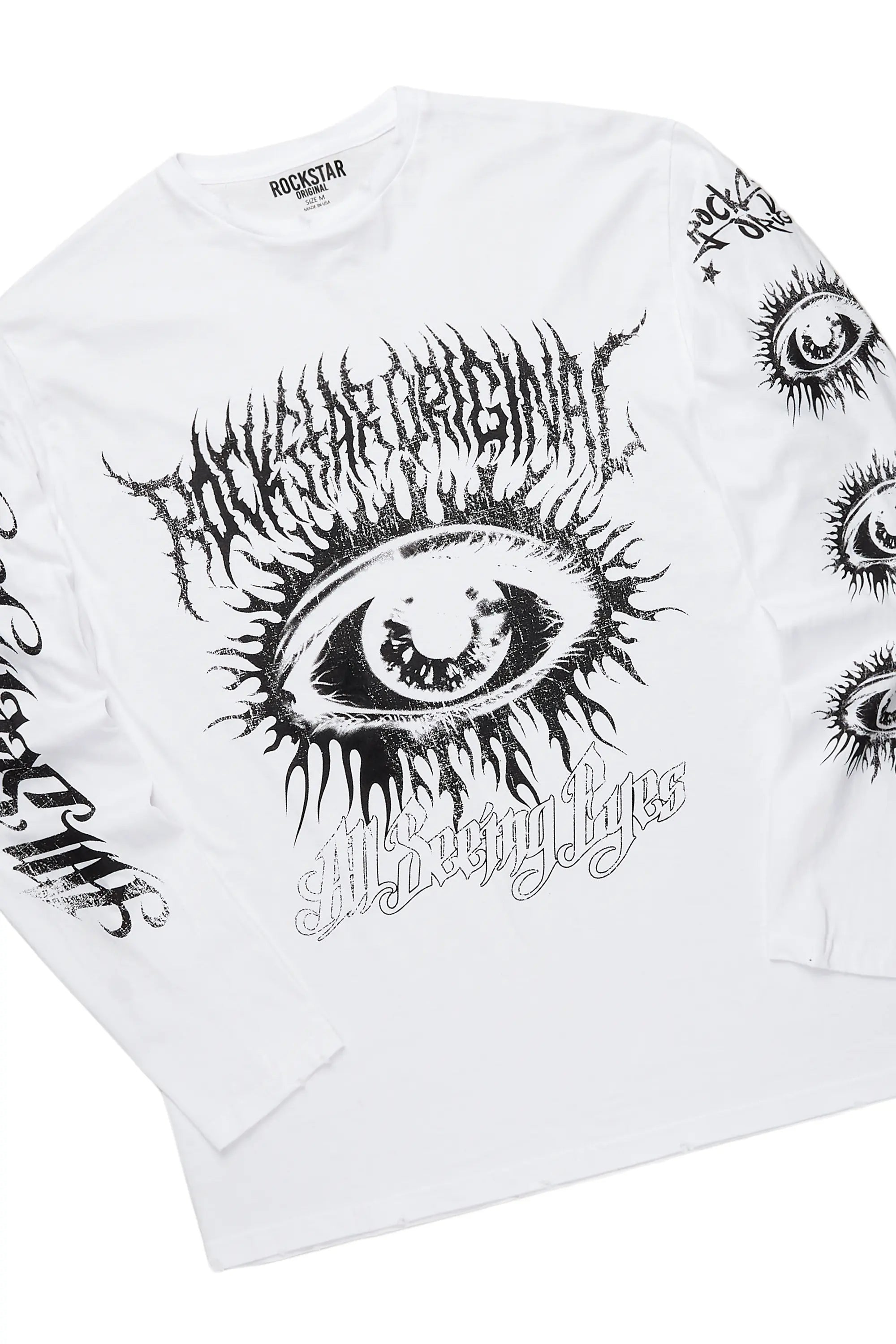 All Seeing Eyes White Long Sleeve T-Shirt & Merrik Stacked Flare Jean Bundle
