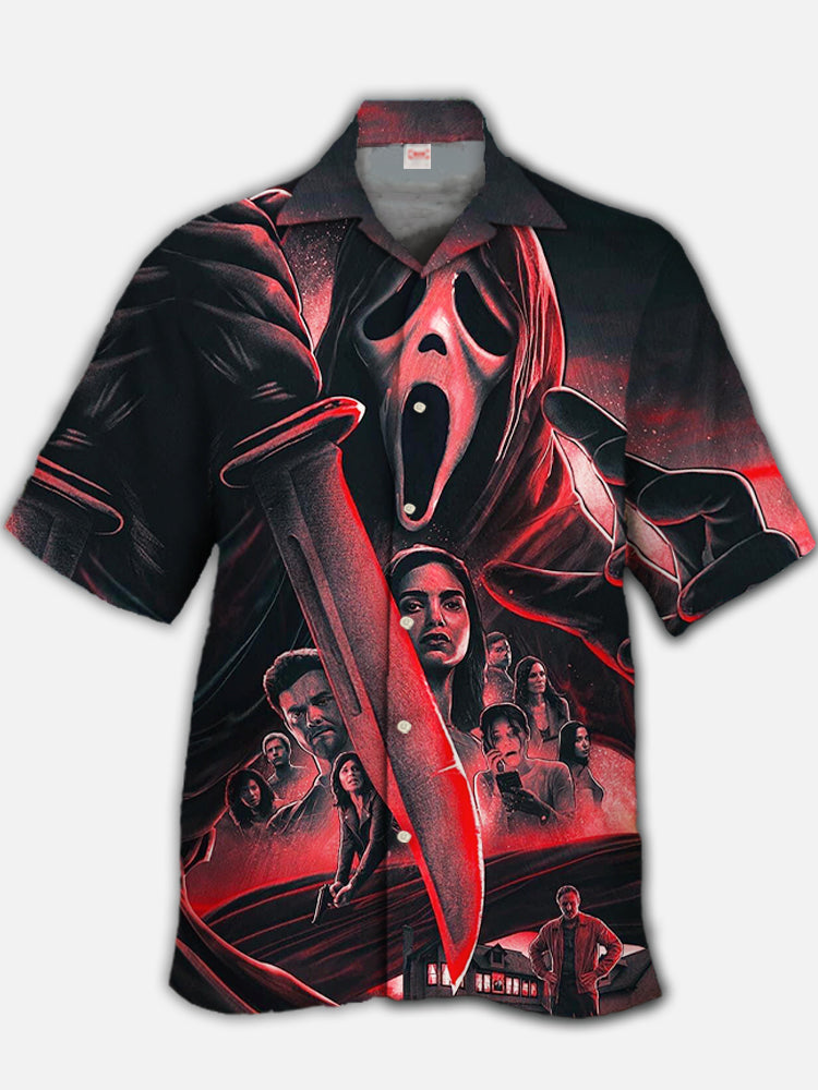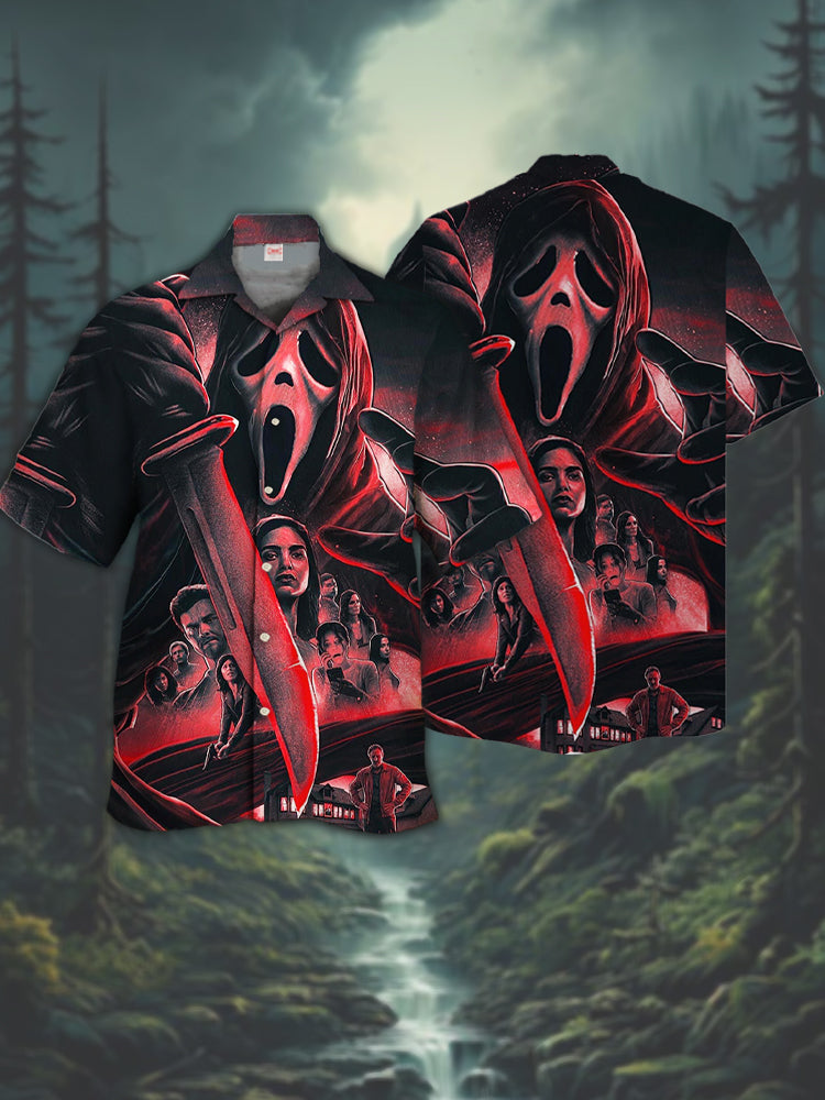 • Eye-Catching Big Ghost with Knife Scarry Characters People Printing Cuban Collar Hawaiian Short Sleeve Shirt