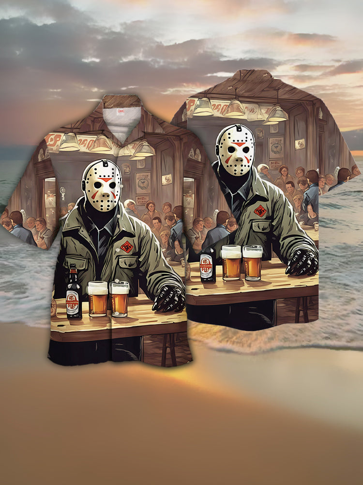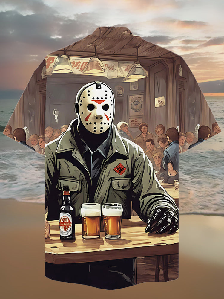 • Eye-Catching Retro Bar Horror Character Drinking Sparkling Water Printing Cuban Collar Hawaiian Short Sleeve Shirt